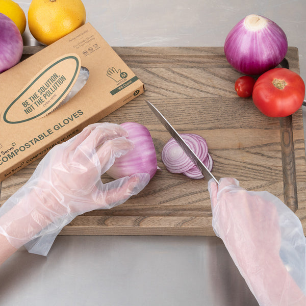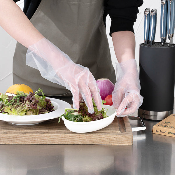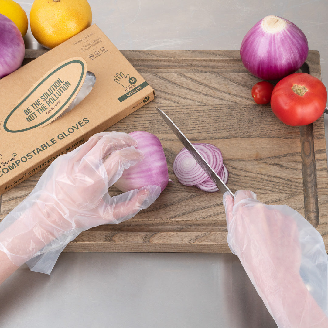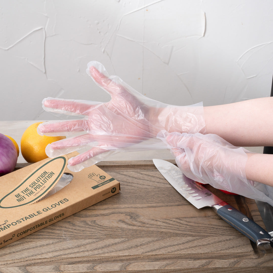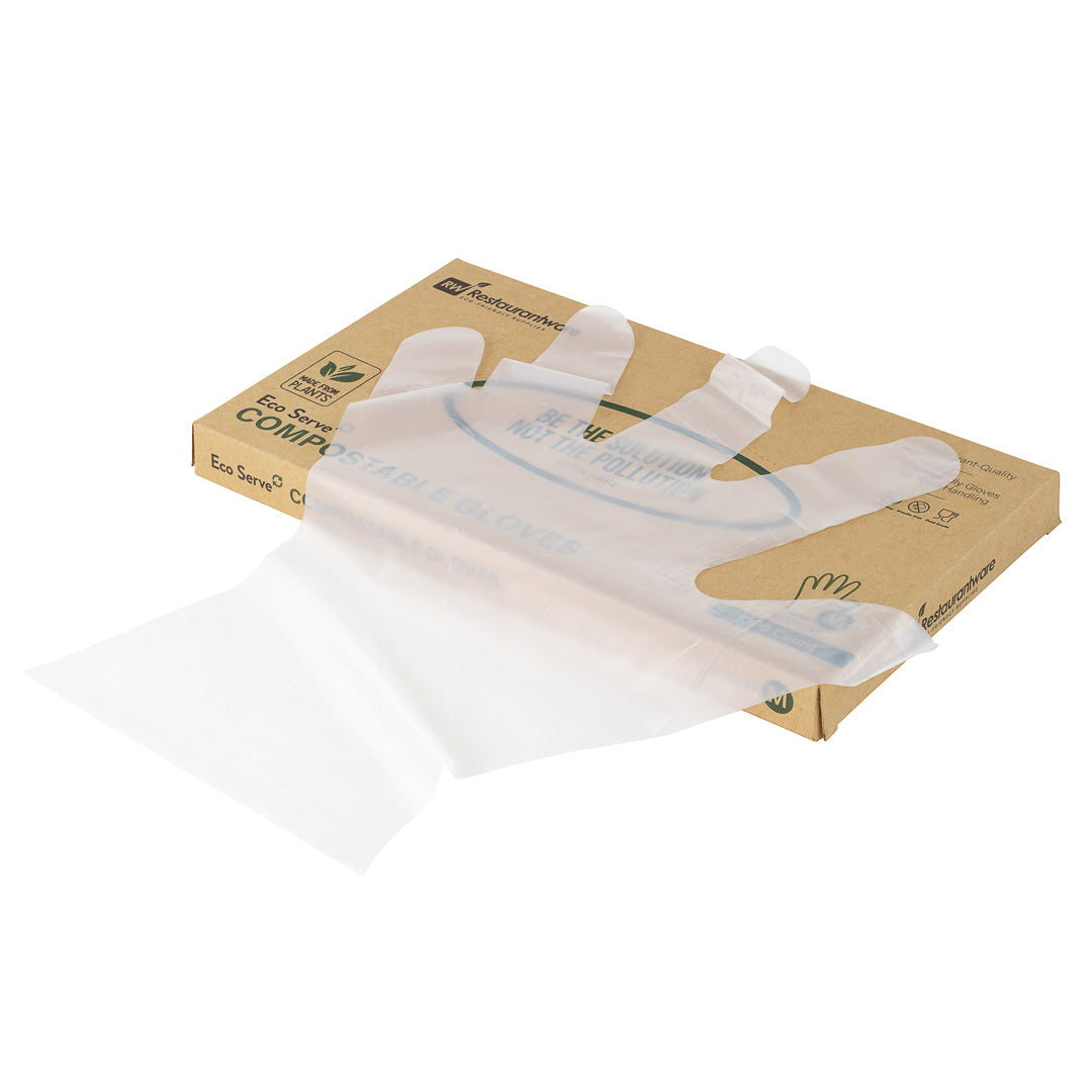Provide employees with protective gear while preparing meals using our Eco Serve Clear Plastic Medium Compostable Gloves. Made from plant-based plastic that is derived from cornstarch, these gloves are commercially compostable for an eco-friendly way to dispose of gloves after use. Perfect for providing comfort while handling food, these medium gloves are powder-free to prevent gloves from leaving any residue on hands. These plastic gloves feature a clear finish and are a size medium to perfectly fit the hands of most of your employees. Each glove measures 11 inches in length and 9 inches in width. Shipped in a 100 count box. Keep gloves away from excessive heat to maintain their appearance.