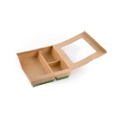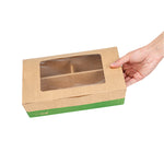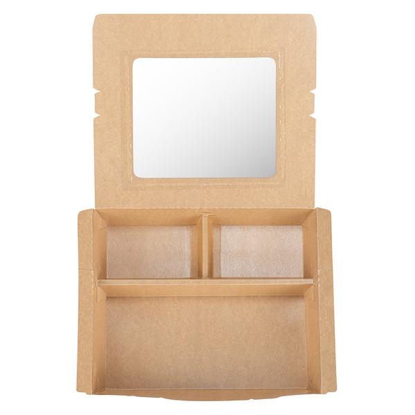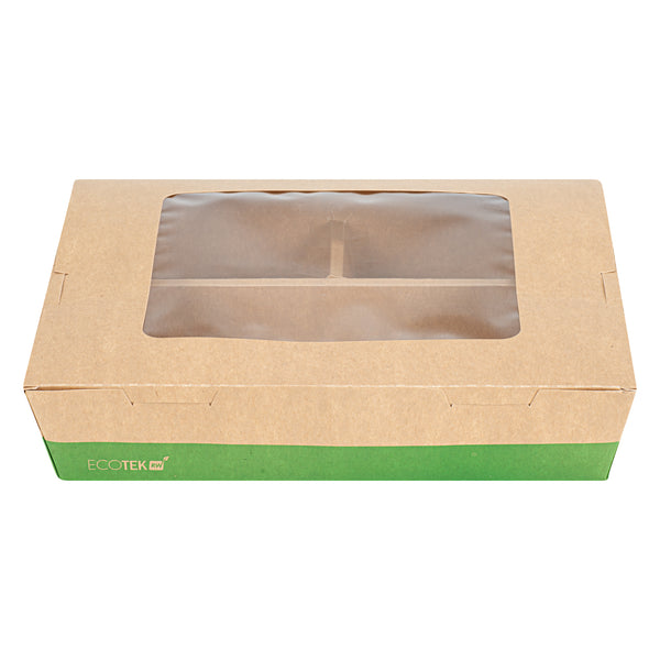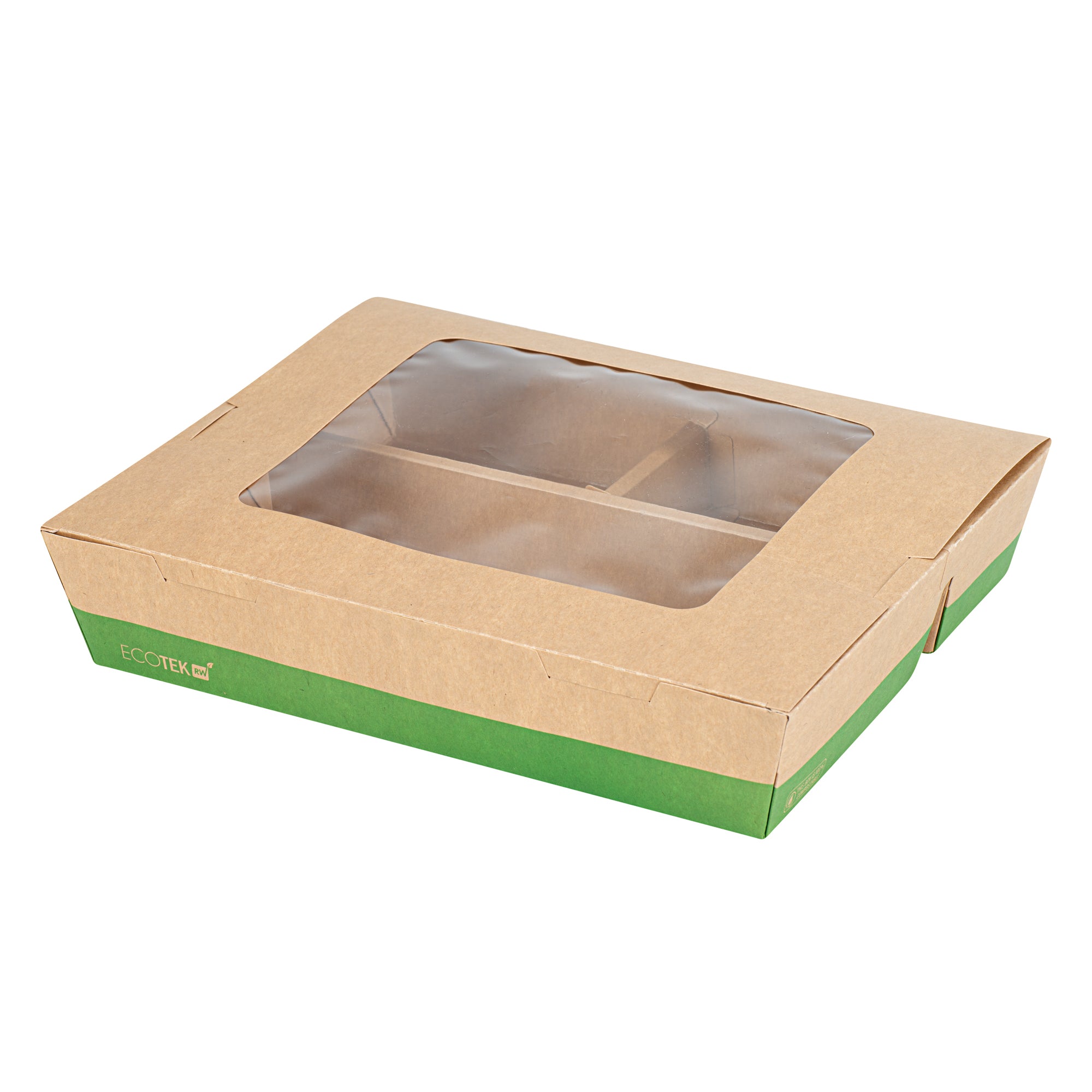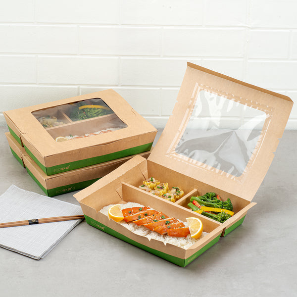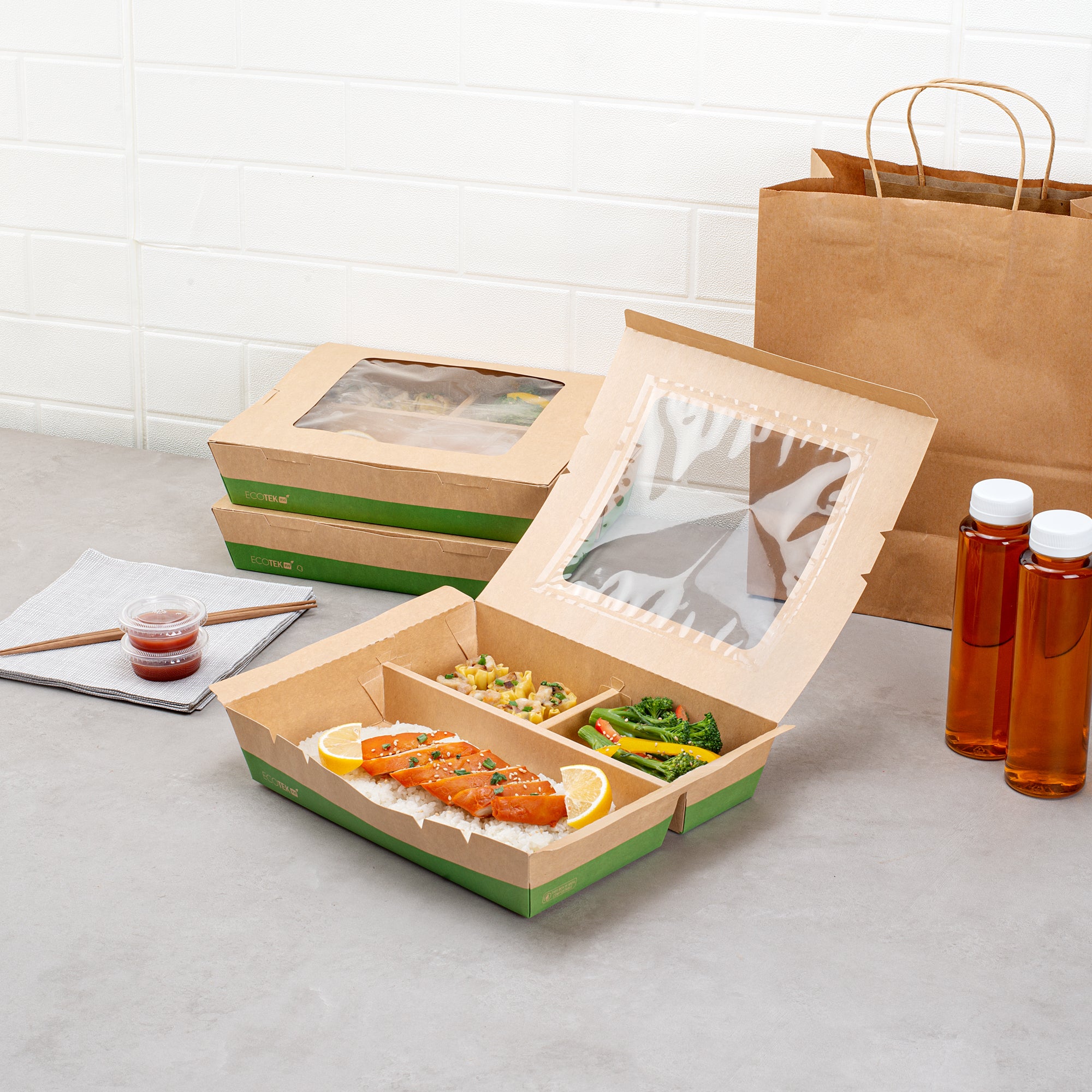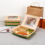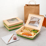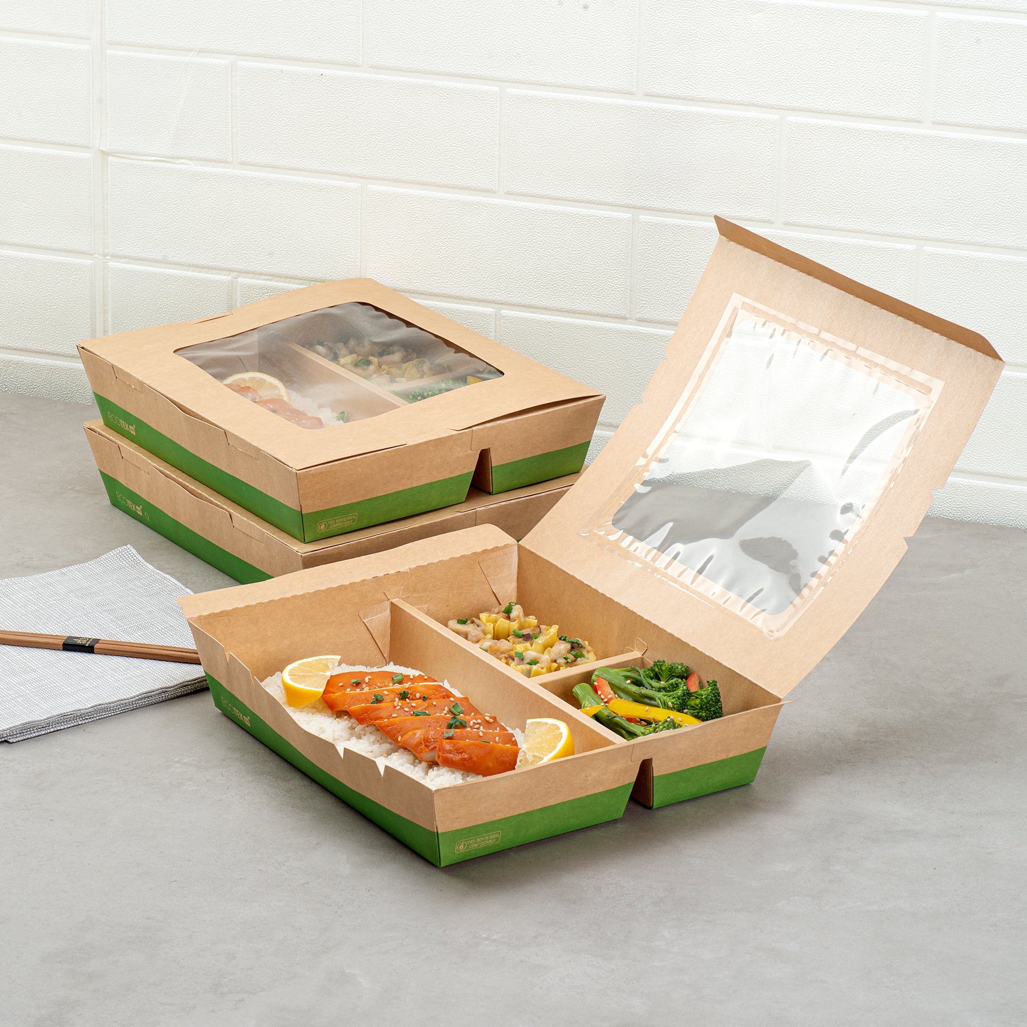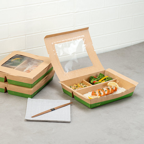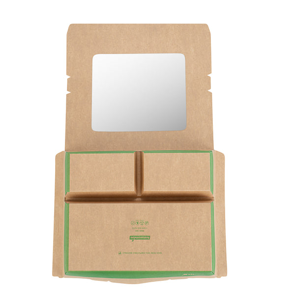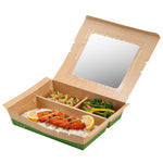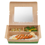 78 OZ KRAFT AND GREEN PAPER BENTO BOX - WITH PLA WINDOW, 3-COMPARTMENT