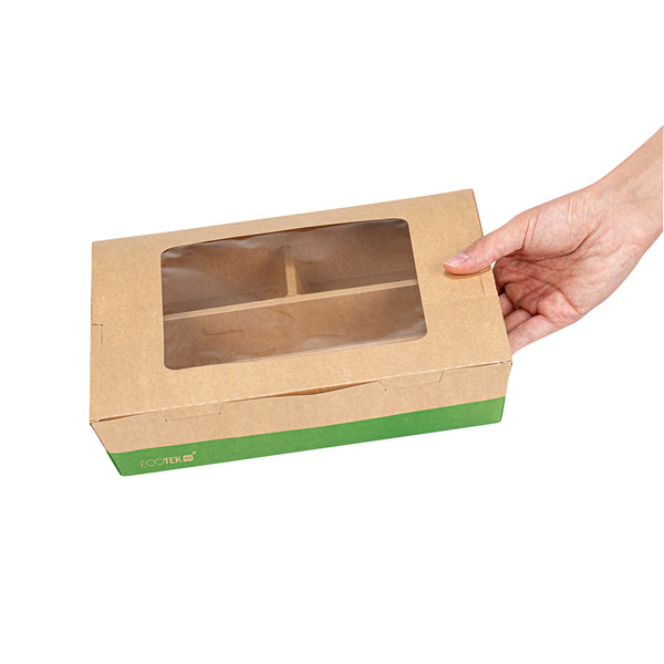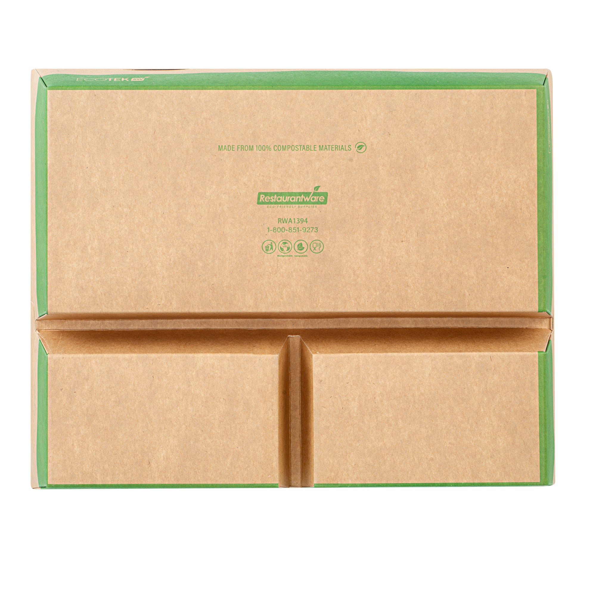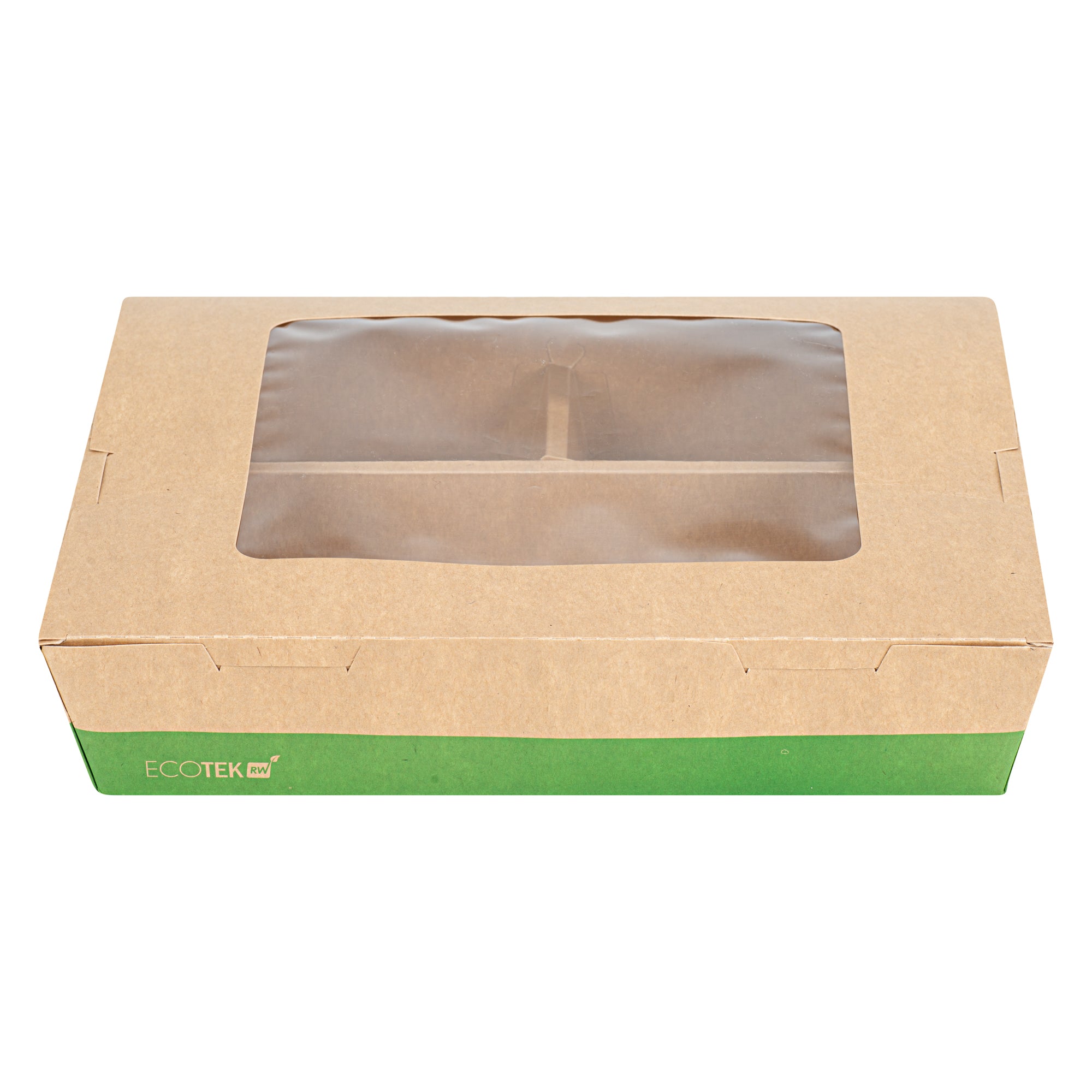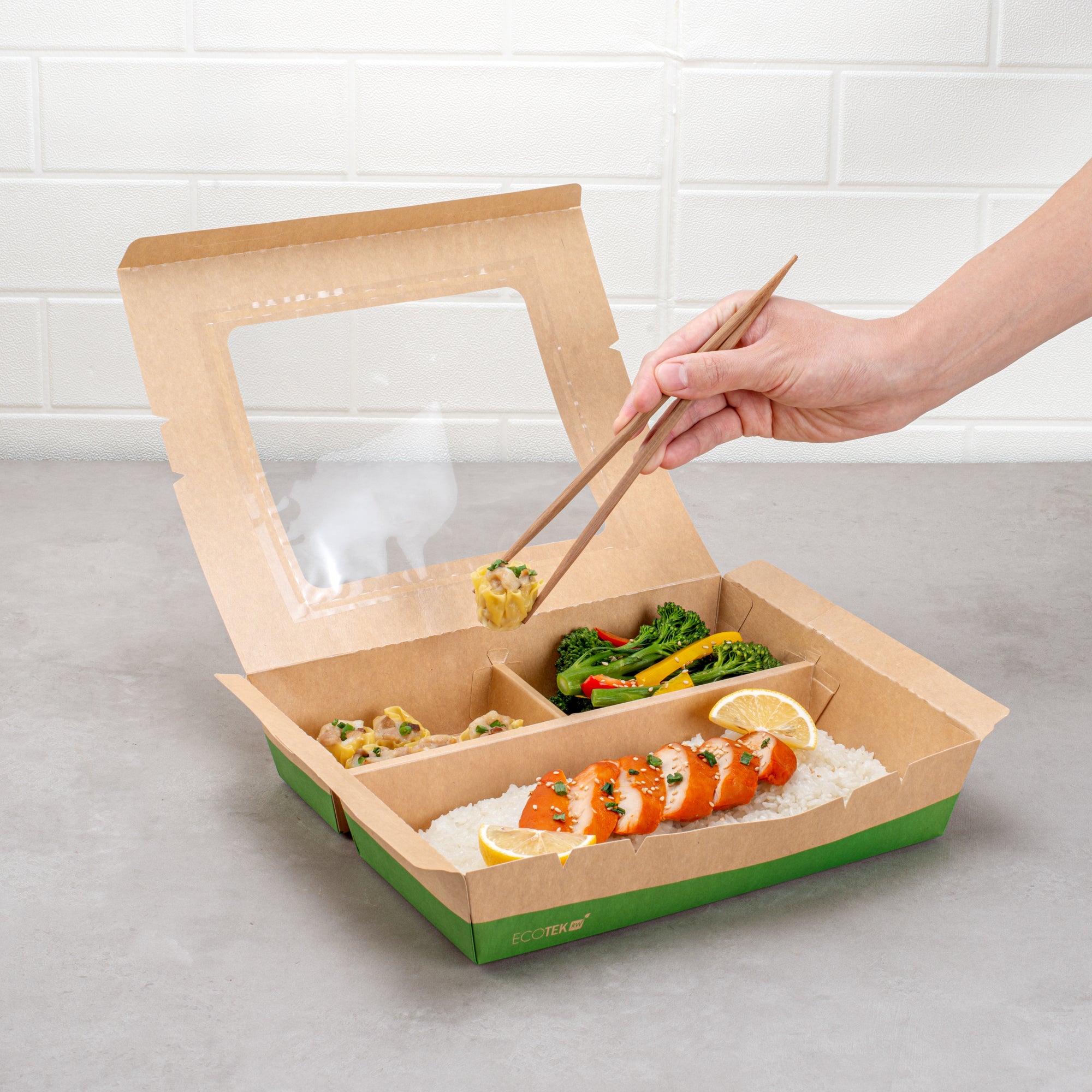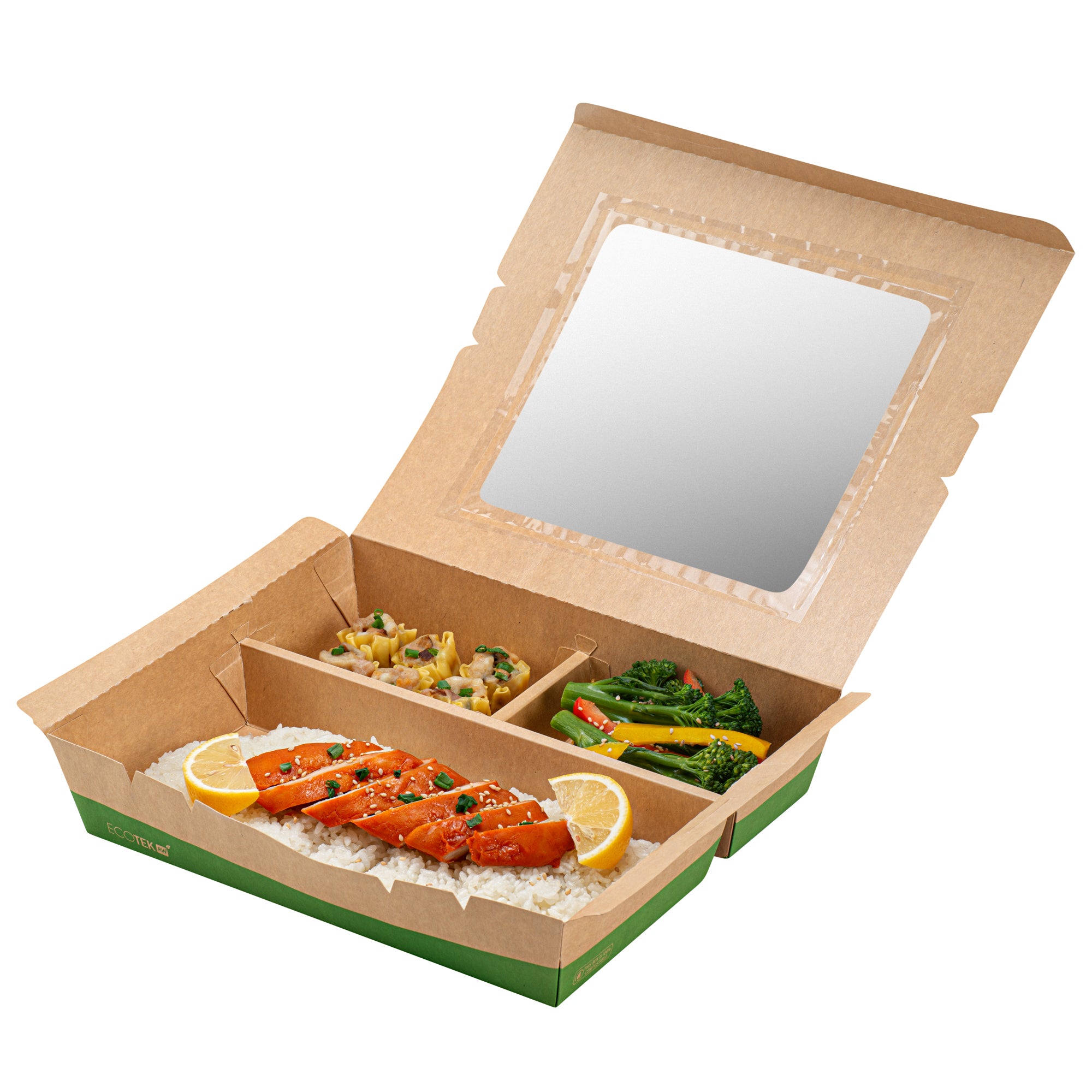 Streamline your meal service with organized and sustainable packaging. The Eco Tek 3 Compartment Bento Box features a transparent PLA window that allows for quick meal identification, enhancing efficiency during busy service hours. With three distinct compartments, this kraft lunch box facilitates organized storage of a variety of dishes, ensuring meals remain neatly separated and visually appealing. Made from biodegradable and commercially compostable paper, this compostable bento box supports eco-friendly disposal, aligning with sustainable foodservice operations and reducing environmental impact. Measuring 11 inches in length, 9 inches in width, and 2 inches in height, these boxes offer ample capacity for portion control and diverse meal offerings. Elevate your food presentation and service with this reliable and eco-conscious solution. Each order includes 100 Eco Tek 3 Compartment Bento Box.