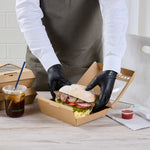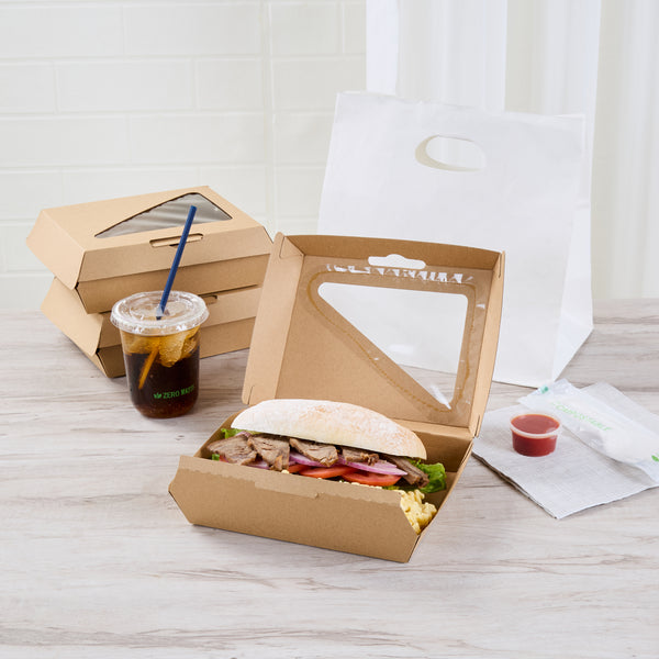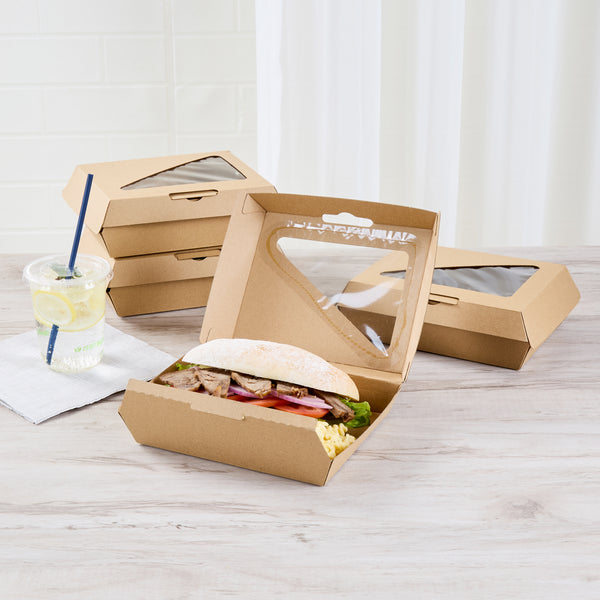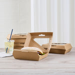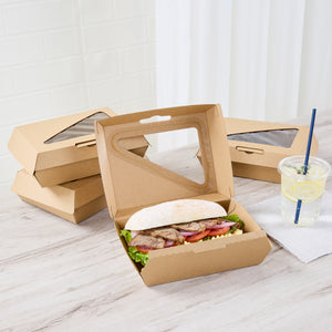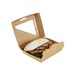 Enhance your takeout offerings with our Eco Tek Rectangle Kraft Paper Corrugated Clamshell Containers. Designed with corrugation, these clamshell boxes provide superior heat retention while their durable construction guards against crushing during transit. The thoughtfully placed side vents on these kraft clamshell boxes promote ideal air circulation, keeping your burgers, wraps, or salads as fresh as when they leave your kitchen. With a clear window on top, these clamshell cardboard boxes allow staff and customers to quickly verify orders without opening the box, speeding up service and ensuring accuracy. Additionally, these disposable food containers stack conveniently, making storage simple and efficient. Crafted from recyclable materials, these paper clamshell containers help you uphold your sustainability goals with each use. Measuring 7.8 inches long by 5.9 inches wide by 2.75 inches high, these disposable clamshell containers are perfect for any foodservice business. Sold in a 100 count box.