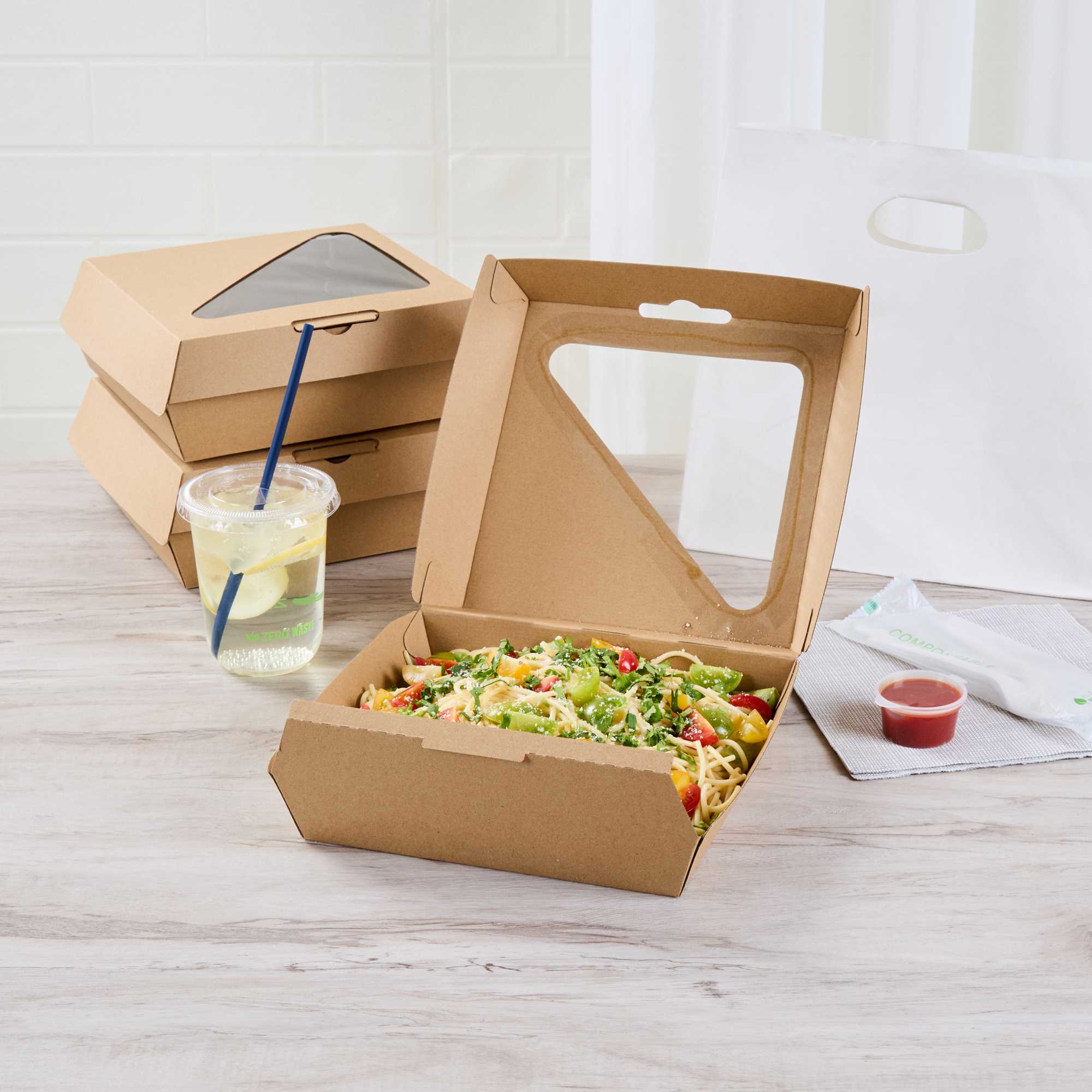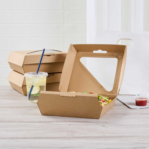 Boost your takeout service with our Eco Tek Rectangle Kraft Paper Corrugated Clamshell Containers. Featuring a corrugated design, these clamshell boxes retain heat effectively while their sturdy construction avoids being crushed during delivery. The strategically placed side vents on these kraft clamshell boxes ensure proper air circulation, so your burgers, wraps, or salads stay as fresh as when they were prepared. Equipped with a clear window on top, these clamshell cardboard boxes let staff and customers quickly check orders without needing to open the container, improving service speed and order accuracy. These disposable food containers also nest easily, making storage effortless and efficient. Made from recyclable materials, these paper clamshell containers reinforce your sustainable practices with every use. Measuring 8 inches long, 8 inches wide, and 3.3 inches high, these disposable clamshell containers are ideal for any foodservice operation. Sold in a 50 count box.