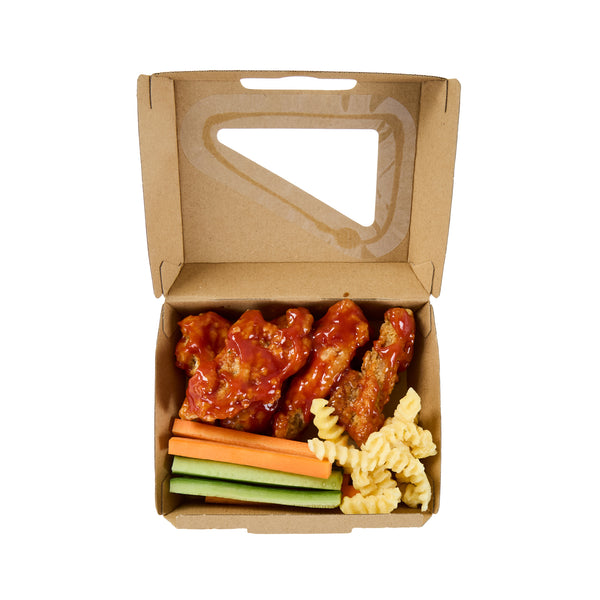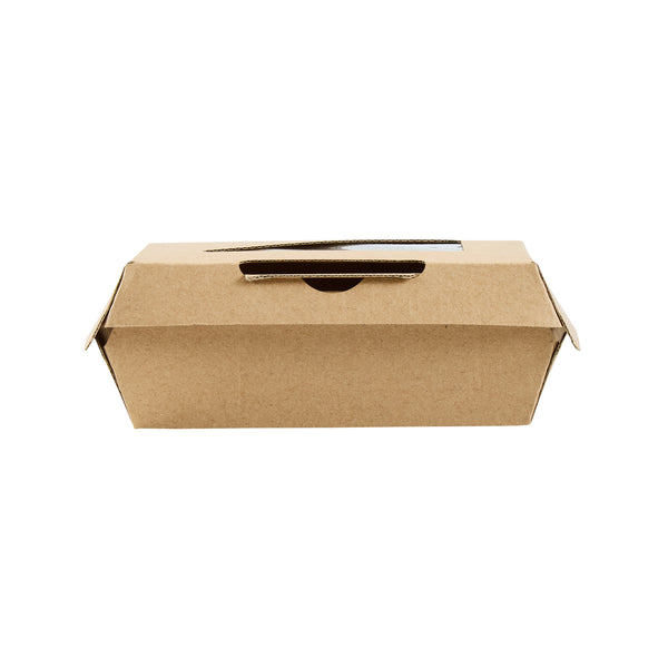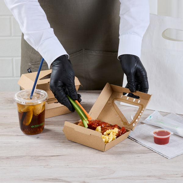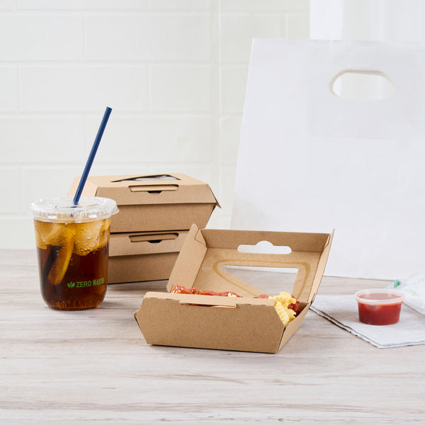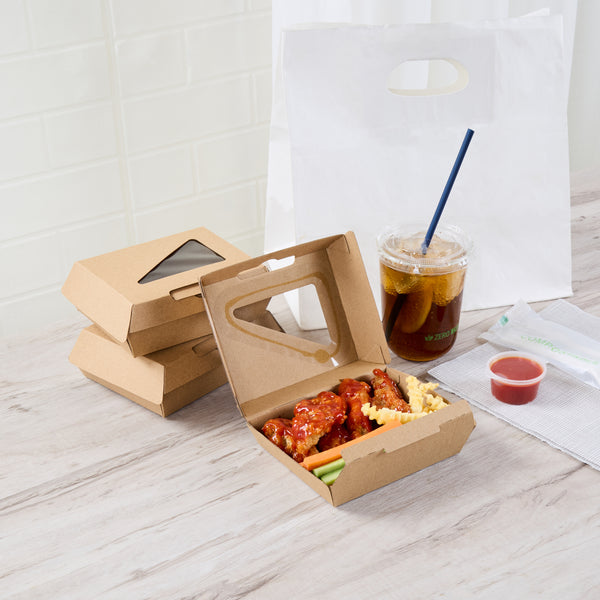 Ensure your takeout orders arrive fresh and intact with our innovative corrugated takeout container. The Eco Tek Greaseproof Corrugated Takeout Container offers a sturdy corrugated paper construction that resists crushing, helping retain the temperature and quality of your meals. Featuring a kraft clamshell container design with built-in side vents, it prevents moisture buildup to maintain the crispness of fries and sandwiches. The clear PLA window provides quick order identification, reducing errors during busy service times, and the nestable design maximizes storage space in crowded kitchens. This clamshell to-go box is perfect for quick-service restaurants, offering a greaseproof interior that retains heat and freshness. Made from compostable materials, it supports eco-friendly operations and is freezer-safe, making it versatile for both hot and cold food service. Enhance your sustainable packaging solutions today with this biodegradable container. Each order includes 100 Eco Tek Greaseproof Corrugated Takeout Containers.