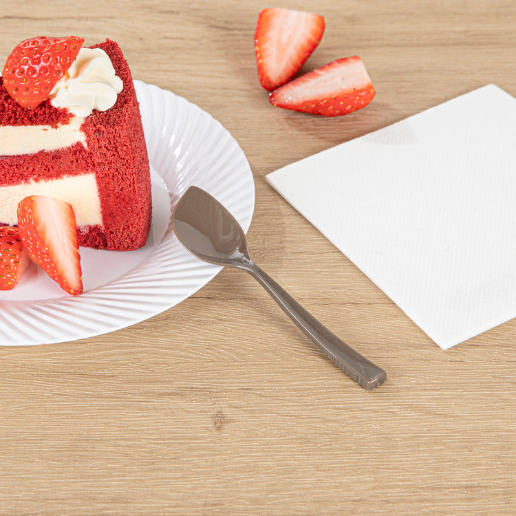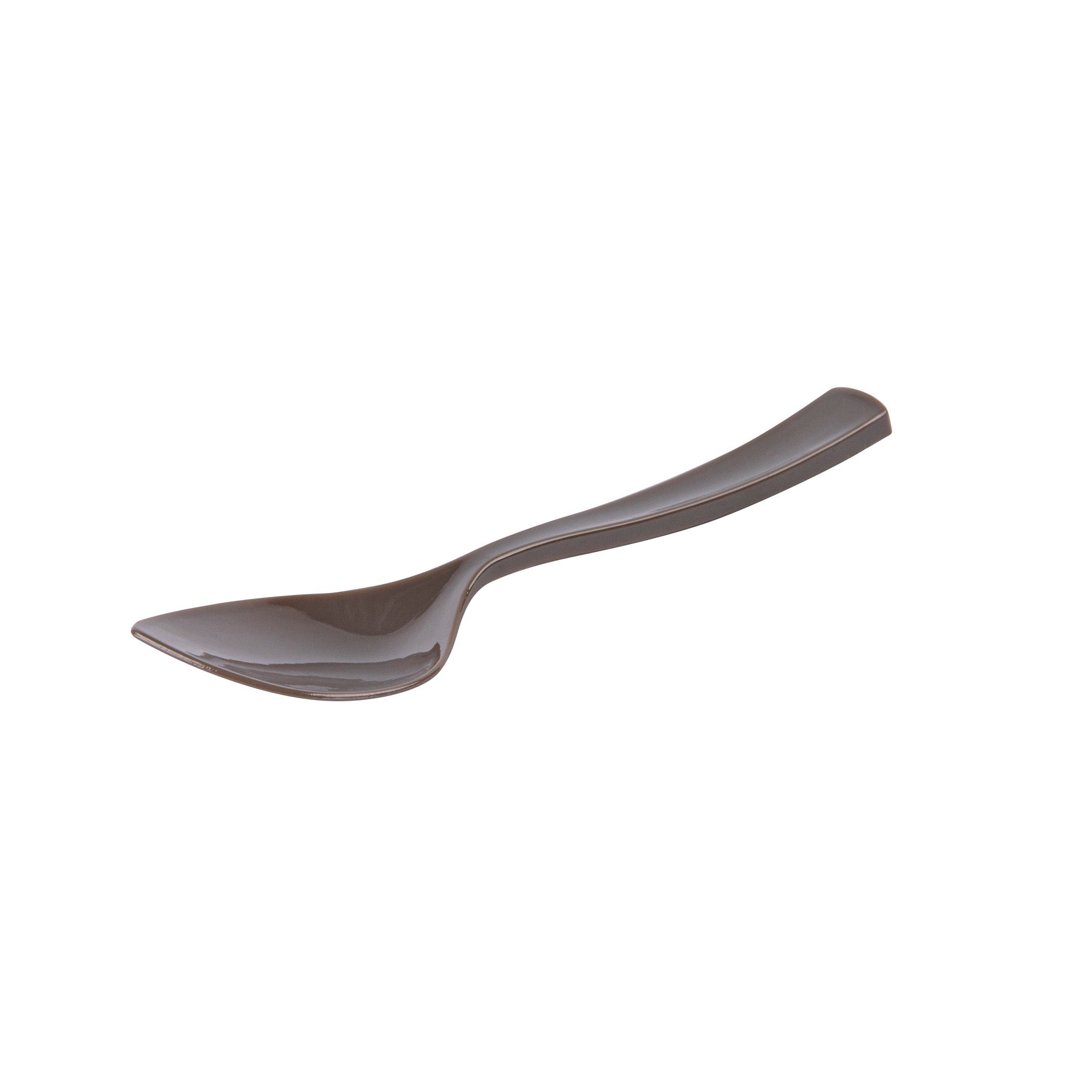 Offer a stylish solution for your bite-sized confectionary presentation with our Coppetta Fashion Gray Plastic Petal Spoons. Crafted from high-quality plastic, these frozen yogurt spoons boast exceptional durability, avoiding them from bending or breaking with ease. The robust and sturdy handles of these disposable spoons facilitate effortless scooping of tightly packed gelato or towering servings of icy sorbet. These dessert spoons have a distinctive angled design that ensure your customers can savor every delectable bite effortlessly. Adorned with a subtle gray hue, these cake spoons add a delightful touch to large bowls of hand-scooped ice cream and cups of freshly swirled frozen yogurt. These plastic spoons measure 4.5 inches in length by 1 inch in width, making them ideal for serving alongside all types of frozen treats and delectable desserts. Shipped in a 100 count box.