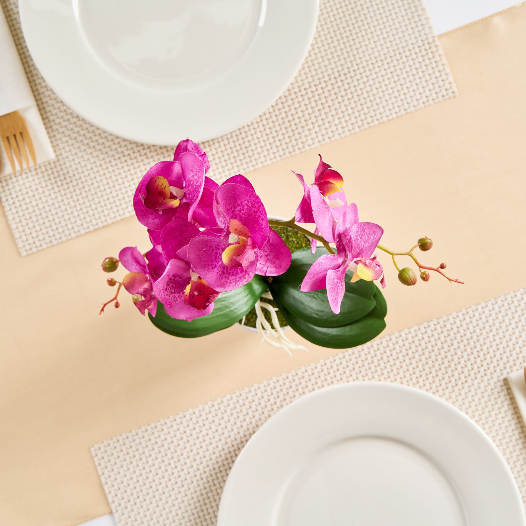 - Realistic magenta orchids have long stems and buds for an authentic look