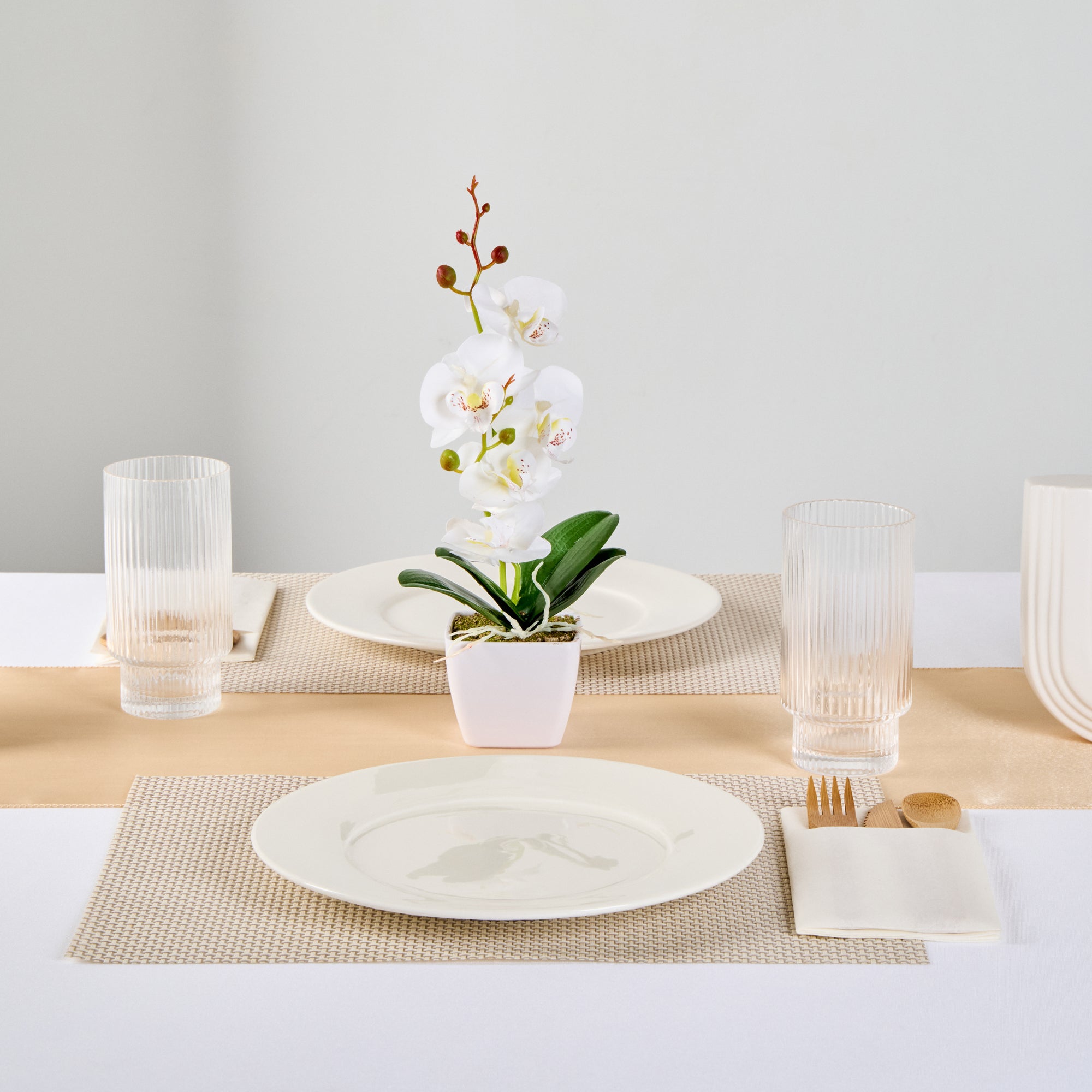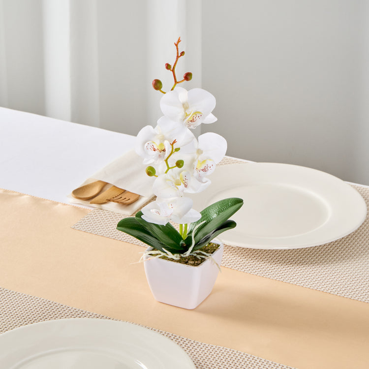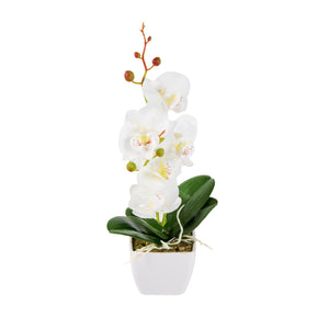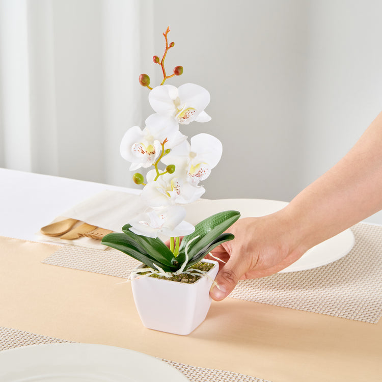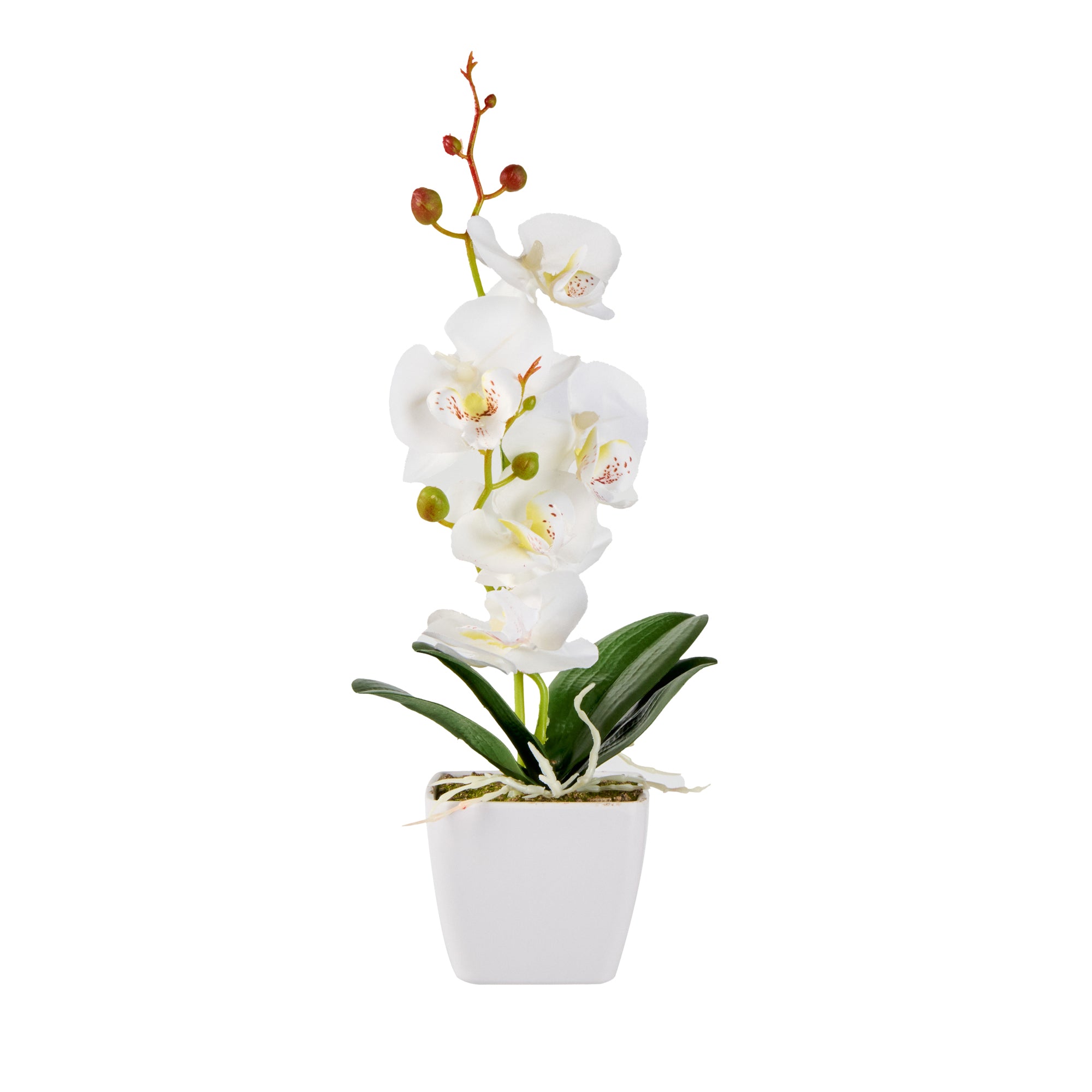 - Realistic white orchids have long stems and buds for an authentic look