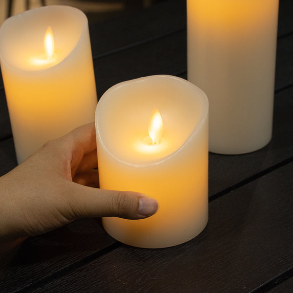 Add ambient lighting to your charming tablescape using our Fire Tek White Plastic Flameless Pillar Candles. Perfect for restaurants and catering events, these battery-powered candles mimic the warm glow of candlelight without the use of a lit flame. Crafted with high-quality paraffin wax, these battery-powered candles with a plastic base are built for long-lasting use, unlike typical wick candles. These battery-powered candles can be programmed to a timer to light up at your preferred time of day or night with our remote control (SKU: RWT0610). This charming candle also has a switch on its plastic base, providing you with an easy way to turn it on and off after use. These fake candles are designed to look like a melting candle, have a white finish, and feature a flickering flame to add an elegant touch to any centerpiece or table arrangement. For an added layer of protection against scratches or dents, these flicking candles come wrapped in plastic. Measuring 3.25 inches in length by 3.25 in diameter by 4 inches in height, these candles require 3 AAA batteries to operate. These flickering candles are available in a 10 count box. Batteries not included. Remote control is available and sold separately.