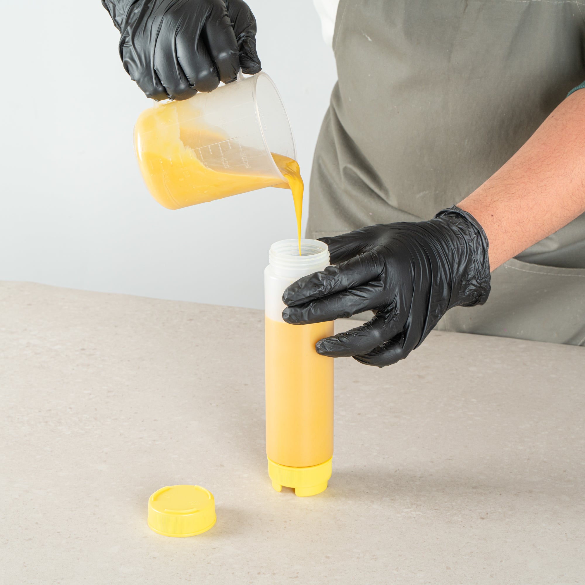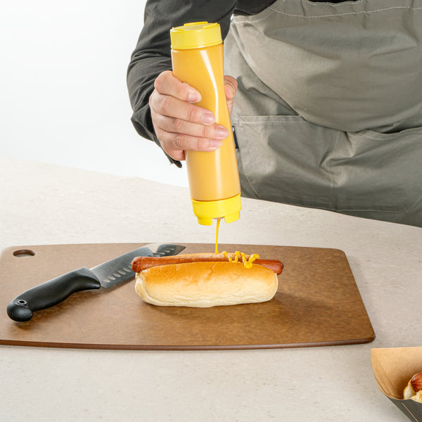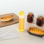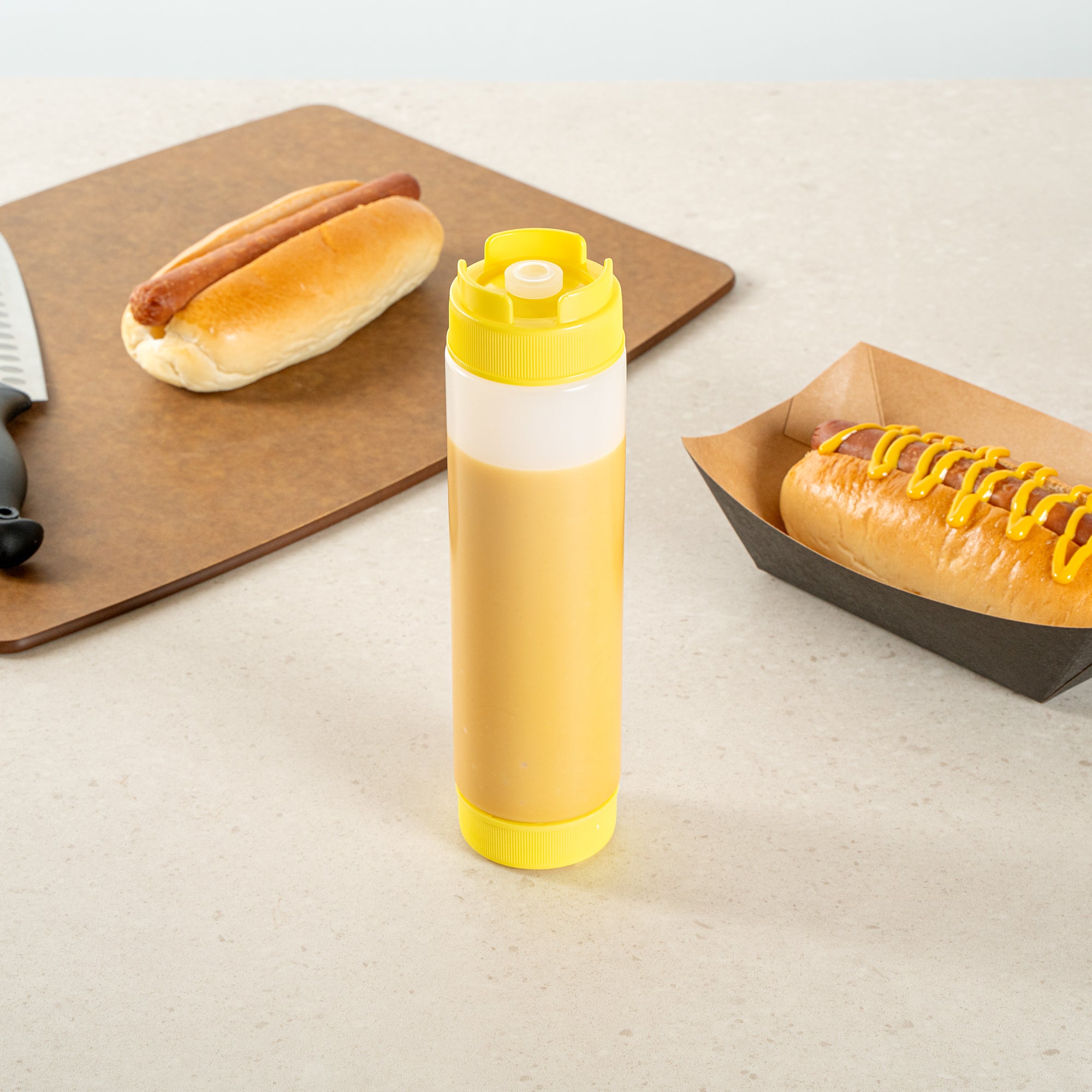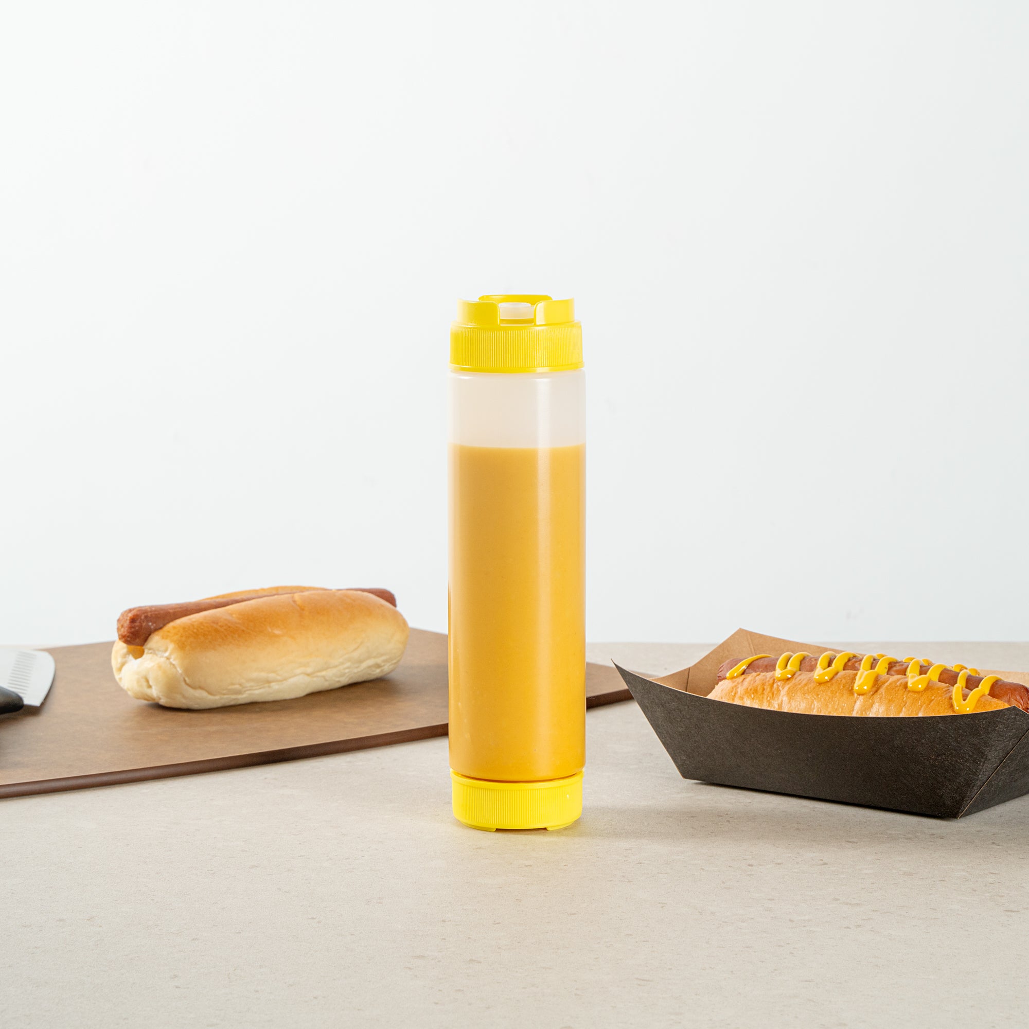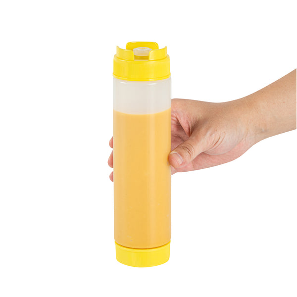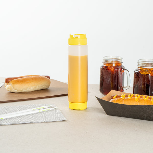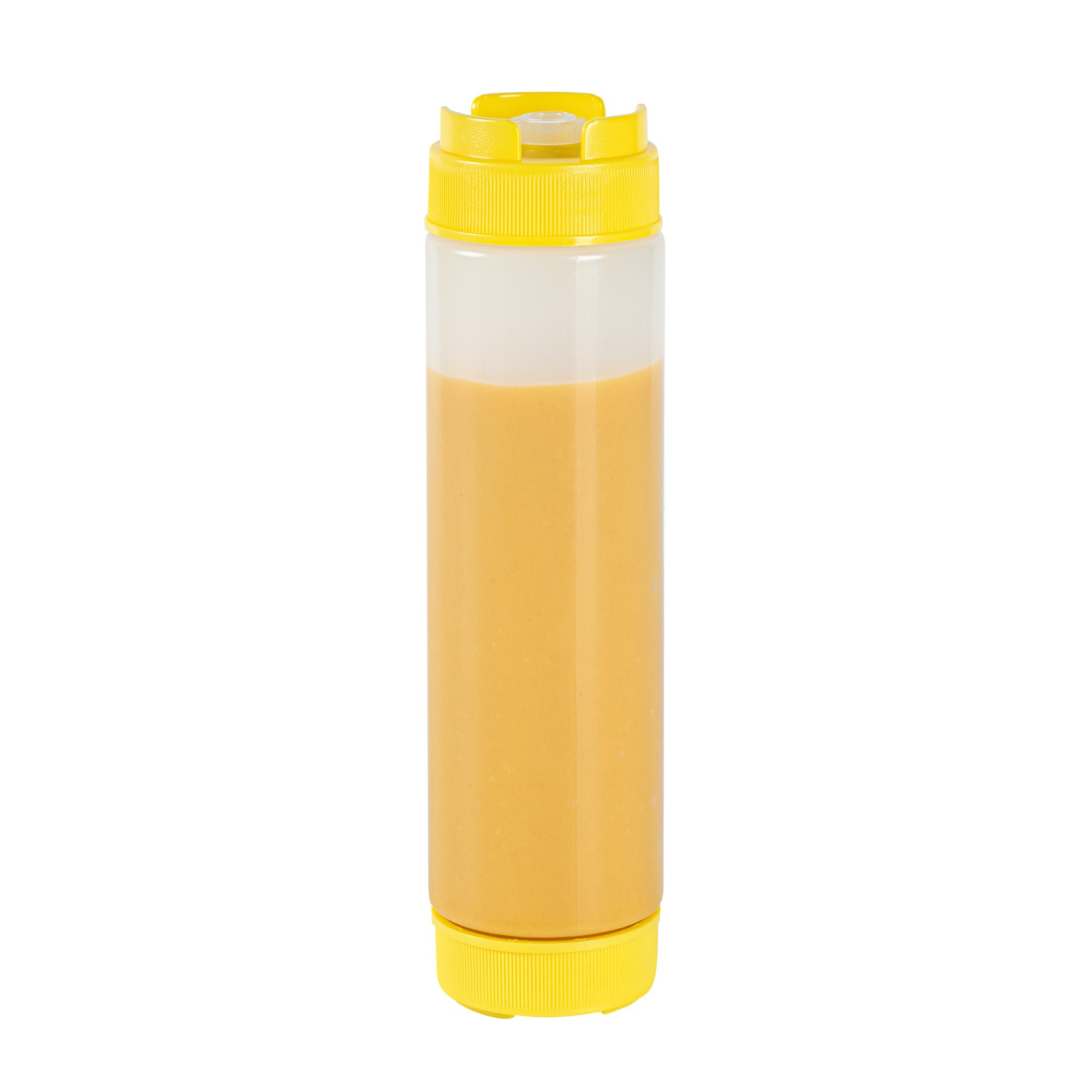 Experience the ultimate in condiment dispensing with our First In First Out 16-ounce Round Yellow Plastic Squeeze Bottle. This durable squeeze dispenser is crafted from flexible, food-grade plastic that retains its shape after every use. Featuring an innovative refillable lid, this condiment dispenser uses a 'first in, first out' design to keep your condiments consistently fresh. The inverted precision tip on this plastic squeeze bottle delivers accurate and even dispensing for precise portion control, making it apt for busy kitchens. Equipped with an automatic sealable valve, this sauce bottle opens only when squeezed, avoiding spills and ensuring no mess during use. Designed for easy maintenance, this squeeze dispenser is suitable for dishwasher cleaning. With a generous 16-ounce capacity, this refillable squeeze bottle measures 2.28 inches in diameter by 8.86 inches in height, providing ample storage for your favorite sauces and dressings. Sold in a 1 count box.
