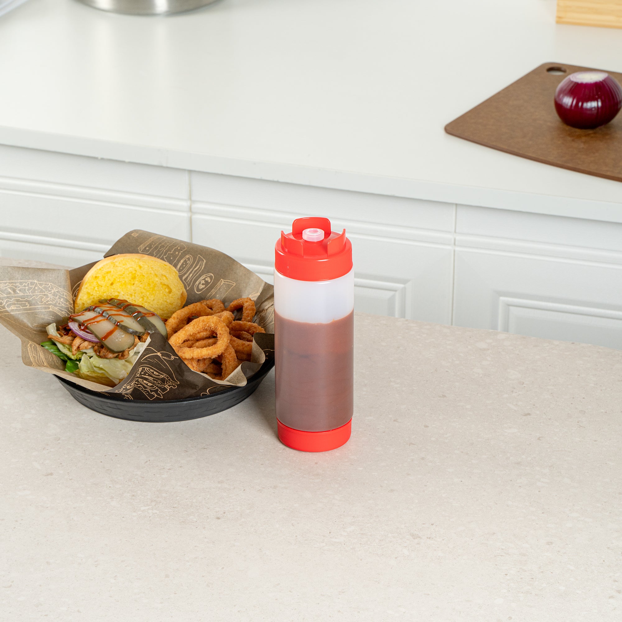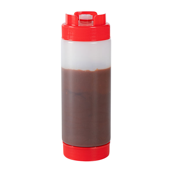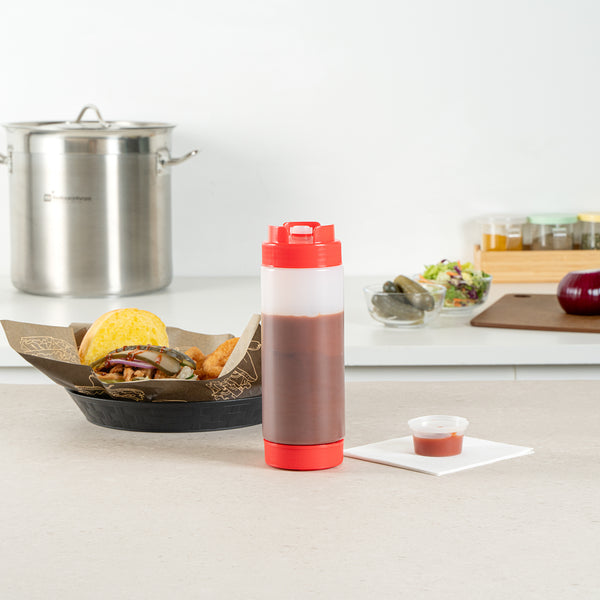 Our First In First Out 20-ounce Red Plastic Squeeze Bottle is the ultimate solution for maintaining condiment freshness and precision. Crafted from durable and food-grade plastic, this squeeze dispenser retains its shape after every use, ensuring longevity. The innovative refillable lid features a 'first in, first out' design, ensuring your sauce bottle always dispenses the freshest condiments first. With an inverted precision tip, this condiment dispenser delivers accurate and even dispensing, perfect for precise portion control. The automatic sealable valve opens only when squeezed, preventing spills and making this plastic squeeze bottle mess-free and reliable. For easy maintenance, this refillable squeeze bottle is dishwasher-safe, saving valuable time in busy kitchens. With a generous capacity of 20 ounces, this squeeze dispenser is ideal for high-volume use. Measuring 2.72 inches in diameter by 7.87 inches in height, this sauce bottle is compact yet efficient. Sold in a 1 count box.