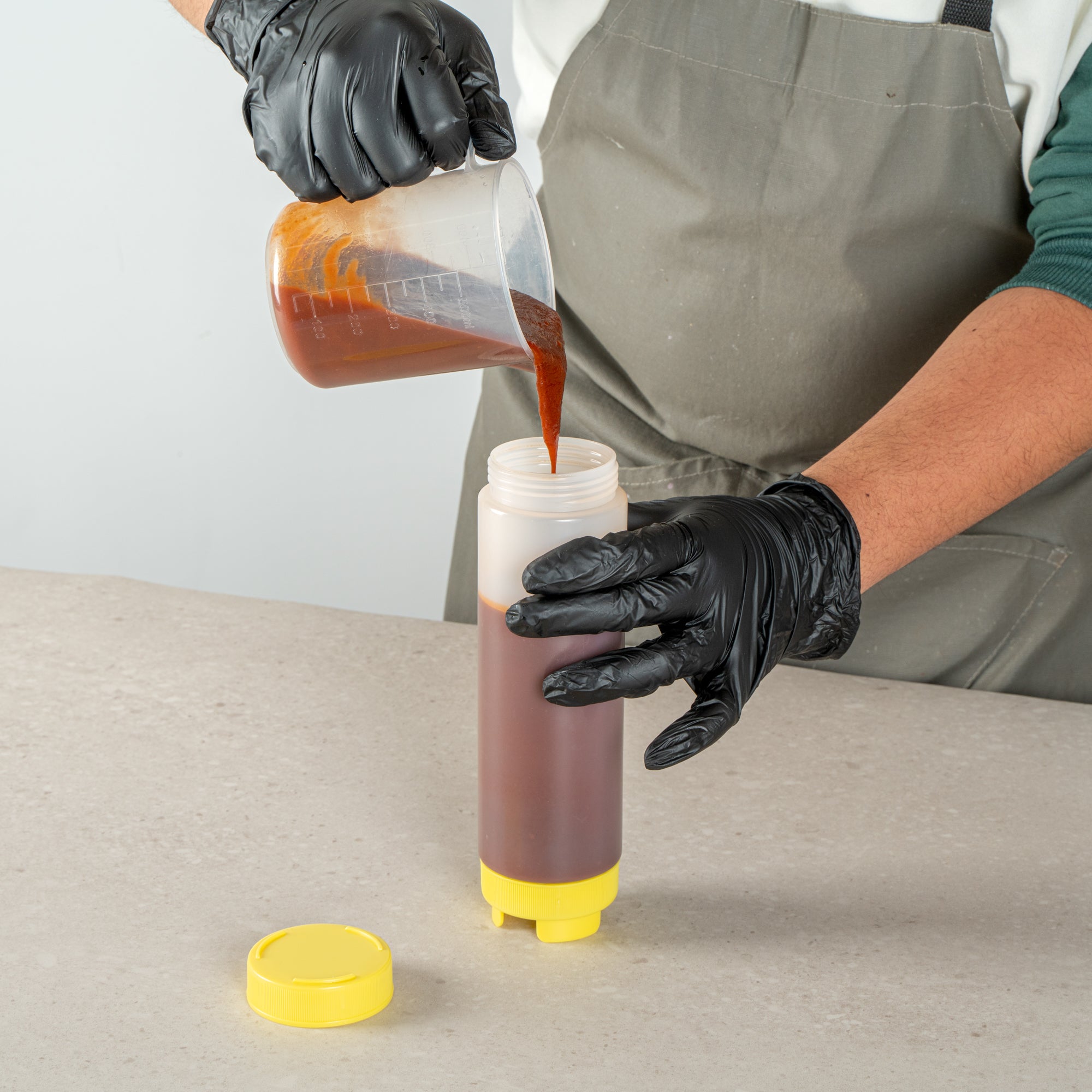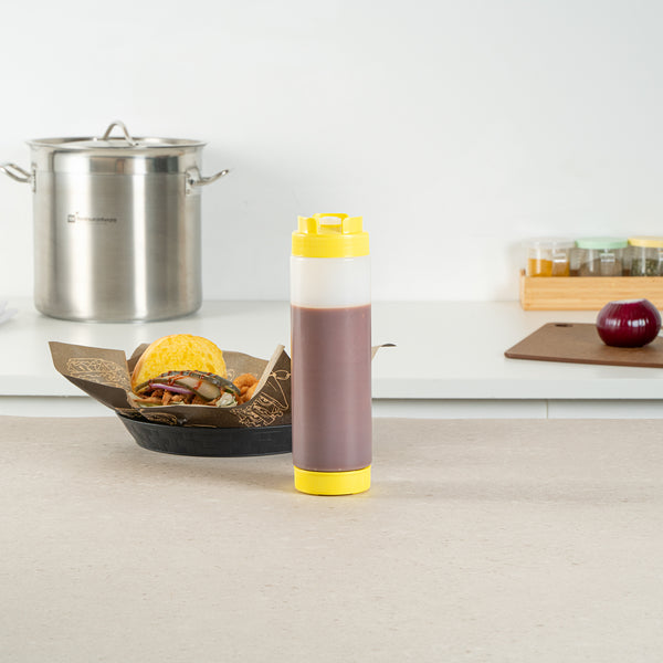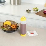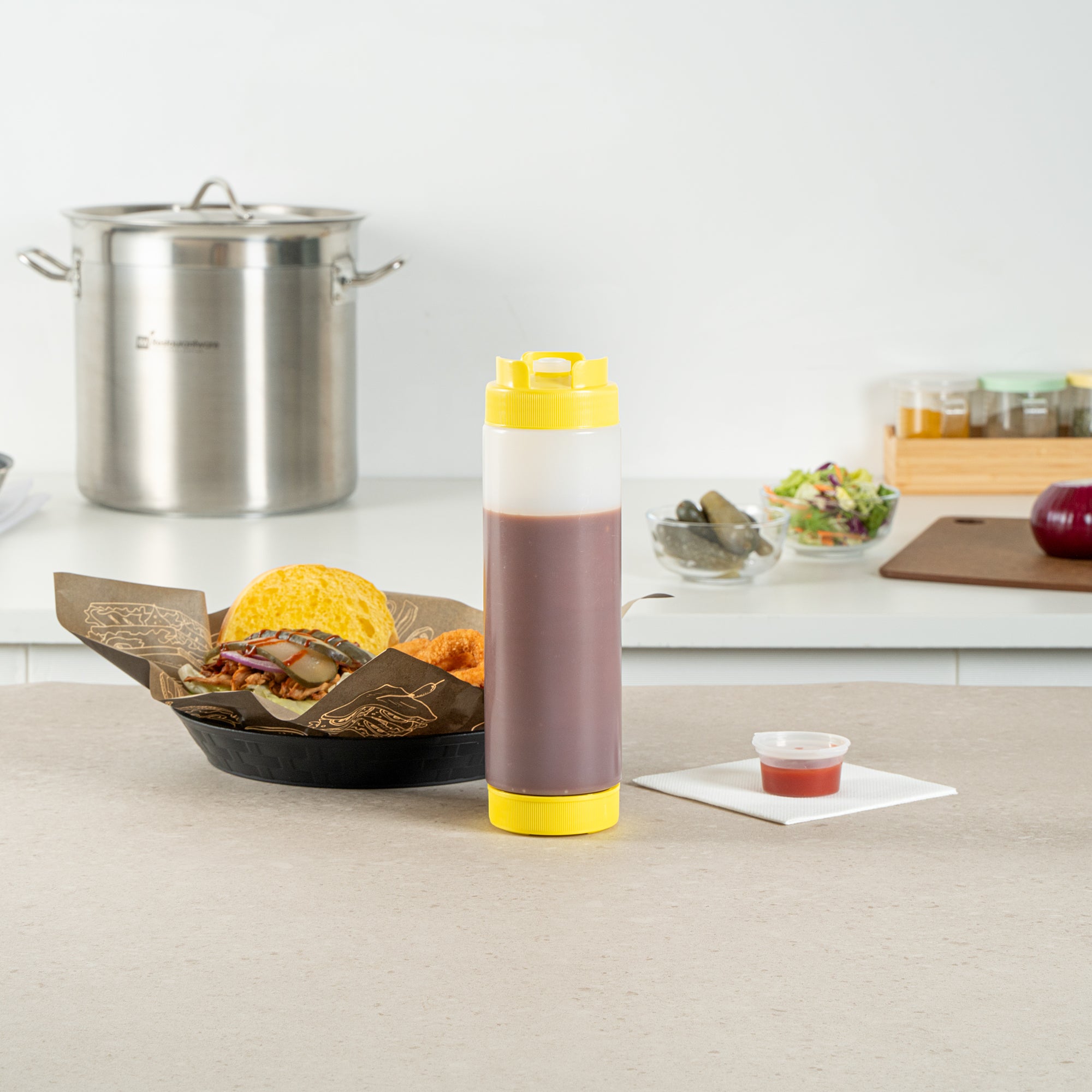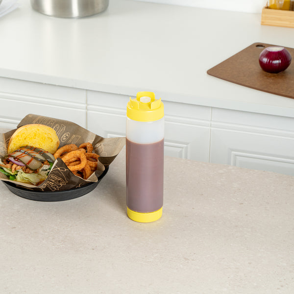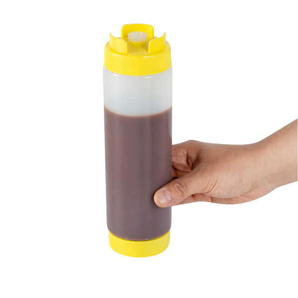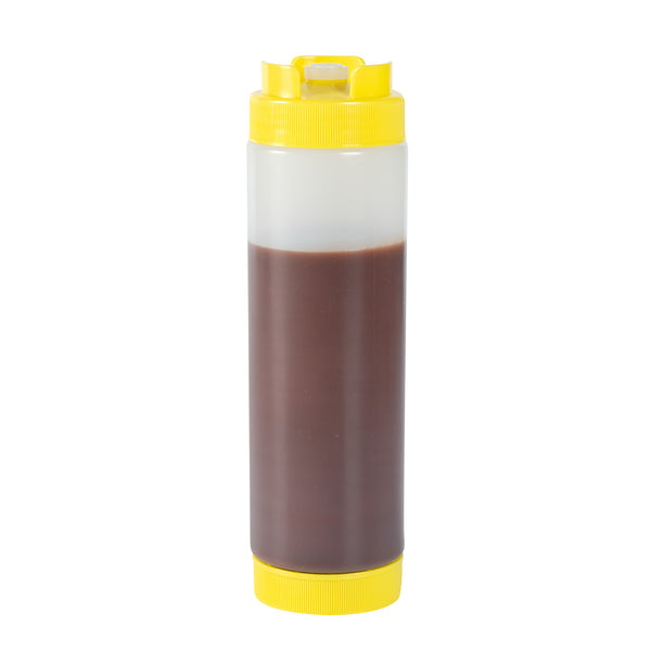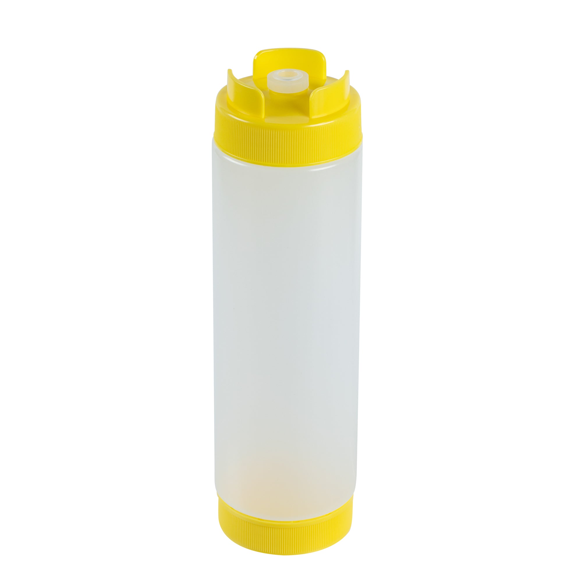 Boost the freshness and accessibility of condiments with our First In First Out 24-ounce Yellow Plastic Squeeze Bottle. Crafted from flexible, food-grade plastic, this condiment dispenser retains its shape after every use, ensuring longevity and safety. The innovative refillable lid of this squeeze bottle features a 'first in, first out' design, ensuring the consistent freshness of your sauces. With an inverted precision tip, this squeeze dispenser delivers accurate and even dispensing, enhancing portion control for your recipes. The automatic sealable valve of this condiment dispenser opens only when squeezed, preventing spills and assuring a mess-free experience with each use. For easy maintenance, this refillable squeeze bottle is dishwasher-safe, saving valuable time in busy foodservice environments. Measuring 2.72 inches in diameter by 9.25 inches in height, this plastic squeeze bottle holds up to 24 ounces of your favorite condiments. Sold in a 1 count box.