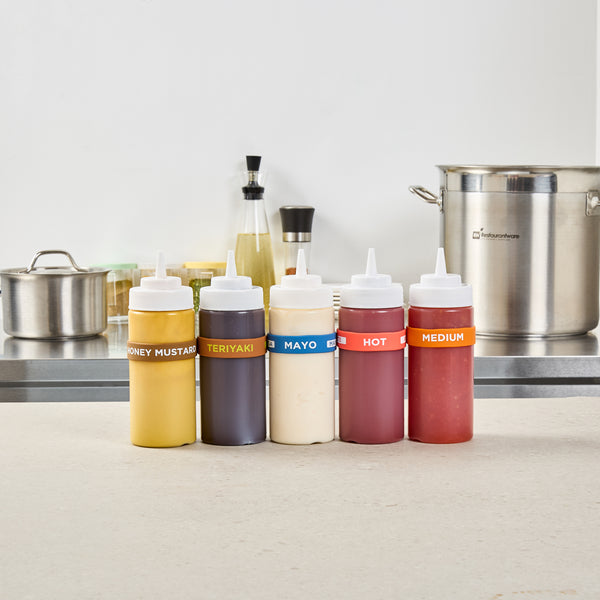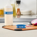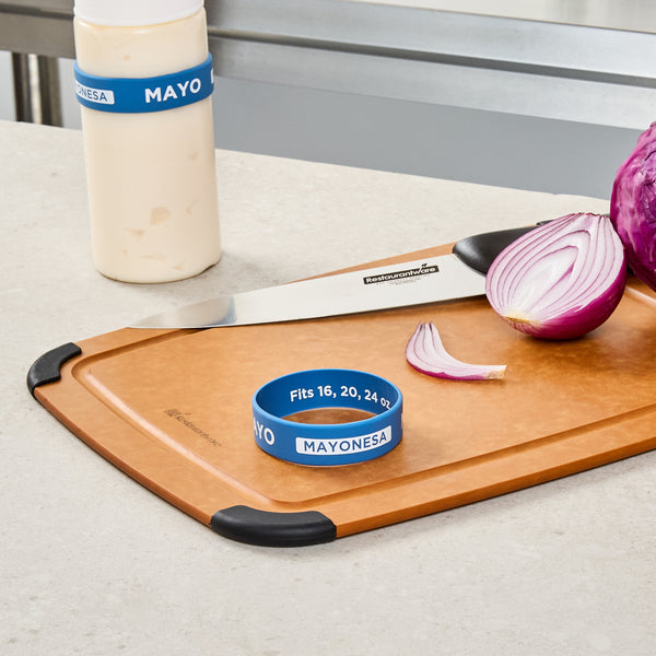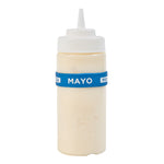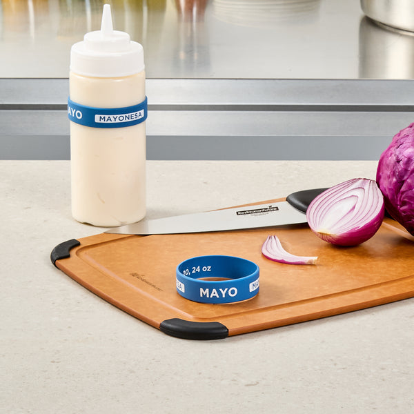 Eliminate condiment confusion with our efficient labeling solution. The First In First Out Silicone Squeeze Bottle Label is crafted from durable blue silicone, ensuring a secure grip that reduces accidental spills in bustling kitchen environments. Its clearly printed "Mayo" label provides quick identification, streamlining ingredient preparation and minimizing errors, ideal for maintaining a smooth service flow. This versatile condiment bottle label fits seamlessly onto 16, 20, and 24-ounce bottles, adapting effortlessly to various kitchen setups. Measuring 2.75 inches in length and width, it withstands frequent use and cleaning without compromising integrity, making it a reliable choice for foodservice professionals. Enhance your kitchen's organization with this blue condiment band, perfect for fast-paced restaurants, catering services, and delis. Each order includes 10 First In First Out Silicone Squeeze Bottle Labels.