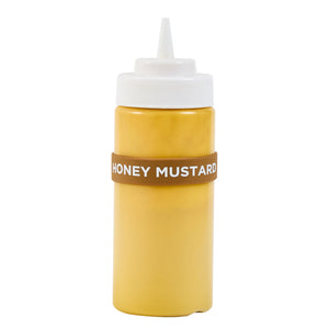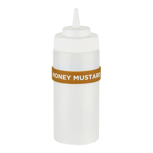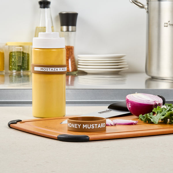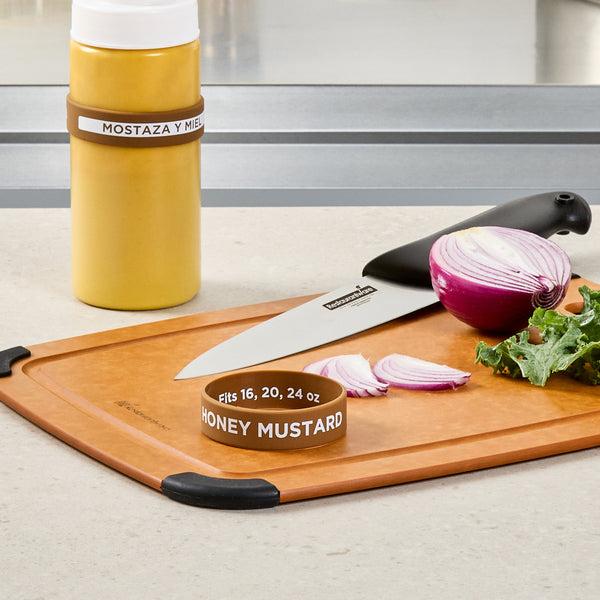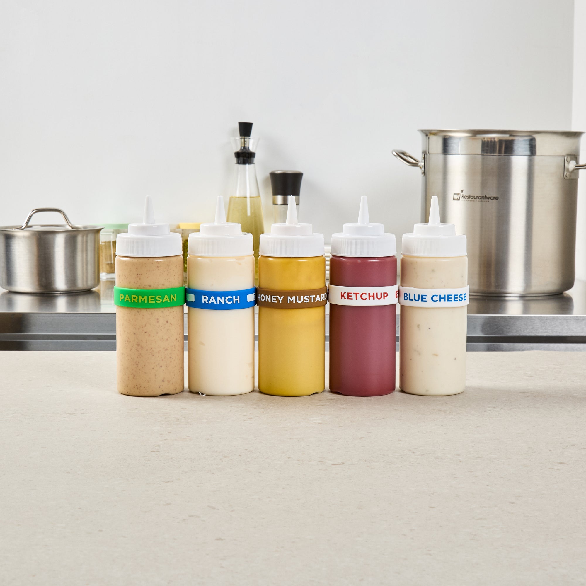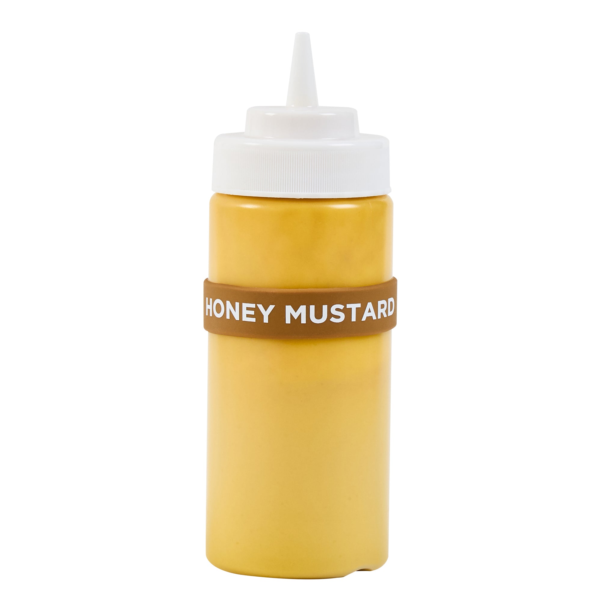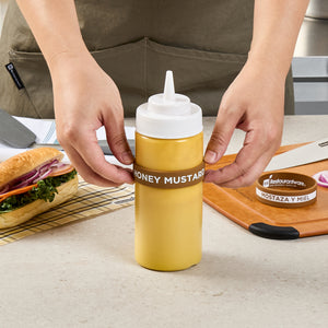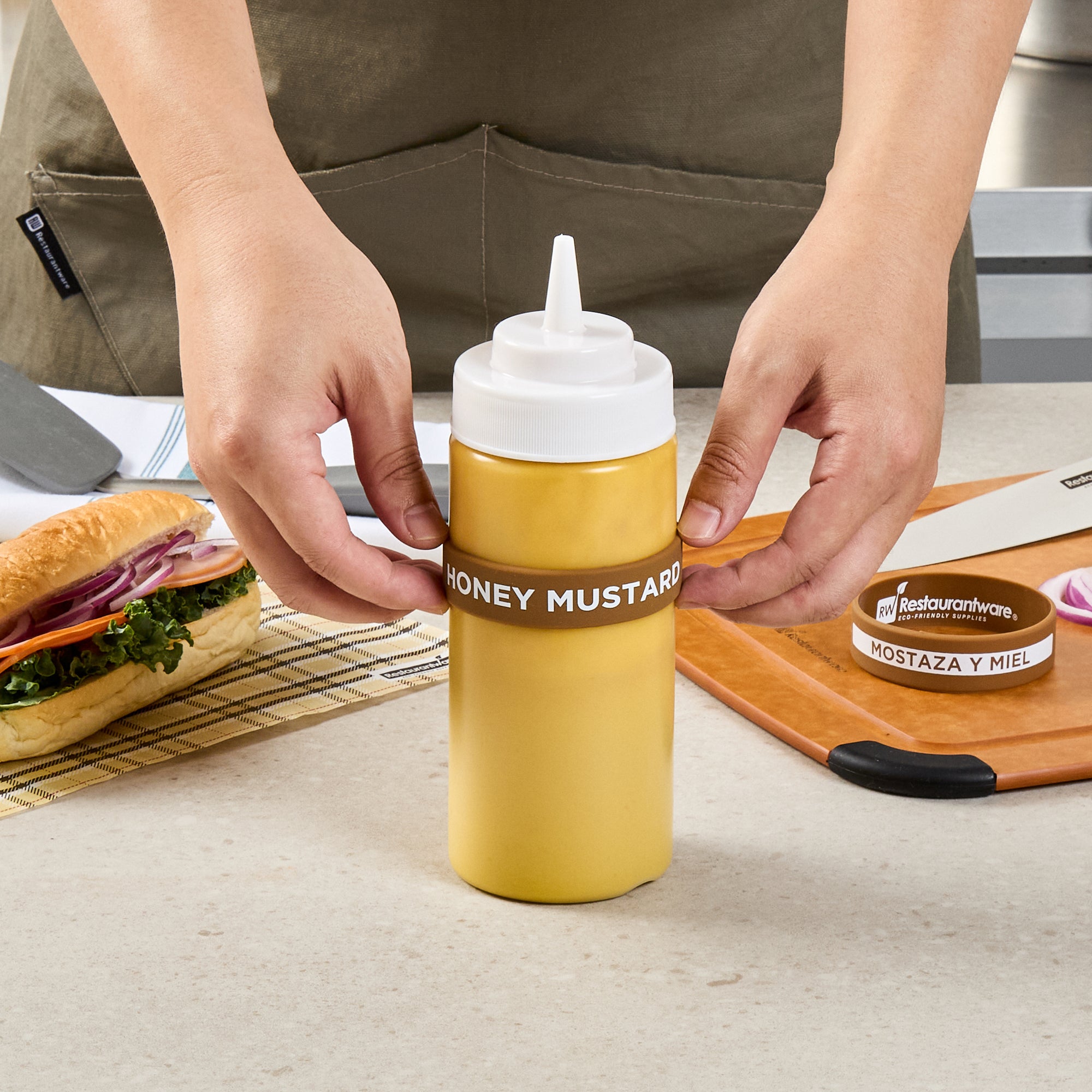 Efficiently organize condiments with these versatile squeeze bottle labels. The First In First Out Brown Silicone Honey Mustard Label Band ensures clear condiment identification, reducing mix-ups during service. Designed to fit 16, 20, and 24-ounce squeeze bottles, this silicone condiment band offers a versatile fit that adapts to various bottle sizes, enhancing operational flexibility. The durable silicone material provides additional grip, ensuring secure handling even in fast-paced environments, while its clearly printed labels promote proper ingredient use, minimizing errors. Its color-coded design aids in easy identification and streamlines kitchen organization, making it ideal for fast-food restaurants and catering services. The stretchable, heat-resistant band withstands frequent washing and high-heat conditions, ensuring long-term use without compromising on food safety. Each order includes 1 First In First Out Brown Silicone Honey Mustard Label Band.