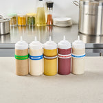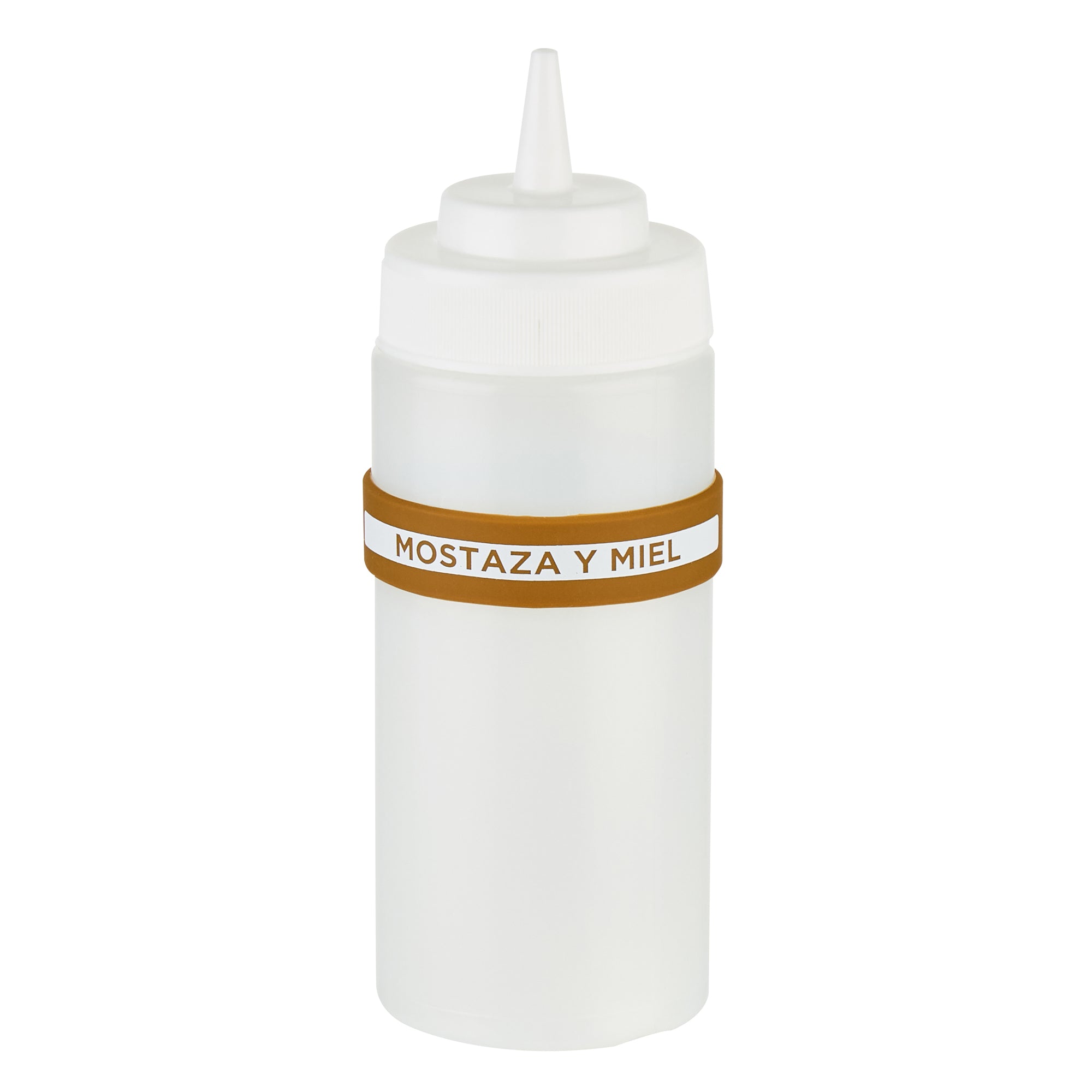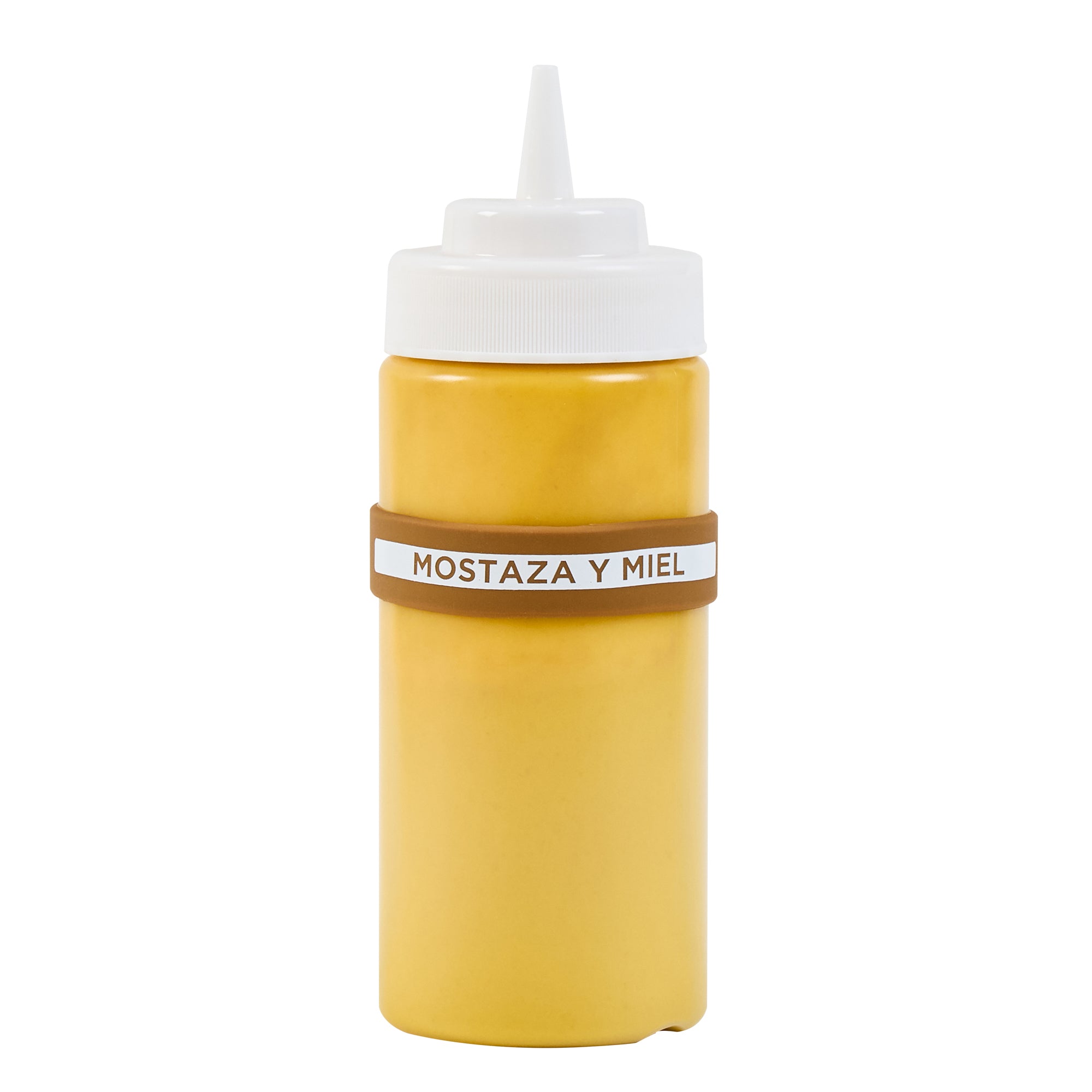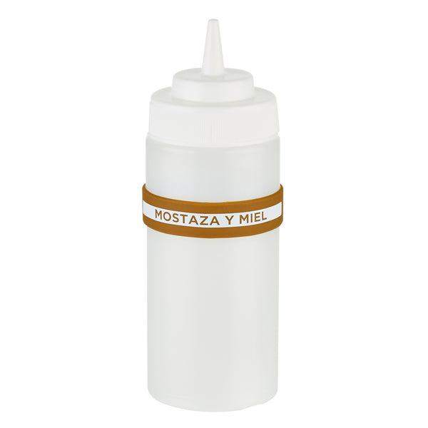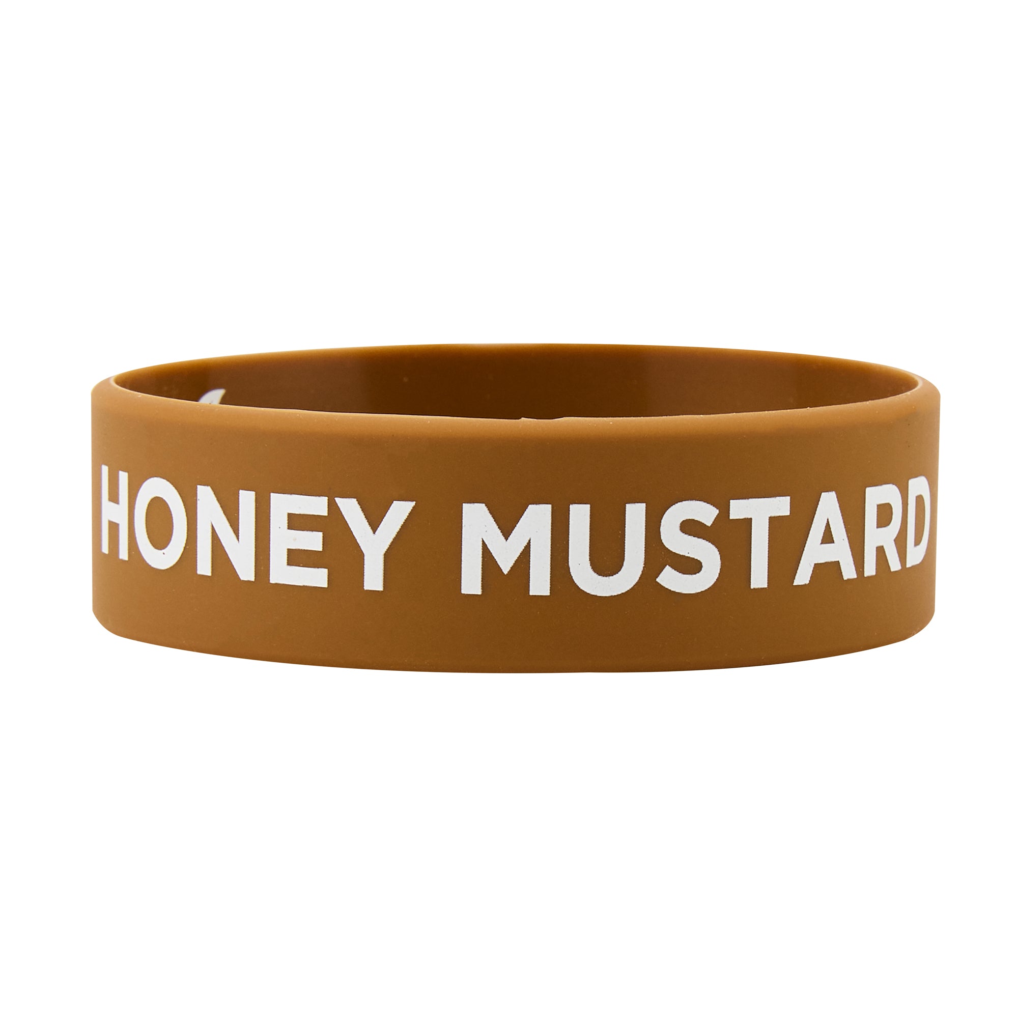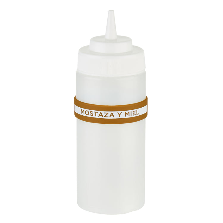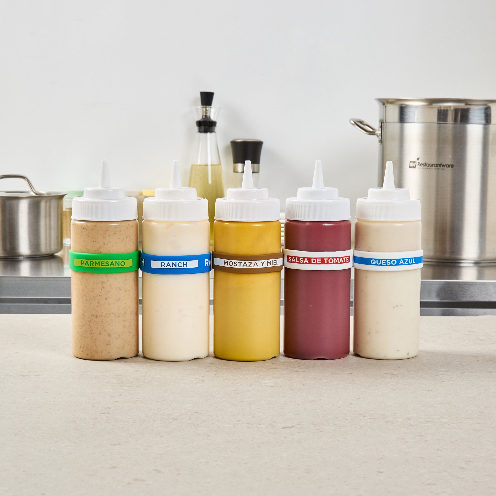 Efficiently organize condiments with these versatile squeeze bottle labels. The First In First Out Brown Silicone Honey Mustard Label Band ensures clear condiment identification, reducing mix-ups during service. Designed to fit 16, 20, and 24-ounce squeeze bottles, this silicone condiment band offers a versatile fit that adapts to various bottle sizes, enhancing operational flexibility. The durable silicone material provides additional grip, ensuring secure handling even in fast-paced environments, while its clearly printed labels promote proper ingredient use, minimizing errors. Its color-coded design aids in easy identification and streamlines kitchen organization, making it ideal for fast-food restaurants and catering services. The stretchable, heat-resistant band withstands frequent washing and high-heat conditions, ensuring long-term use without compromising on food safety. Each order includes 1 First In First Out Brown Silicone Honey Mustard Label Band.