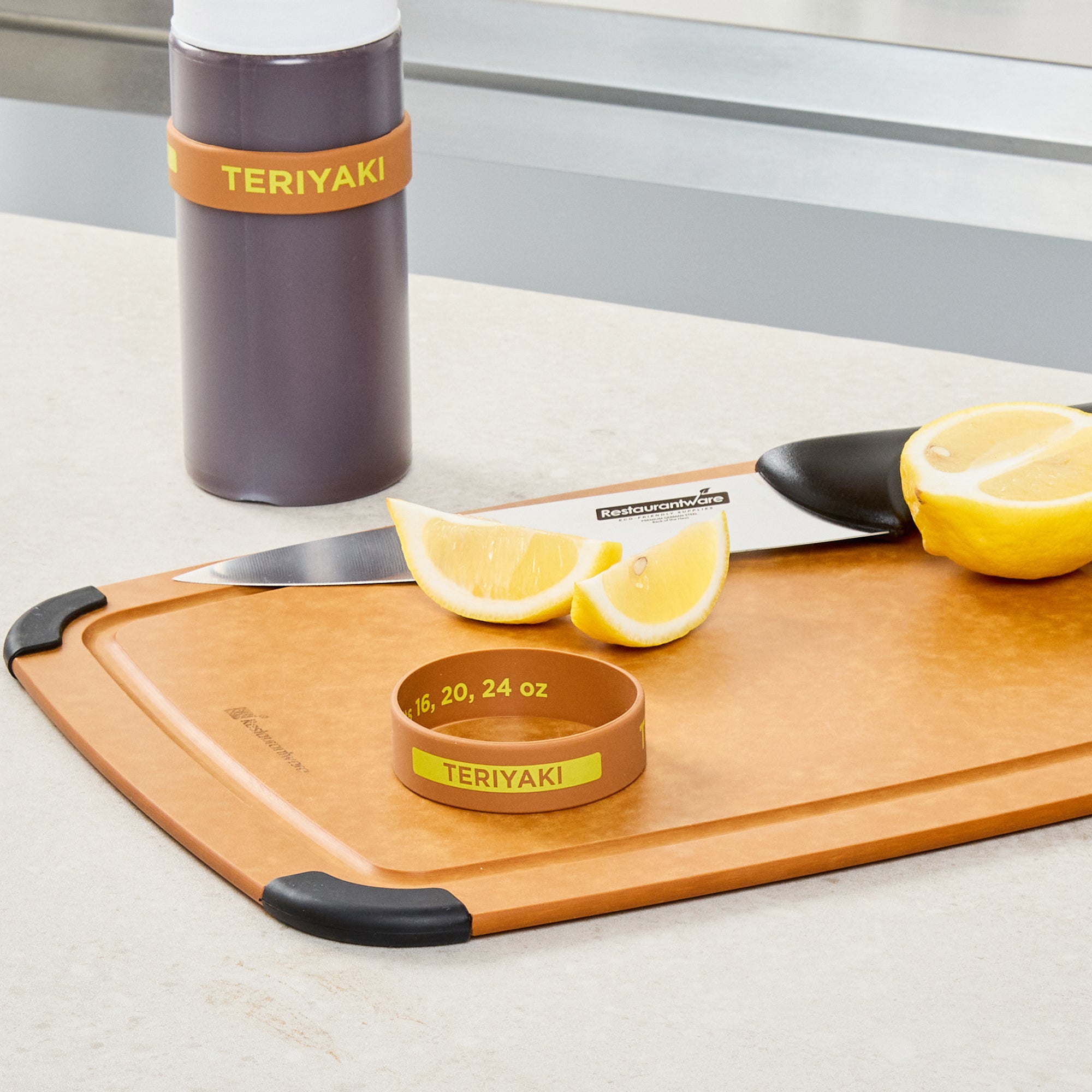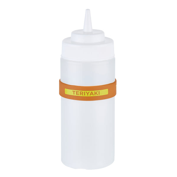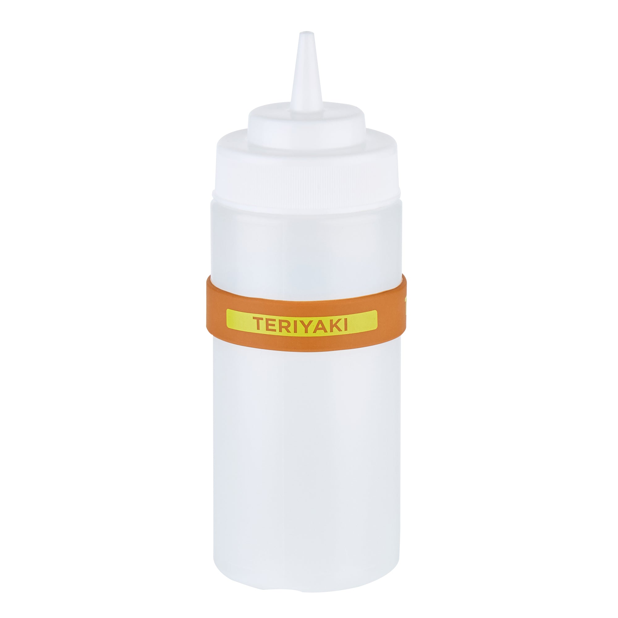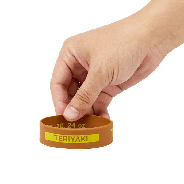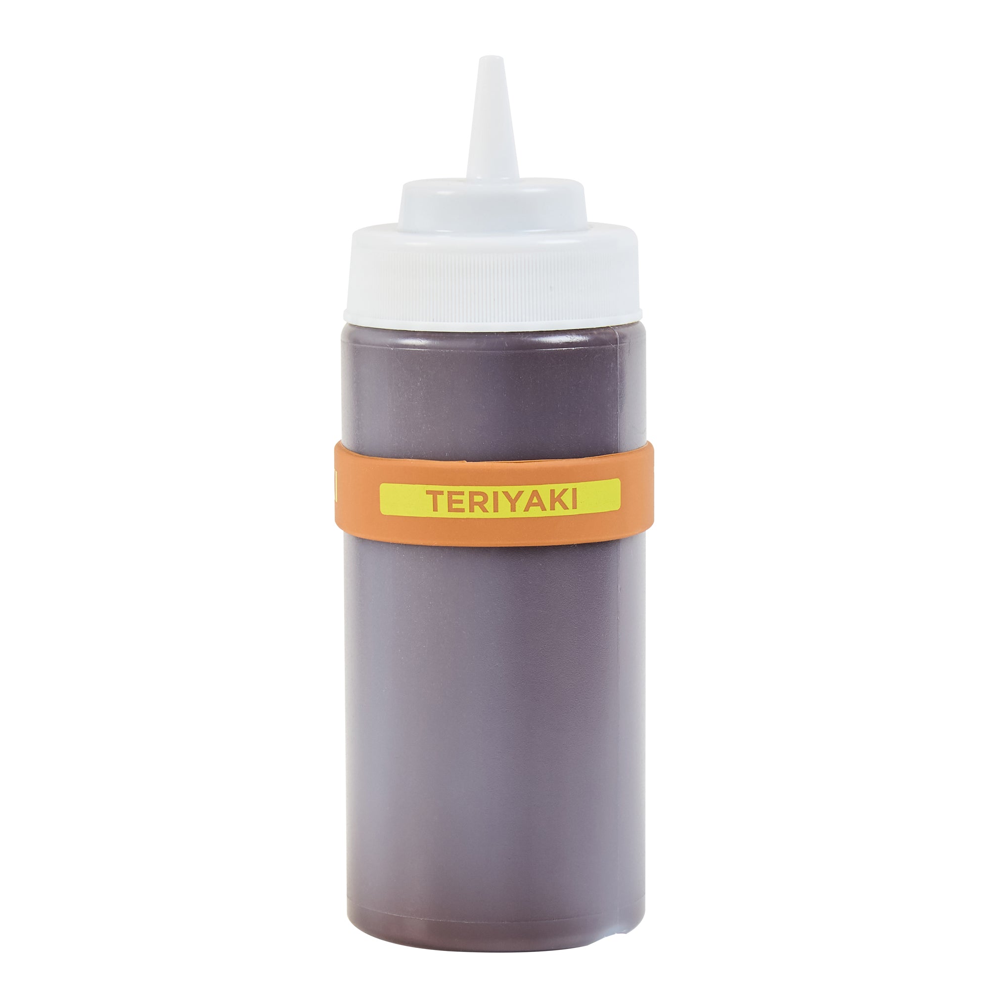 Enhance food safety with our First In First Out Silicone Squeeze Bottle Band. This brown silicone squeeze bottle band is labeled "Teriyaki," ensuring quick identification and reducing cross-contamination risks in busy kitchens. Its durable silicone material withstands frequent use and cleaning, maintaining legibility over time, while the color-coded design prevents condiment bottle label errors, supporting operational efficiency. Measuring 2.75 inches in both length and width, this stretchable bottle band fits seamlessly on 16, 20, and 24-ounce squeeze bottles, providing additional grip and control. The band’s dishwasher-safe feature allows for efficient and quick cleaning, streamlining maintenance routines and ensuring food safety compliance. Equip your condiment stations with these versatile bands to ensure accurate sauce dispensing and maintain high food safety standards. Each order includes 10 First In First Out Silicone Squeeze Bottle Bands.