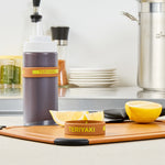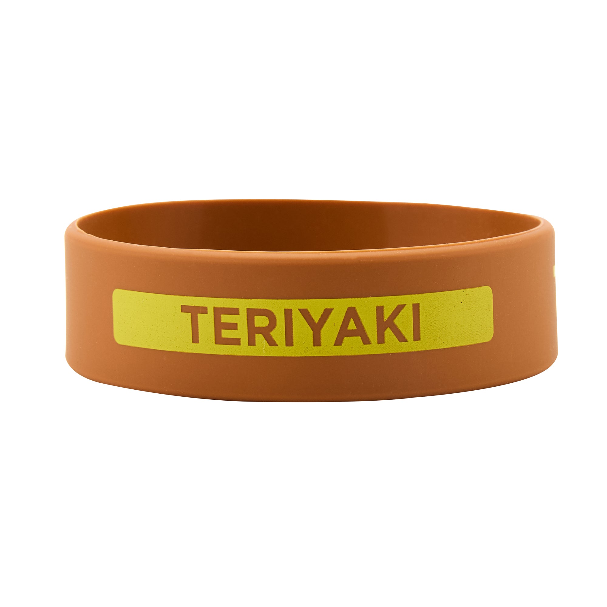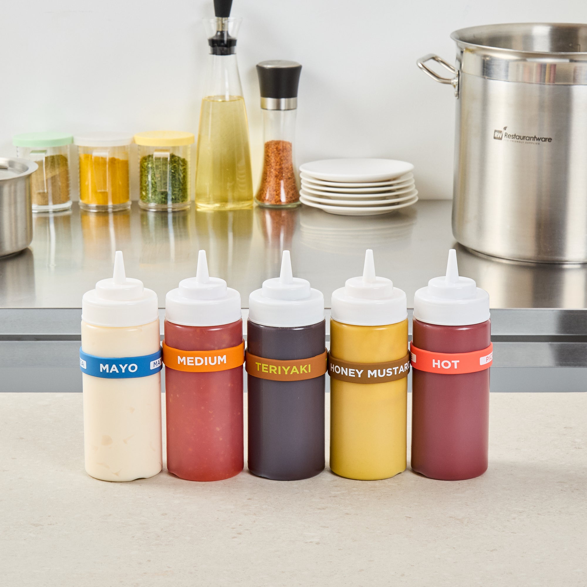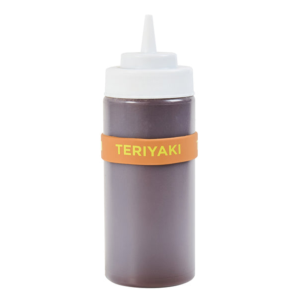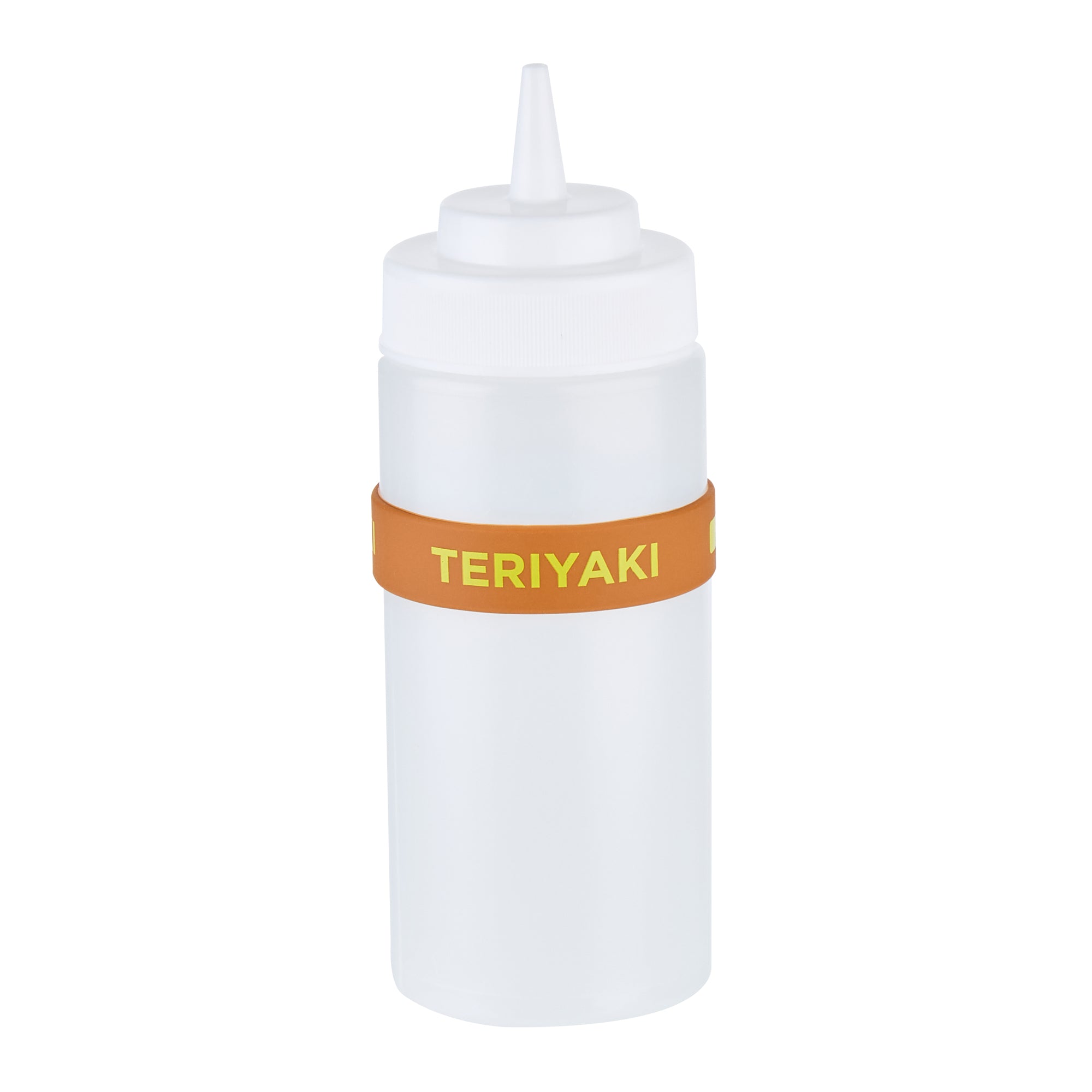Enhance food safety with our First In First Out Silicone Squeeze Bottle Band. This brown silicone squeeze bottle band is labeled "Teriyaki," ensuring quick identification and reducing cross-contamination risks in busy kitchens. Its durable silicone material withstands frequent use and cleaning, maintaining legibility over time, while the color-coded design prevents condiment bottle label errors, supporting operational efficiency. Measuring 2.75 inches in both length and width, this stretchable bottle band fits seamlessly on 16, 20, and 24-ounce squeeze bottles, providing additional grip and control. The band’s dishwasher-safe feature allows for efficient and quick cleaning, streamlining maintenance routines and ensuring food safety compliance. Equip your condiment stations with these versatile bands to ensure accurate sauce dispensing and maintain high food safety standards. Each order includes 10 First In First Out Silicone Squeeze Bottle Bands.