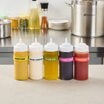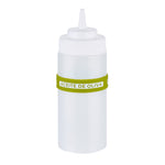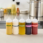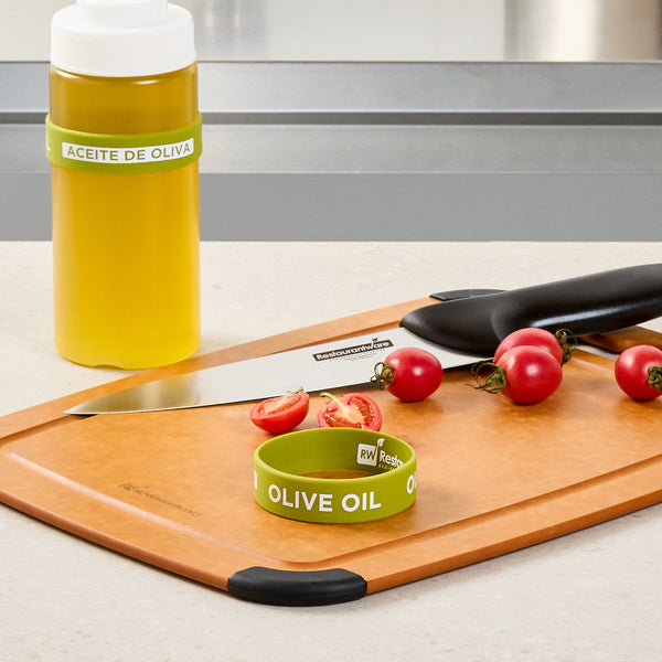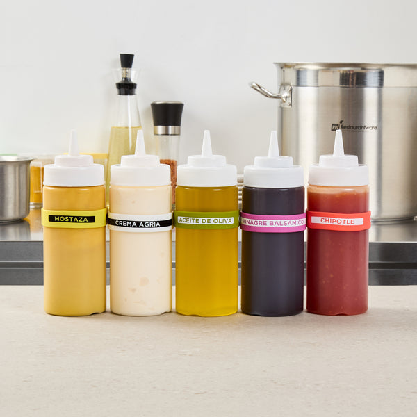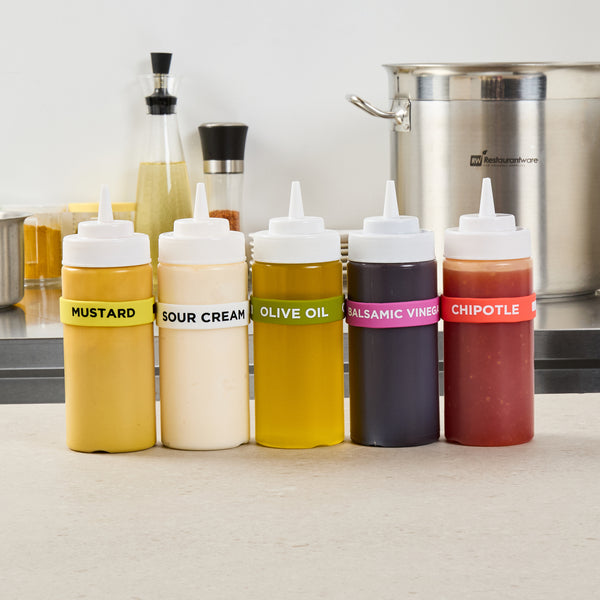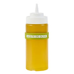 Enhance kitchen efficiency and safety with color-coded labeling. The First In First Out Non-Contaminating Silicone Bottle Band is designed with a durable silicone band that provides additional grip, ensuring secure handling and reducing the risk of drops. This versatile silicone bottle band fits 16, 20, and 24-ounce squeeze bottles, offering flexible storage options for various settings. Labels are clearly printed on the band, facilitating proper ingredient use and minimizing errors, making it an ideal condiment bottle label for commercial kitchens. Measuring 2.75 inches in length and width, this squeeze bottle accessory is crafted from silicone, which withstands frequent handling without disintegrating or contaminating food. Perfect for commercial kitchens, catering services, and food trucks, this color-coded design aids quick visual identification and streamlines condiment dispensing. Each order includes 1 First In First Out Non-Contaminating Silicone Bottle Band.