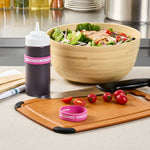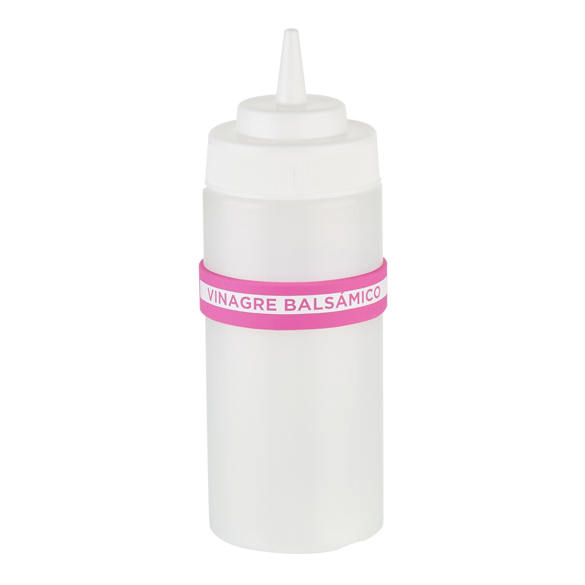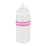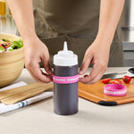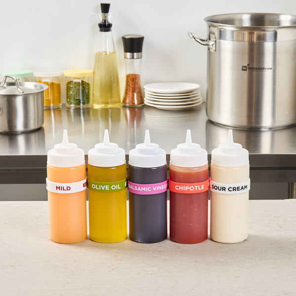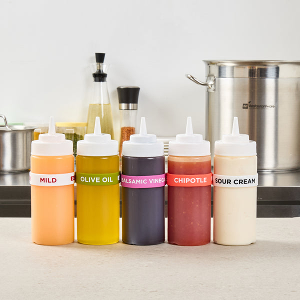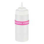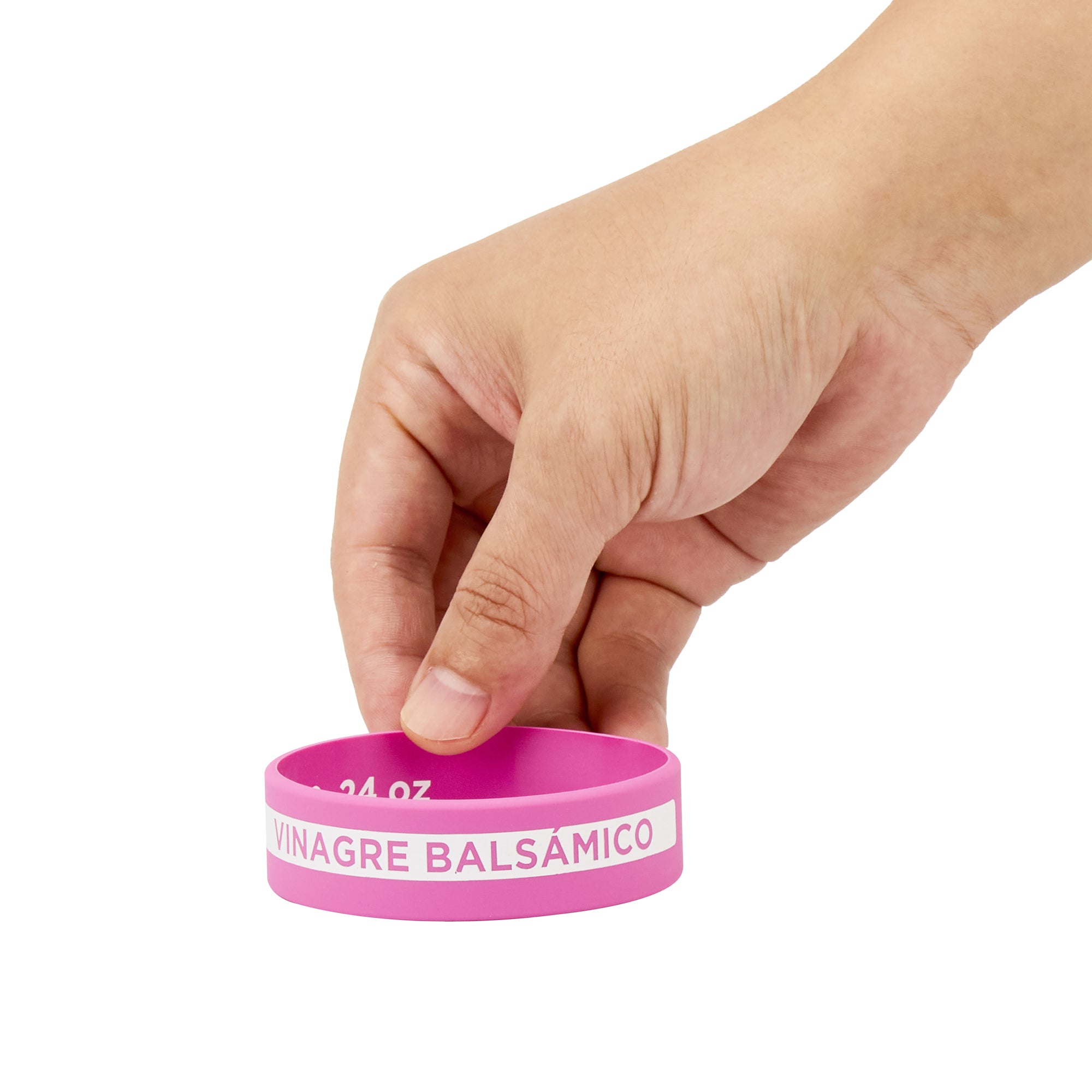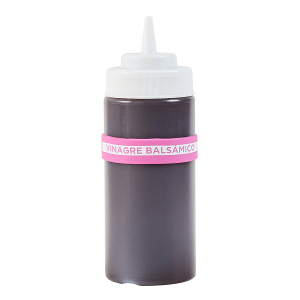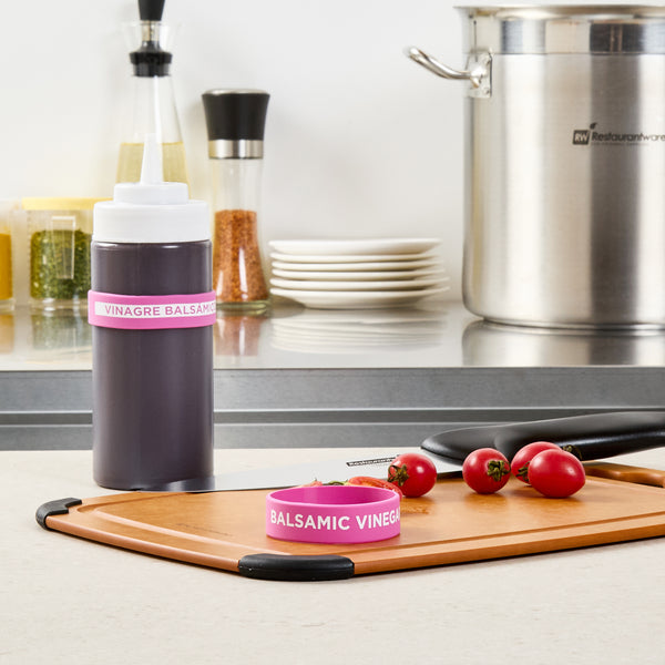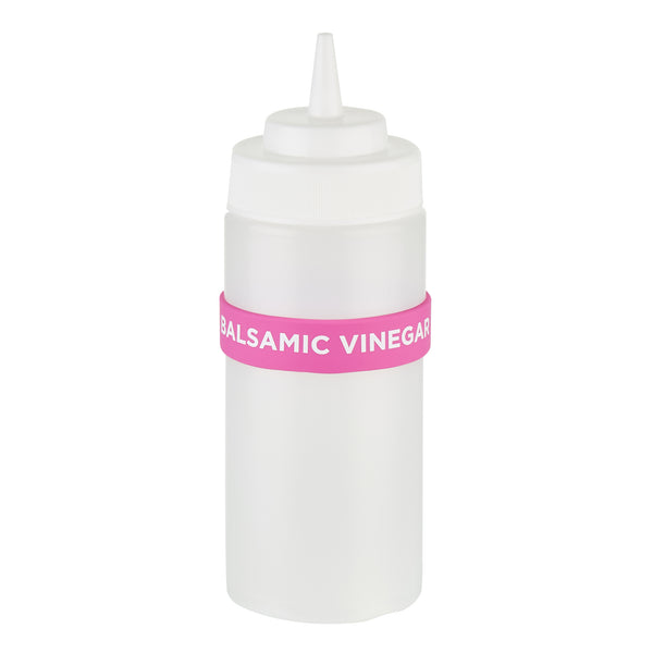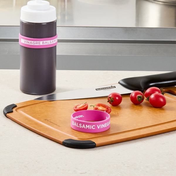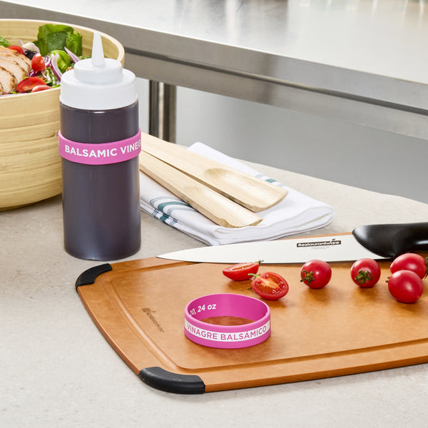 Enhance kitchen efficiency with versatile ingredient identification. The First In First Out Purple Silicone Grip Balsamic Vinegar Band offers a durable silicone construction that provides additional grip for secure handling, reducing the risk of dropped bottles in fast-paced environments. With its color-coded design, this silicone grip band ensures proper ingredient use and reduces errors, making it an indispensable tool for chefs and foodservice professionals. The label band fits 16, 20, and 24 ounce bottles, streamlining inventory management by allowing standardized labeling across various bottle sizes. Measuring 2.75 inches by 2.75 inches, this condiment label band is easy to apply and remove, facilitating quick changes and cleaning, and maintaining high hygiene standards in commercial kitchens. Invest in this reliable solution to enhance your kitchen's organization and efficiency. Each order includes 1 First In First Out Purple Silicone Grip Squeeze Bottle Band.