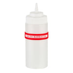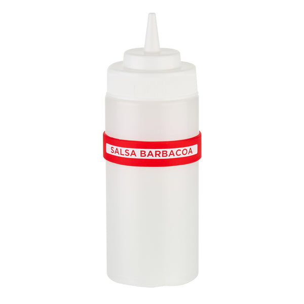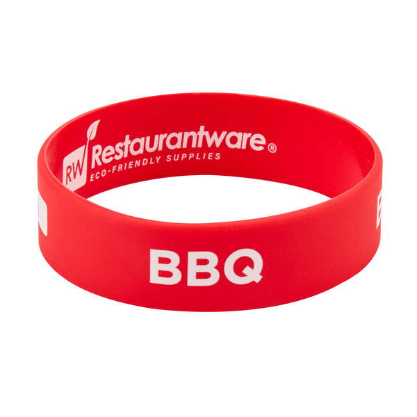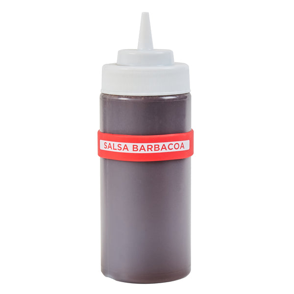 Enhance condiment organization with versatile and durable labeling. The FIFO Silicone BBQ Label Band ensures longevity with its robust silicone construction, perfect for high-traffic kitchens. This red silicone band features a prominent "BBQ" imprint, offering clear identification that minimizes ingredient identification errors and boosts efficiency during food preparation. Designed to fit 16, 20, and 24-ounce squeeze bottles, it optimizes inventory flexibility and streamlines condiment management across various bottle sizes, making it an ideal bbq squeeze bottle label. Measuring 2.75 inches by 2.75 inches, this dishwasher-safe band provides additional grip, ensuring secure handling even in fast-paced environments. Its non-contaminating material resists disintegration, safeguarding the purity of your sauces and dressings. Enhance your kitchen's workflow and reduce service times with this essential squeeze bottle accessory. Each order includes 1 FIFO Silicone BBQ Label Band.