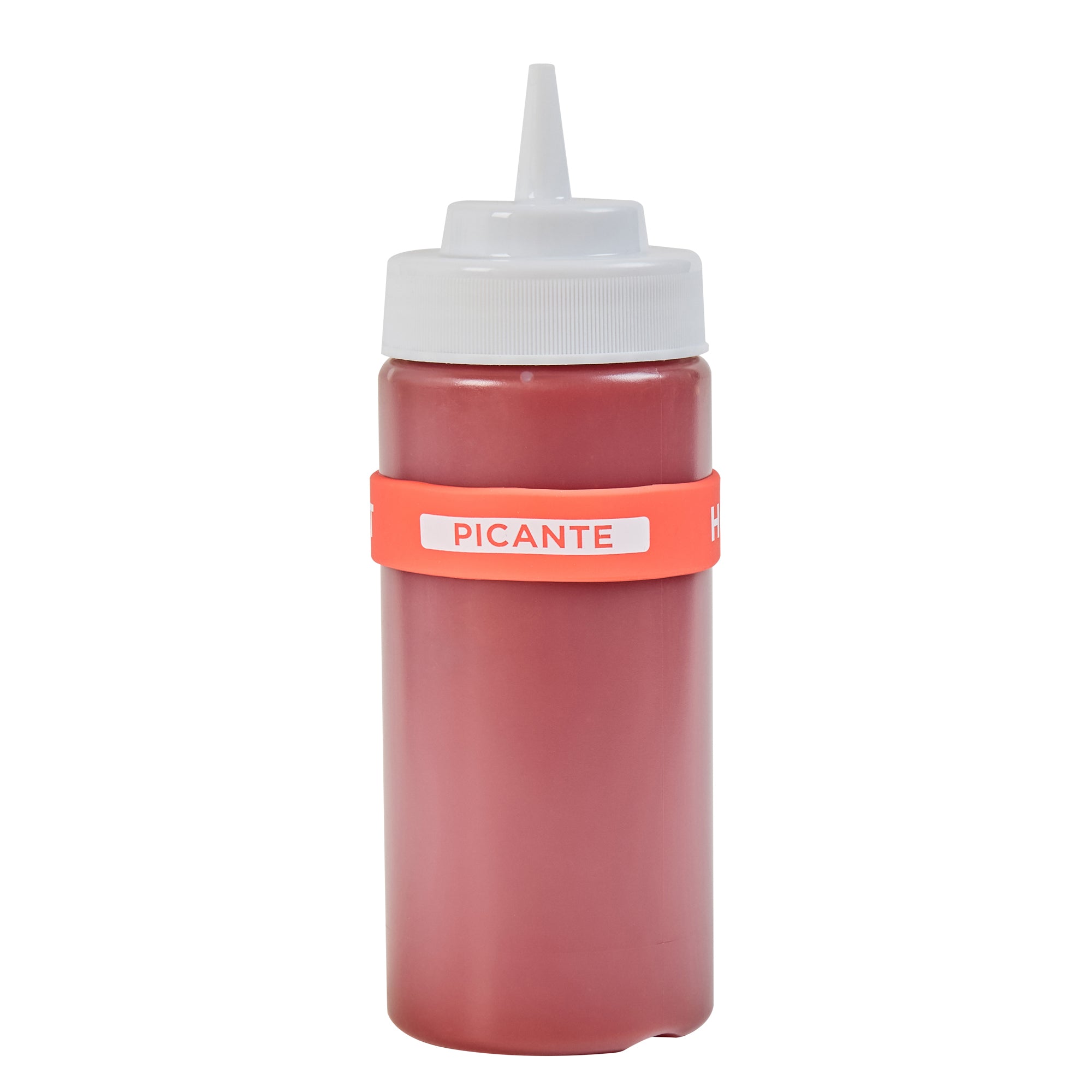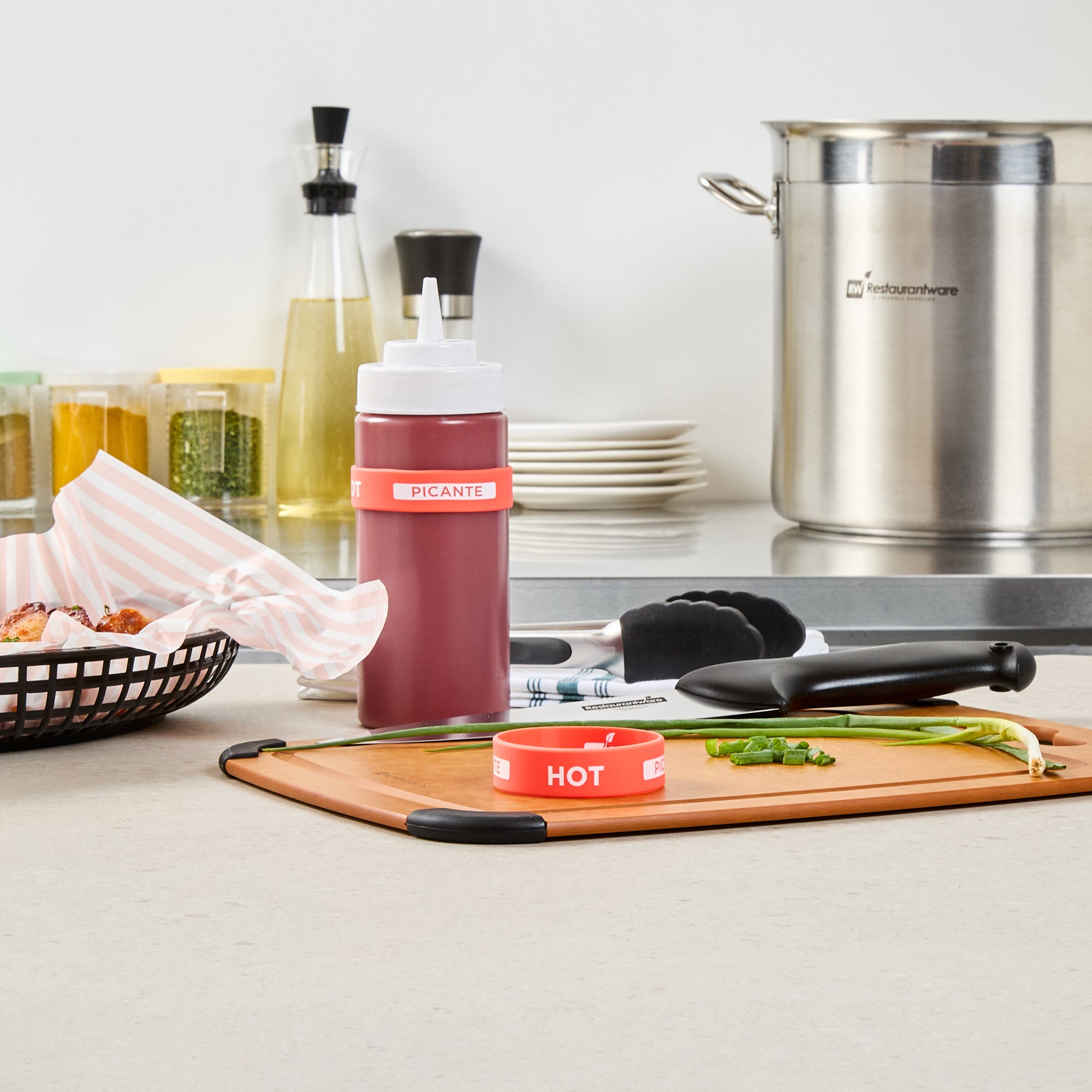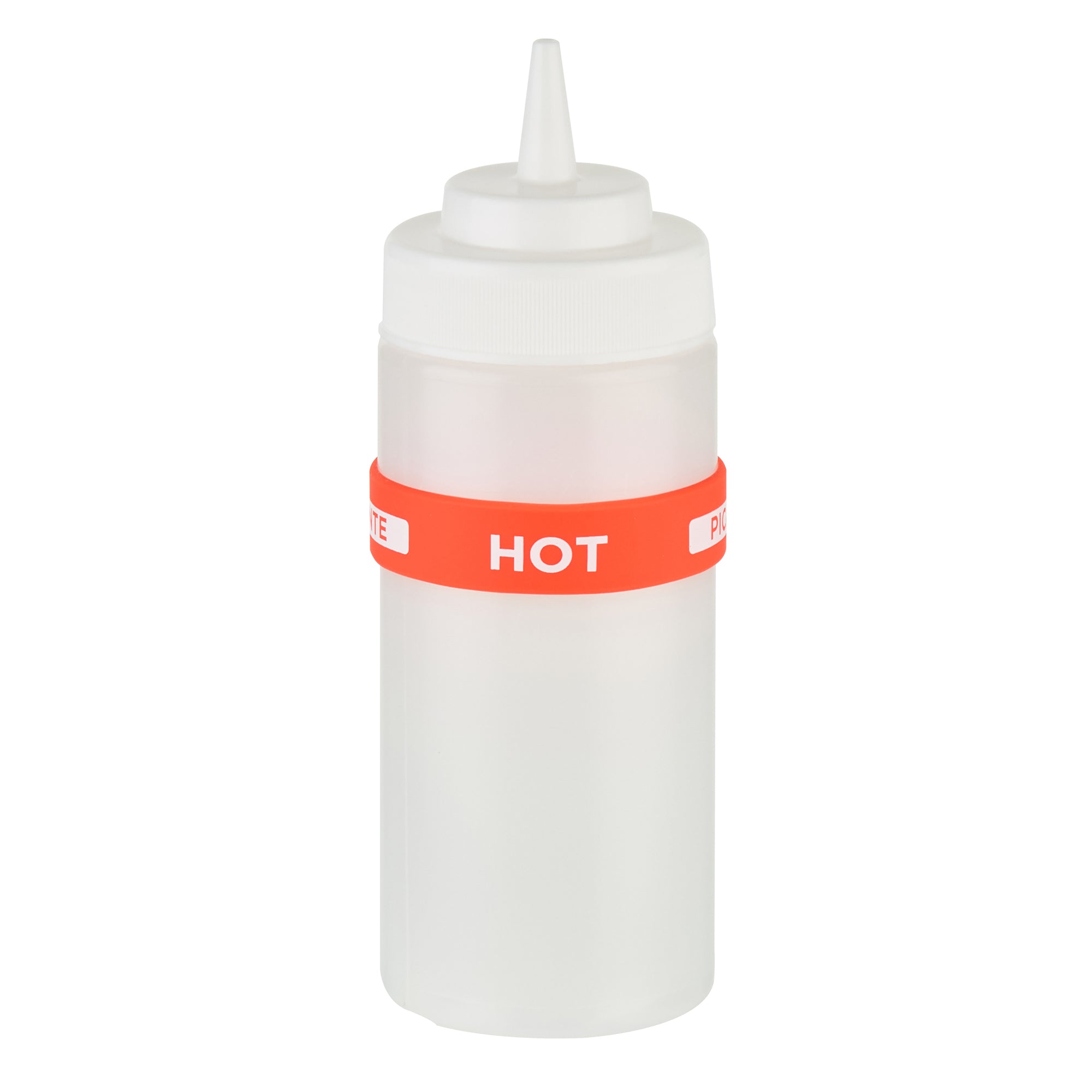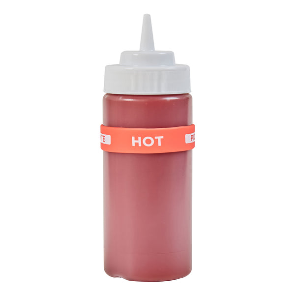 Efficiently manage condiment labeling with these versatile silicone bottle labels. The First In First Out Silicone Bottle Label - Grip-Enhancing, Versatile Fit is designed to fit 16, 20, and 24-ounce bottles, offering a reliable squeeze bottle accessory for your foodservice needs. With a durable silicone construction, these labels provide additional grip, ensuring secure handling even in fast-paced environments. The "HOT" imprint serves as an effective hot sauce identifier, helping to prevent customer confusion and enhance service efficiency. Color-coded to reduce ingredient errors, these labels are essential for busy kitchens where accuracy is paramount. Measuring 2.75 inches by 2.75 inches, they are dishwasher safe for effortless cleaning and maintenance, saving valuable time in high-turnover settings. Upgrade your condiment stations today with these indispensable labels. Each order includes 1 First In First Out Silicone Bottle Labels - Grip-Enhancing, Versatile Fit.