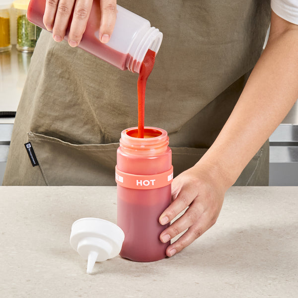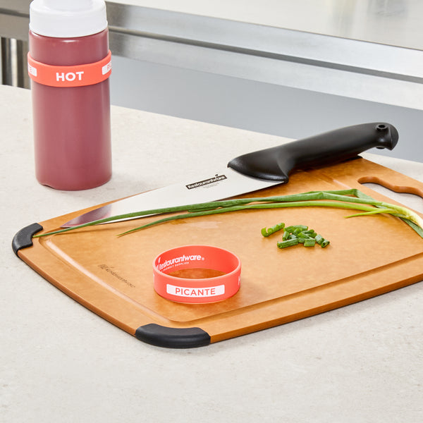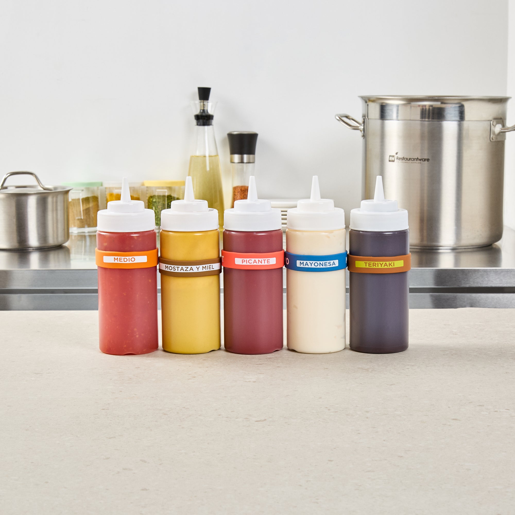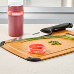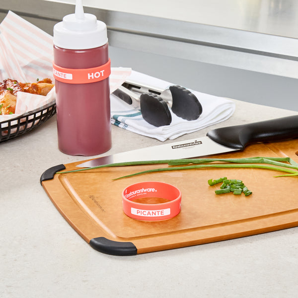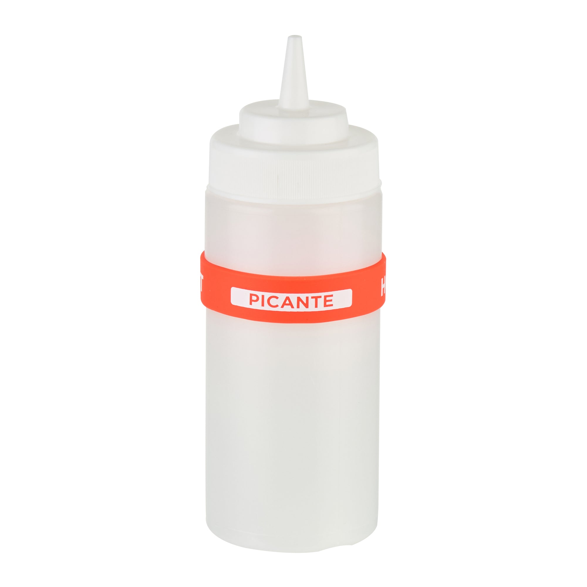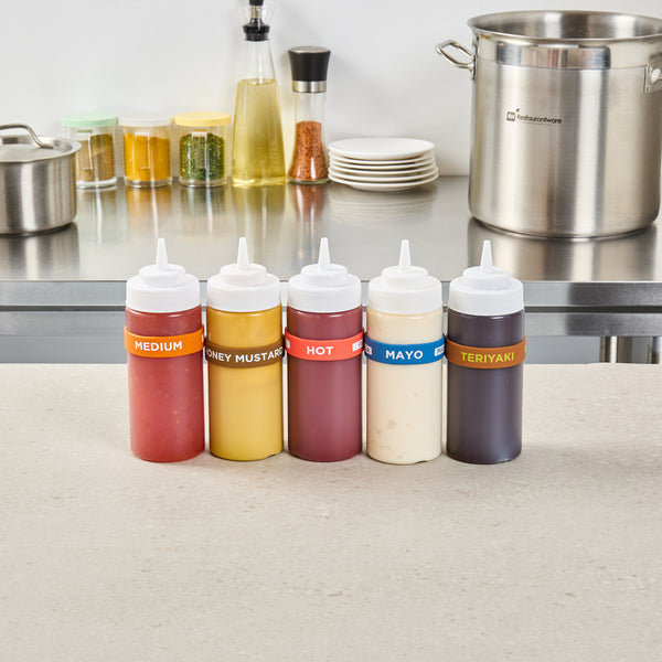 Efficiently manage condiment labeling with these versatile silicone bottle labels. The First In First Out Silicone Bottle Label - Grip-Enhancing, Versatile Fit is designed to fit 16, 20, and 24-ounce bottles, offering a reliable squeeze bottle accessory for your foodservice needs. With a durable silicone construction, these labels provide additional grip, ensuring secure handling even in fast-paced environments. The "HOT" imprint serves as an effective hot sauce identifier, helping to prevent customer confusion and enhance service efficiency. Color-coded to reduce ingredient errors, these labels are essential for busy kitchens where accuracy is paramount. Measuring 2.75 inches by 2.75 inches, they are dishwasher safe for effortless cleaning and maintenance, saving valuable time in high-turnover settings. Upgrade your condiment stations today with these indispensable labels. Each order includes 1 First In First Out Silicone Bottle Labels - Grip-Enhancing, Versatile Fit.