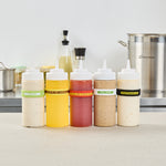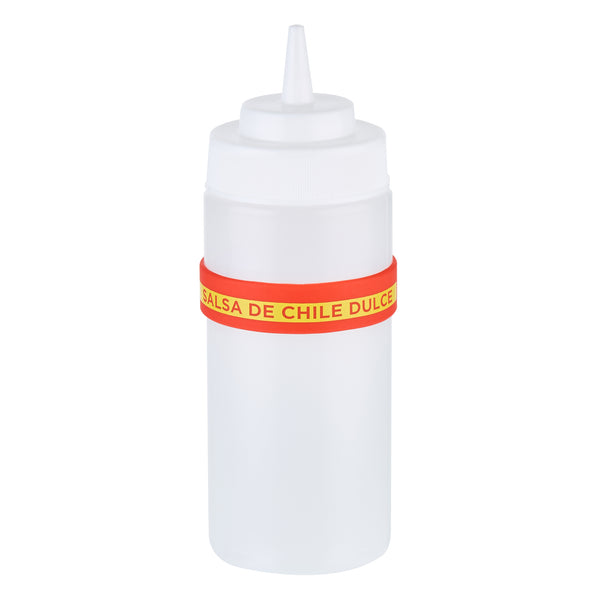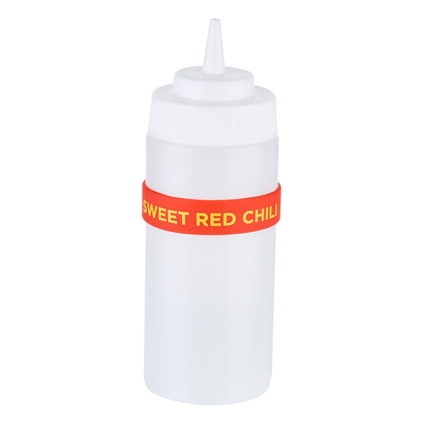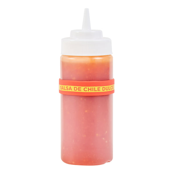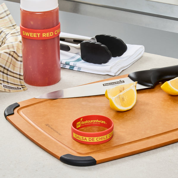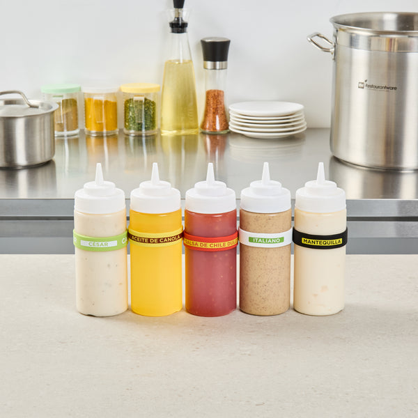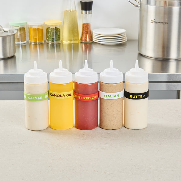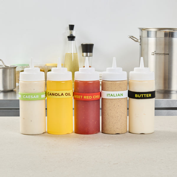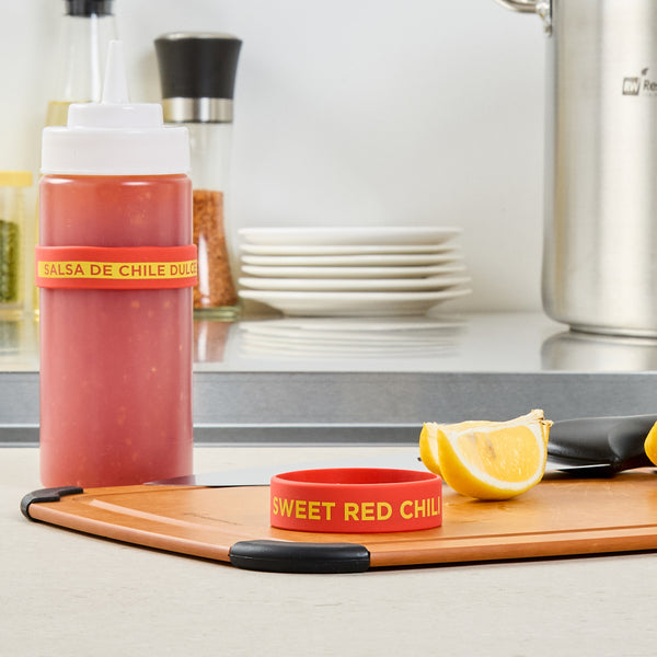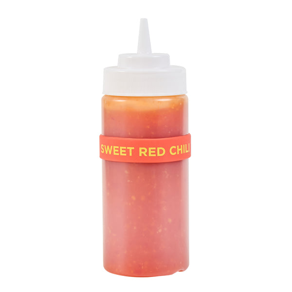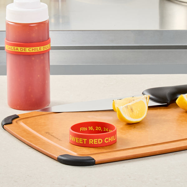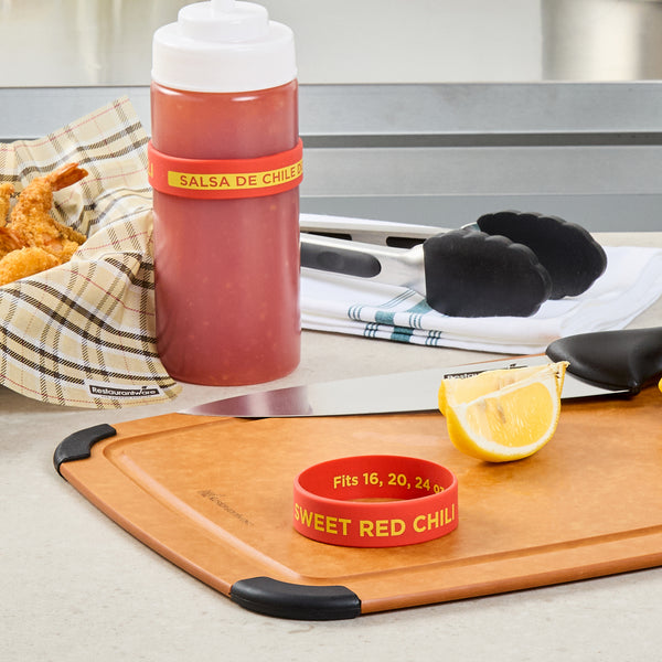 Prevent condiment mix-ups with easy-to-use label bands. The First In First Out Silicone Bottle Band ensures seamless stock rotation, cutting down on waste and keeping ingredients fresh. Crafted from durable silicone, this band provides additional grip, reducing spillage in busy kitchens and enhancing safety. Its bright red color and “Sweet Red Chili” squeeze bottle label offer clear identification, minimizing cross-contamination risks. Designed to fit 16, 20, and 24 ounce squeeze bottles, this fifo label band eliminates the need for multiple label types, streamlining kitchen operations. The dishwasher-safe design simplifies cleaning, ensuring efficient operations in fast-paced environments. This silicone bottle band is perfect for food trucks, catering services, and fast casual restaurants, where managing limited space and maintaining proper ingredient use are crucial. Each order includes 10 First In First Out Silicone Bottle Bands.
