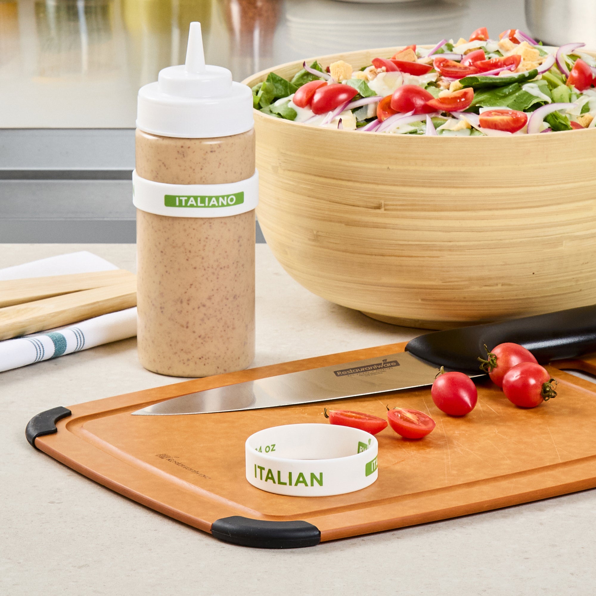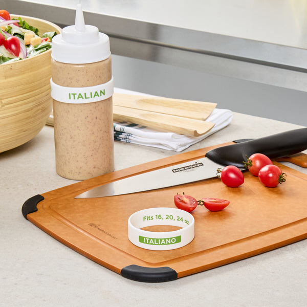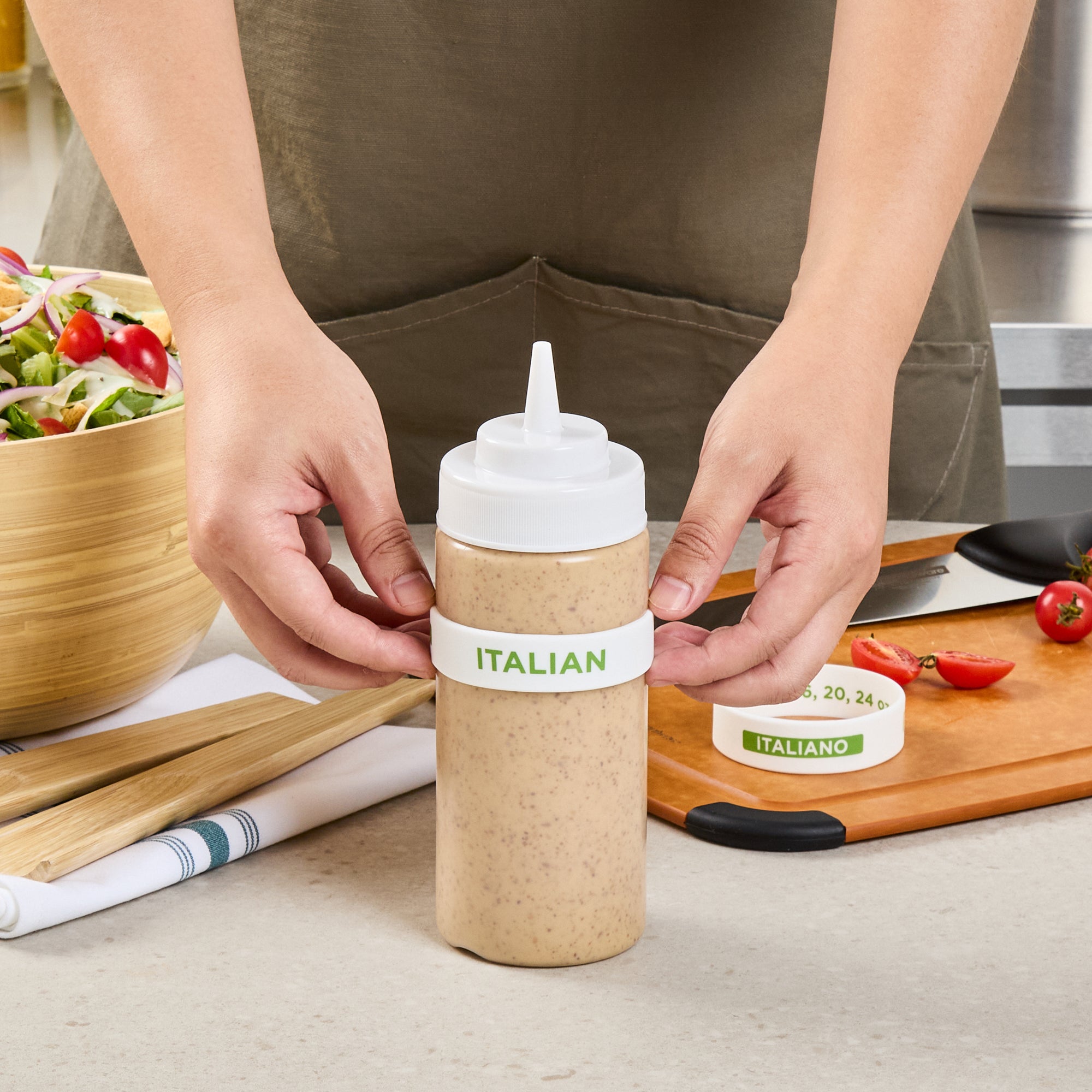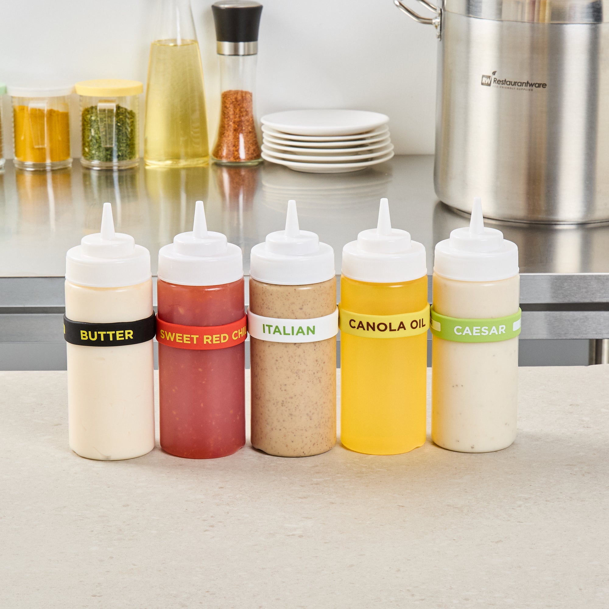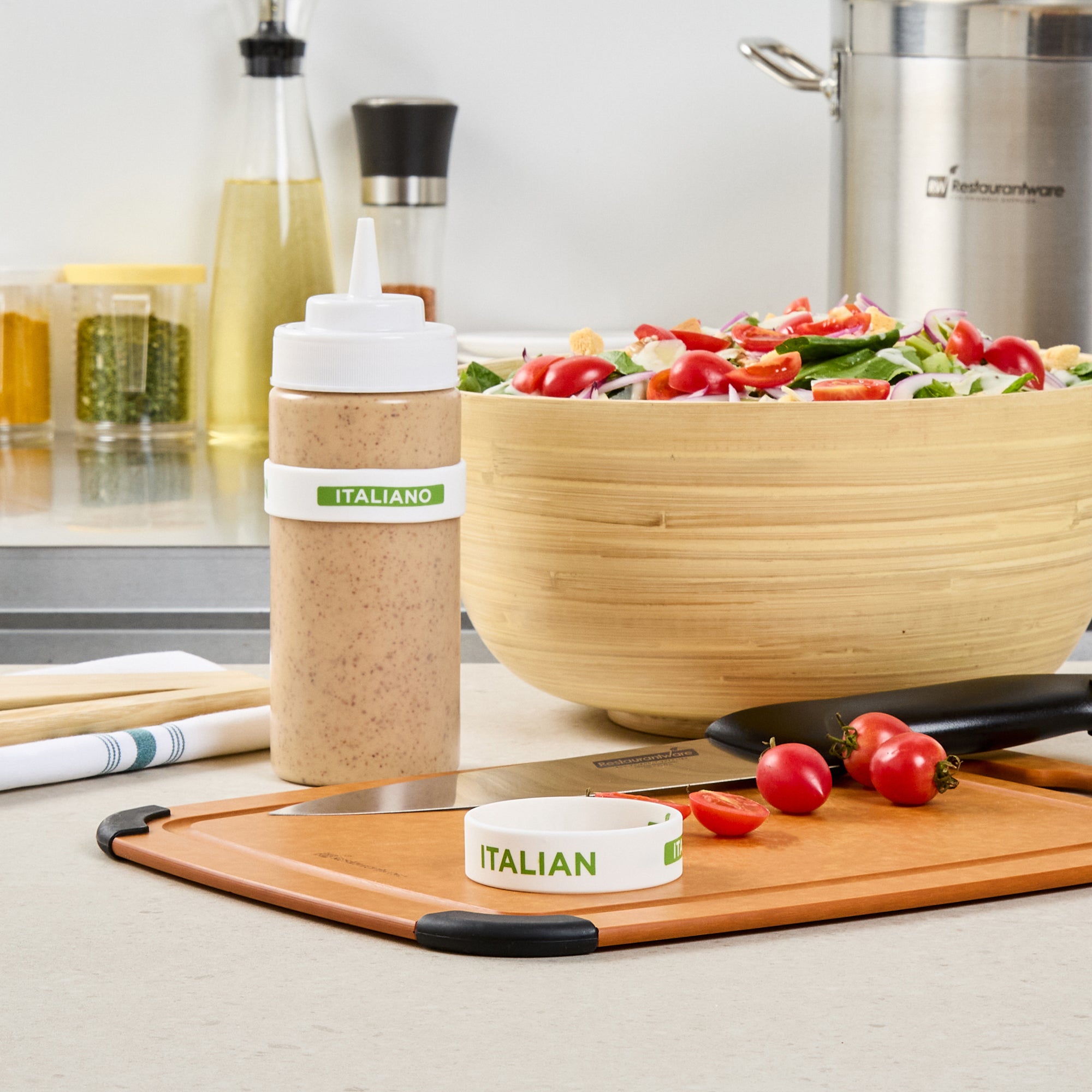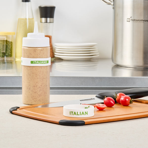 Ensure optimal freshness with the First In First Out Silicone Label Band. Designed to fit 16, 20, and 24-ounce squeeze bottles, this silicone label band enhances kitchen efficiency. Featuring a durable silicone construction, this condiment label band withstands frequent use in busy kitchen environments and provides additional grip to prevent bottle slips. The clearly printed Italian labels ensure accurate ingredient identification, reducing errors. With dimensions of 2.75 inches by 2.75 inches and a height of 0.75 inches, this label band for squeeze bottles offers a versatile fit across various container sizes, making it an invaluable tool for culinary professionals. Its easy application and removal facilitate quick changes and cleaning, helping maintain high hygiene standards. Enhance your kitchen's operational efficiency with this essential food safety tool. Each order includes 10 First In First Out Silicone Label Bands.