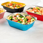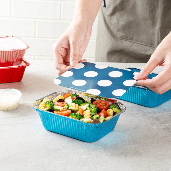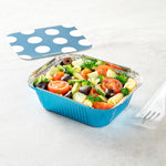 Pump up the character and functionality of your food delivery service with our Foil Lux 12-Ounce Rectangle Blue Aluminum Take Out Containers. Radiating a bold blue hue, these freezable aluminum take out containers infuse a sense of thrill into the meal delivery journey. Accompanied by a charming polka dot paper lid, these oven-ready food containers contribute significantly to their visual allure. Built tough, these disposable take out containers are composed of premium aluminum, ensuring their resilience in the face of delivery challenges, all while retaining their form. The silver foil lining of these recyclable food storage containers assists in sustaining the warmth of hot contents, cementing the culinary fulfillment of your customers. Bearing in mind user convenience, these blue takeaway containers have been disposable, downsizing post-meal cleaning duties. Measuring 5.75 inches in length by 4.75 inches in width by 1.75 inches in height and containing up to 12 ounces, these takeaway containers nicely pack a substantial serving. Sold in a 50 count box.