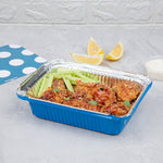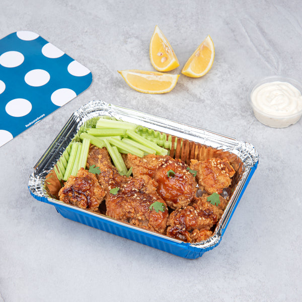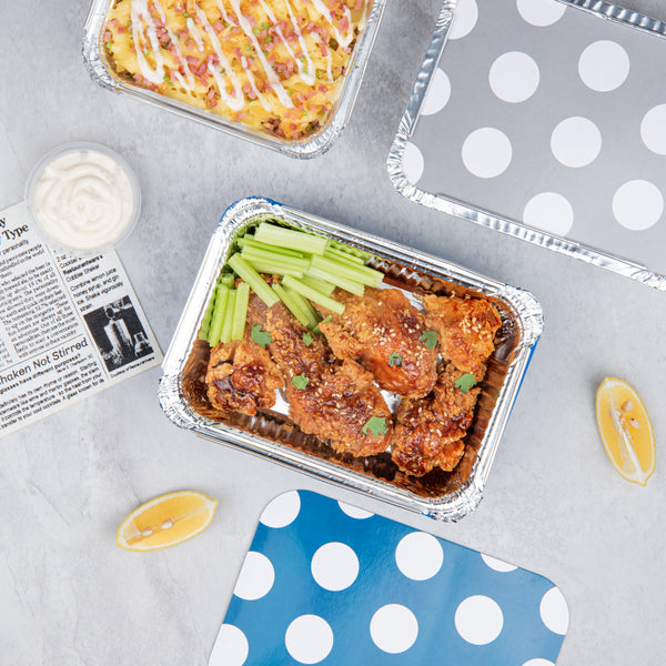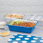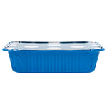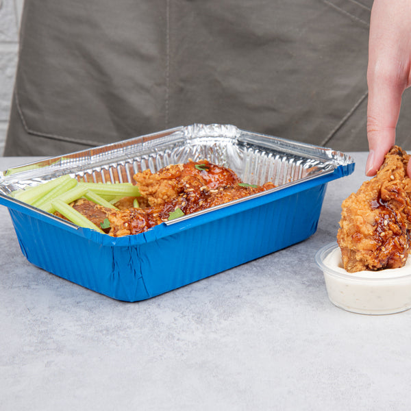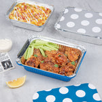 Inject a hue of vibrancy with the practicality of our Foil Lux 16-Ounce Rectangle Blue Aluminum Take Out Containers. The striking blue color of these aluminum to-go containers adds an element of excitement to your delivery services. Paired with a whimsical polka dot paper lid, these oven-ready food containers skyrocket in appeal. Crafted from resilient aluminum, these disposable take out containers are built tough to withstand the rigors of delivery without sacrificing their shape. The silver foil lining of these recyclable carryout containers contributes to the temperature maintenance of hot foods, promising a delightful meal for your customers. Devised for consumer convenience, these blue take out containers are single-use, thereby avoiding the inconvenience of cleaning. Measuring 7.25 inches long by 5.25 inches wide by 2 inches tall and containing up to 16 ounces, these rectangle take out containers generously accommodate substantial servings. Sold in a 50 count box.