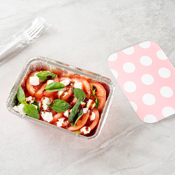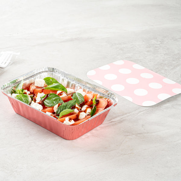 16 OZ PINK ALUMINUM TAKE OUT CONTAINER - WITH POLKA DOT PAPER LID