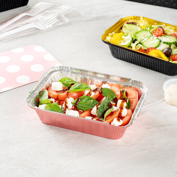 Accentuate your food delivery orders with our Foil Lux 16-Ounce Rectangle Pink Aluminum Take Out Container. The striking pink shade of these aluminum containers provides a dose of elegance to your service. The delightful polka dot paper lid of these recyclable take out containers complements the overall aesthetic. Impressively sturdy, these pink take out containers can withstand the wear and tear of transportation without losing their firm structure. The silver foil lining of these freezable containers manages to keep hot food at an optimum temperature, ensuring the customers relish their meals as intended. Aimed at convenience, these oven-ready meal containers are disposable, relieving your customers from dishwashing duties. Measuring 7.25 inches long by 5.25 inches wide by 2 inches tall and containing up to 16 ounces, these rectangle take out containers generously accommodate substantial servings. Sold in a 200 count box.