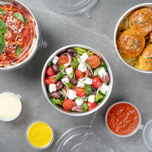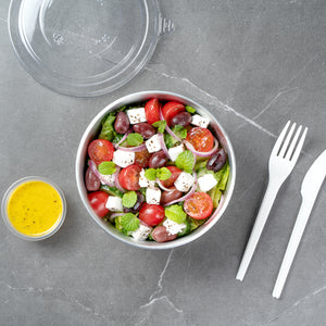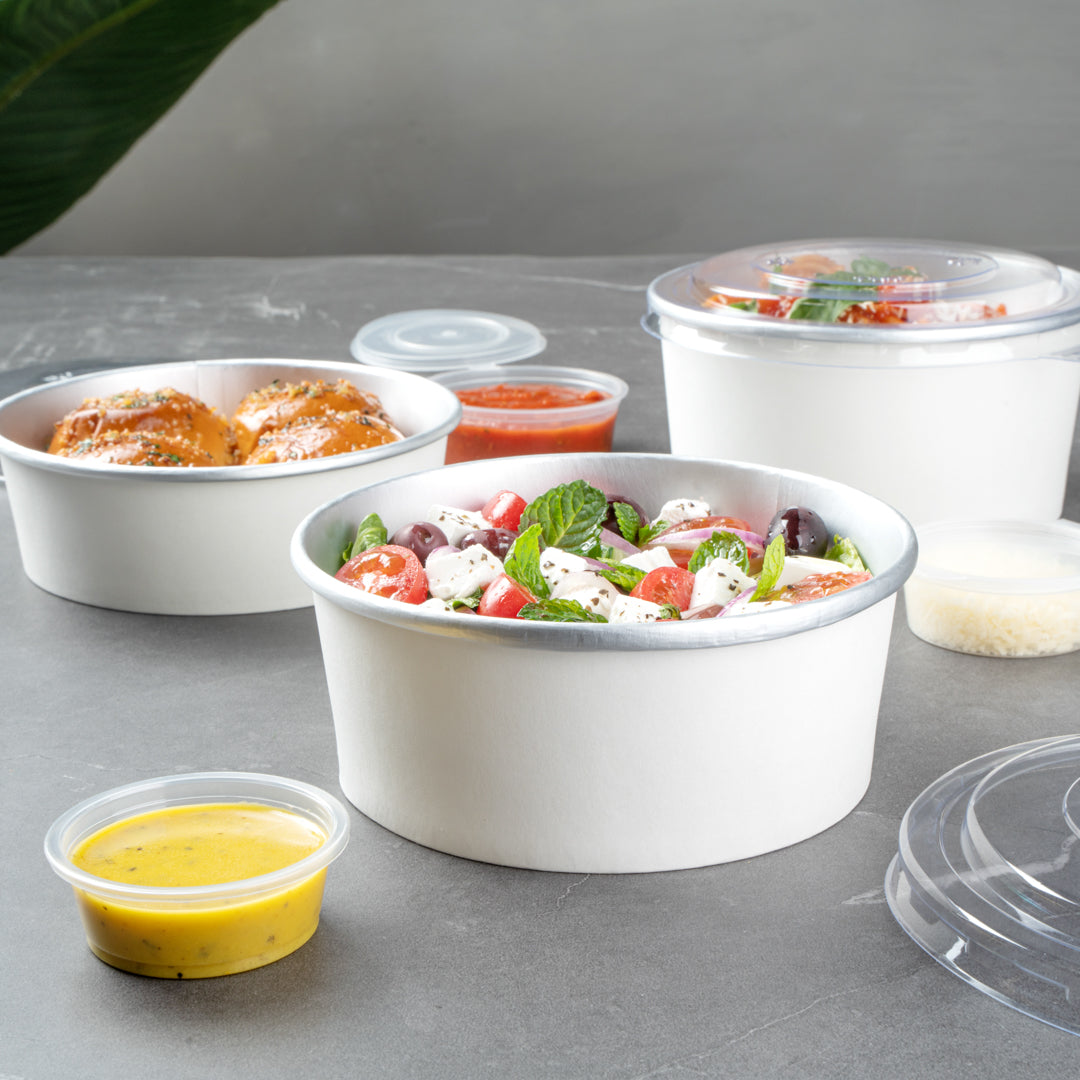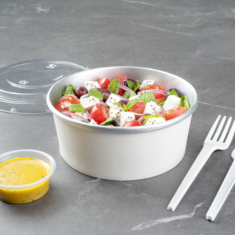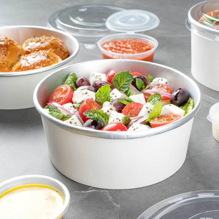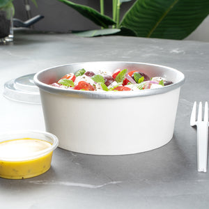 Keep patrons' meals warm during delivery or carry out with our Foil Lux 25-ounce White Paper Take Out Containers. Designed with an interior foil lining, these to go containers are insulated to maintain the temperature of packed meals. Constructed from durable paper and aluminum foil, these greaseproof to go containers are ideal for packaging hot or cold foods. To protect orders during delivery or carry out, these foil food containers are compatible with our Foil Lux lids (SKU: RWM0150C). These take away containers feature a classic white finish to seamlessly match with your restaurant's theme or colors. To save space in your kitchen or storage area, these white to go containers are stackable. Measuring 6 inches in diameter by 2.25 inches in height, these paper take out containers can hold up to 25 ounces. Sold in a 200 count box. Compatible lids are available and sold separately.