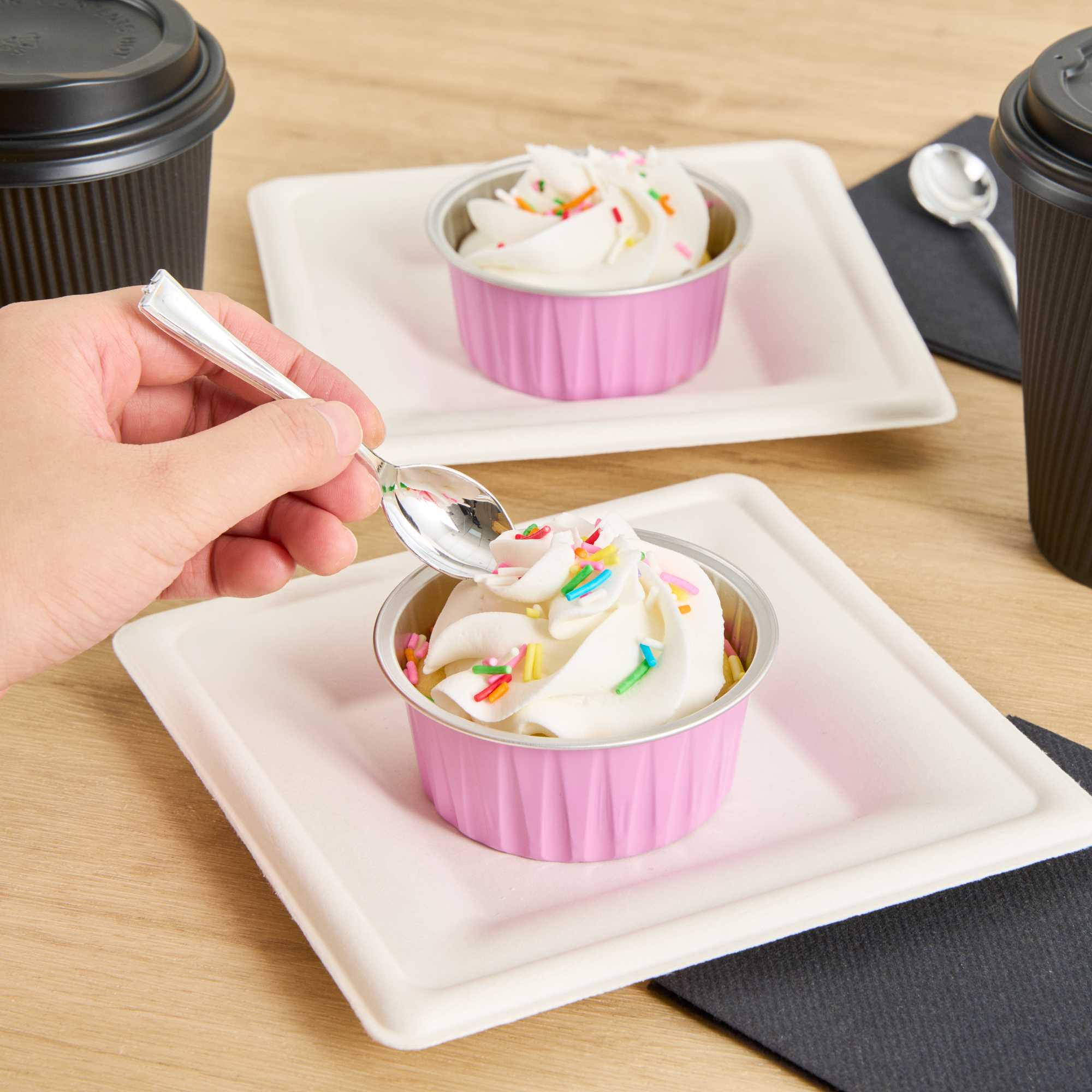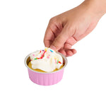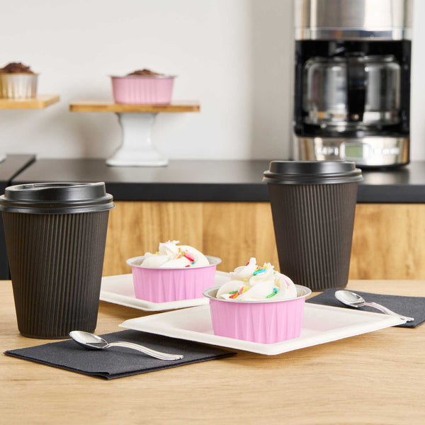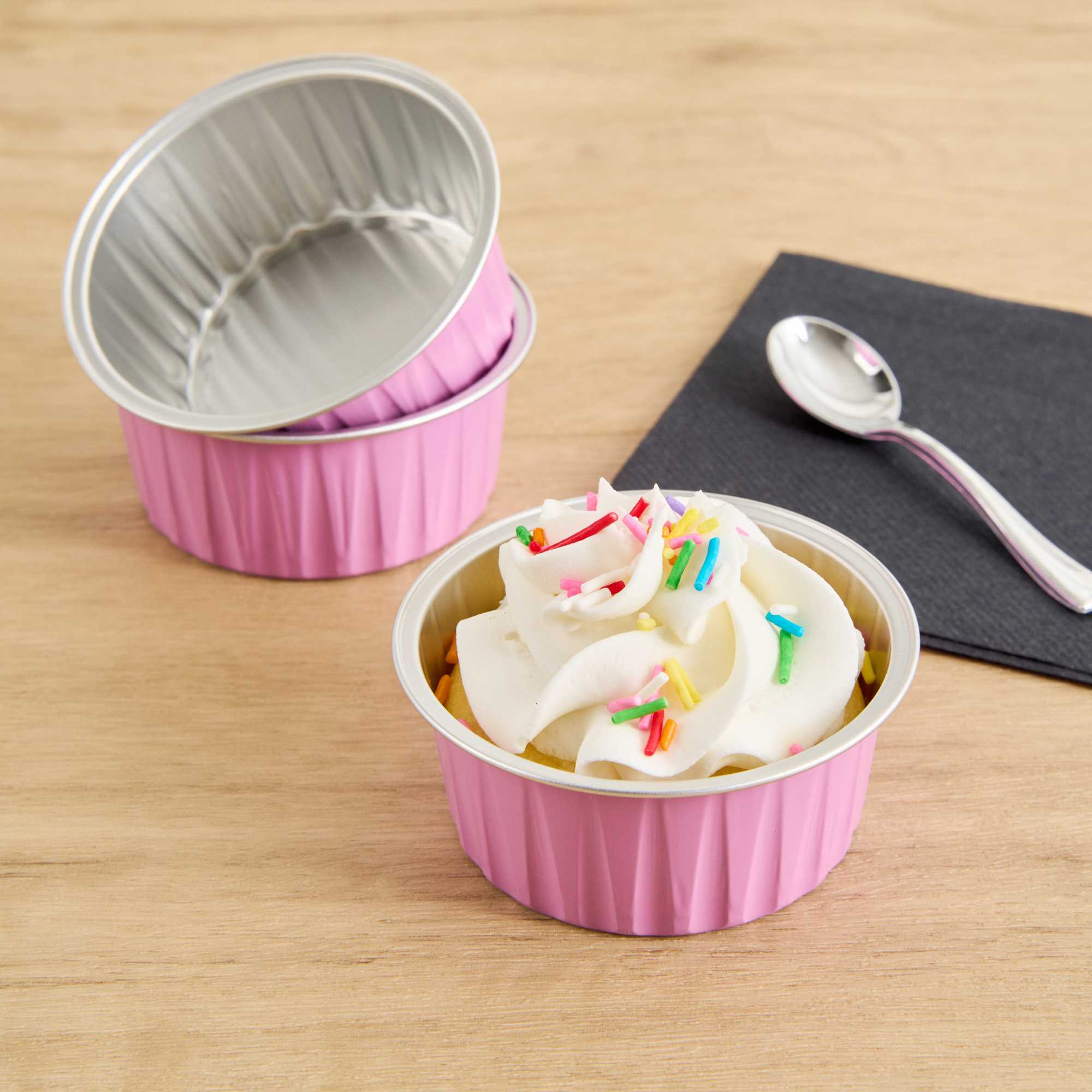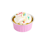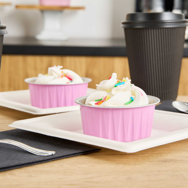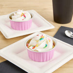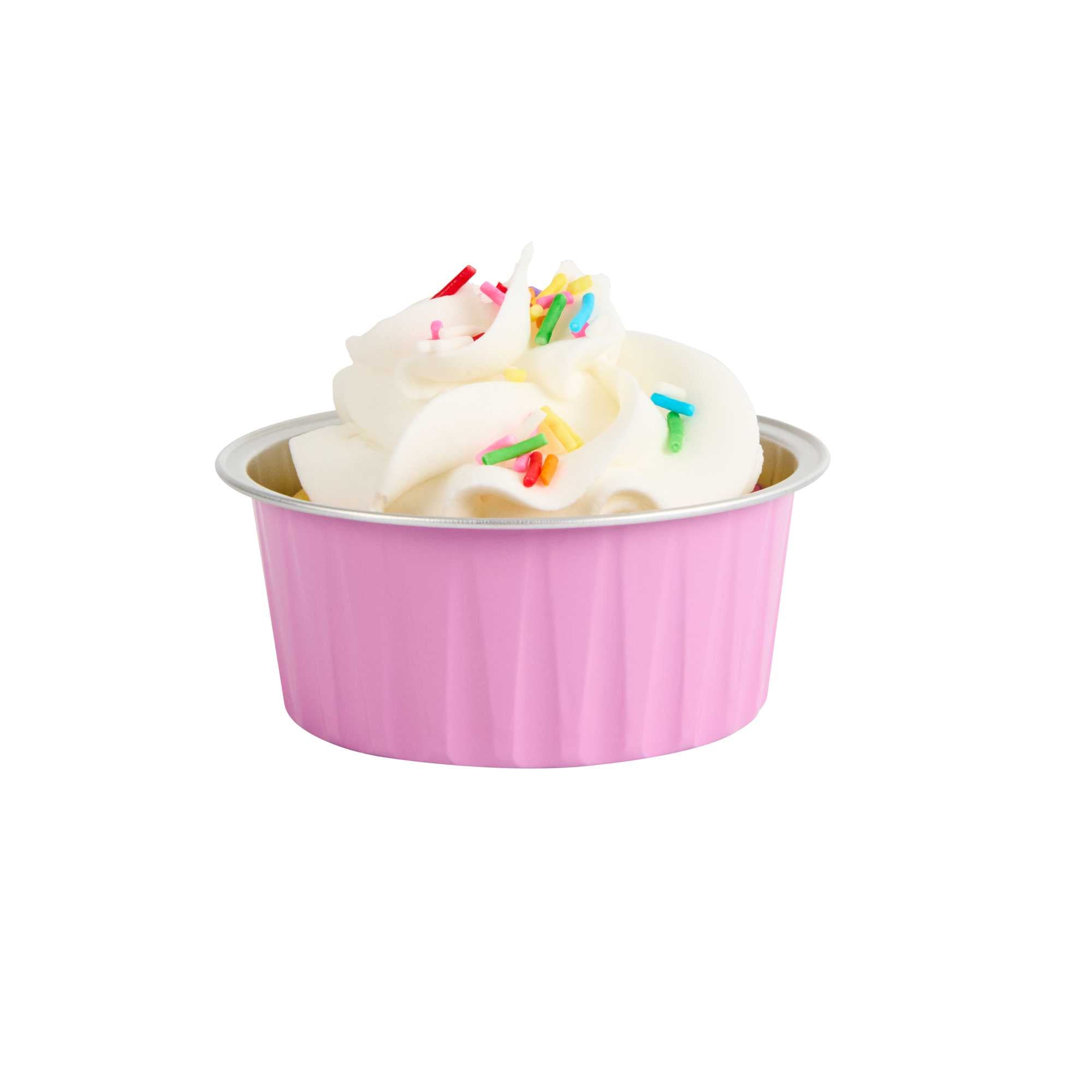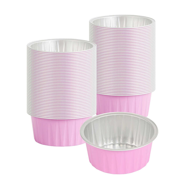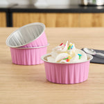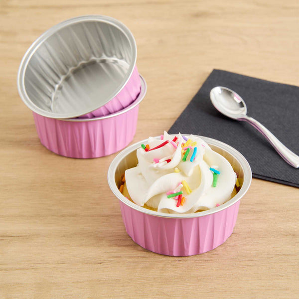 Take delight in your favorite baked goods using our Foil Lux 4-ounce Round Pink Aluminum Baking Cups. Pair these pink baking cups with our Foil Lux specially designed flat and dome plastic lids (SKU: RWM0089C and RWM0090C) to easily transport your confections. These baking cups are durable and free-standing to ensure they won't bend or break during use and can be put into the oven without a baking pan. Convenient and stylish, these pink dessert cups are freezer-safe and oven-safe up to 500F, making them ideal for baking and cooling off pastries, cupcakes, or appetizers. These muffin baking cups are also grease-resistant and scratch resistant, to make sure your desserts stay intact. With a pink finish and a stylish surface, these aluminum baking cups add a chic look to your delectable desserts. Measuring 3.25 inches wide and 1.5 inches tall, these 4-ounce disposable pink baking cups are ideal for single-serve desserts. Sold in a 100 count box. Lids available and sold separately.