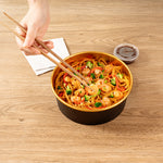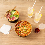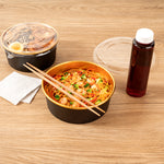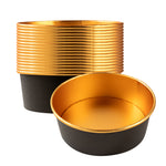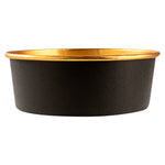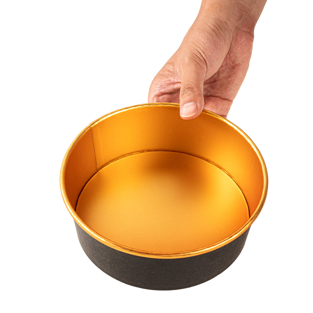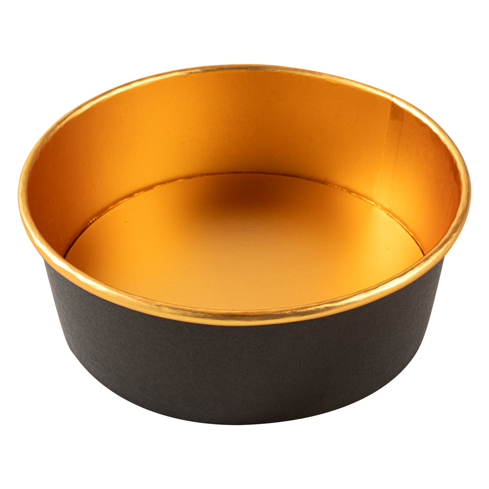 Enhance your takeaway orders with our Foil Lux 45-ounce Black And Gold Paper Take Out Containers. These greaseproof take out containers feature an insulated interior foil lining that keeps your meals fresh and warm. Made from robust paper and aluminum foil, these food containers are ideal for both hot and cold food items. These to go containers pair perfectly with our Foil Lux lids (SKU: RWM0155C) for secured on-the-go orders. The black finish of these takeaway containers adds a stylish touch to your customers' orders. For efficient food packaging, these black food containers can be easily stacked. These paper take out containers measure 7.25 inches in diameter by 2.5 inches in height, and have a capacity of 45 ounces. Sold in a 200 count box. Compatible Foil Lux lids are available and sold separately.