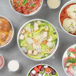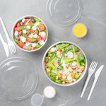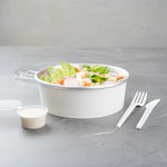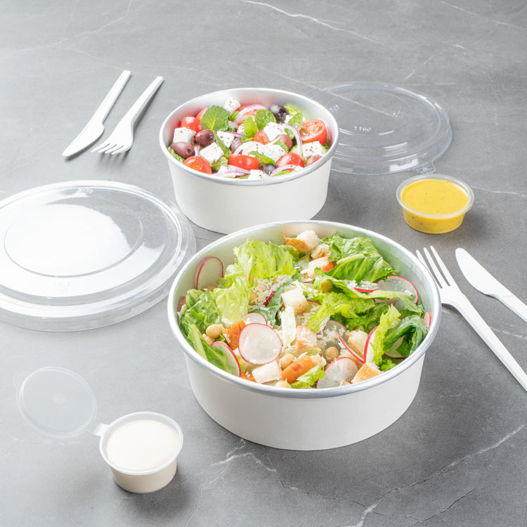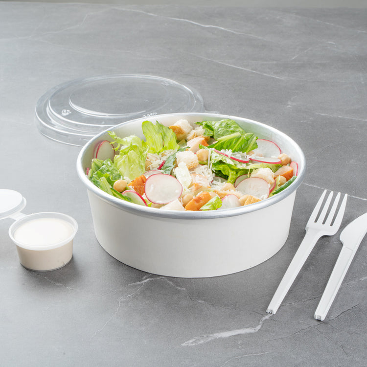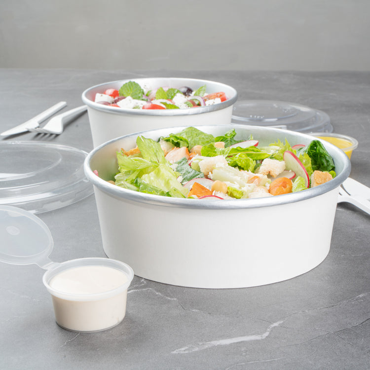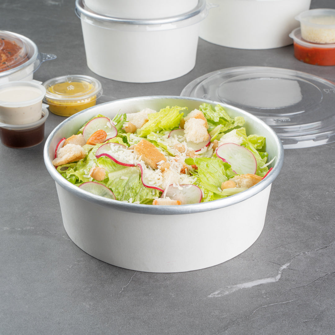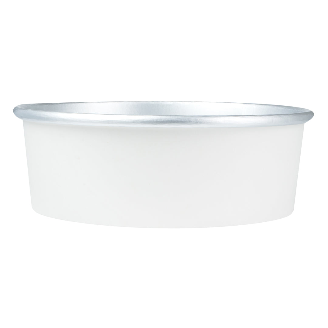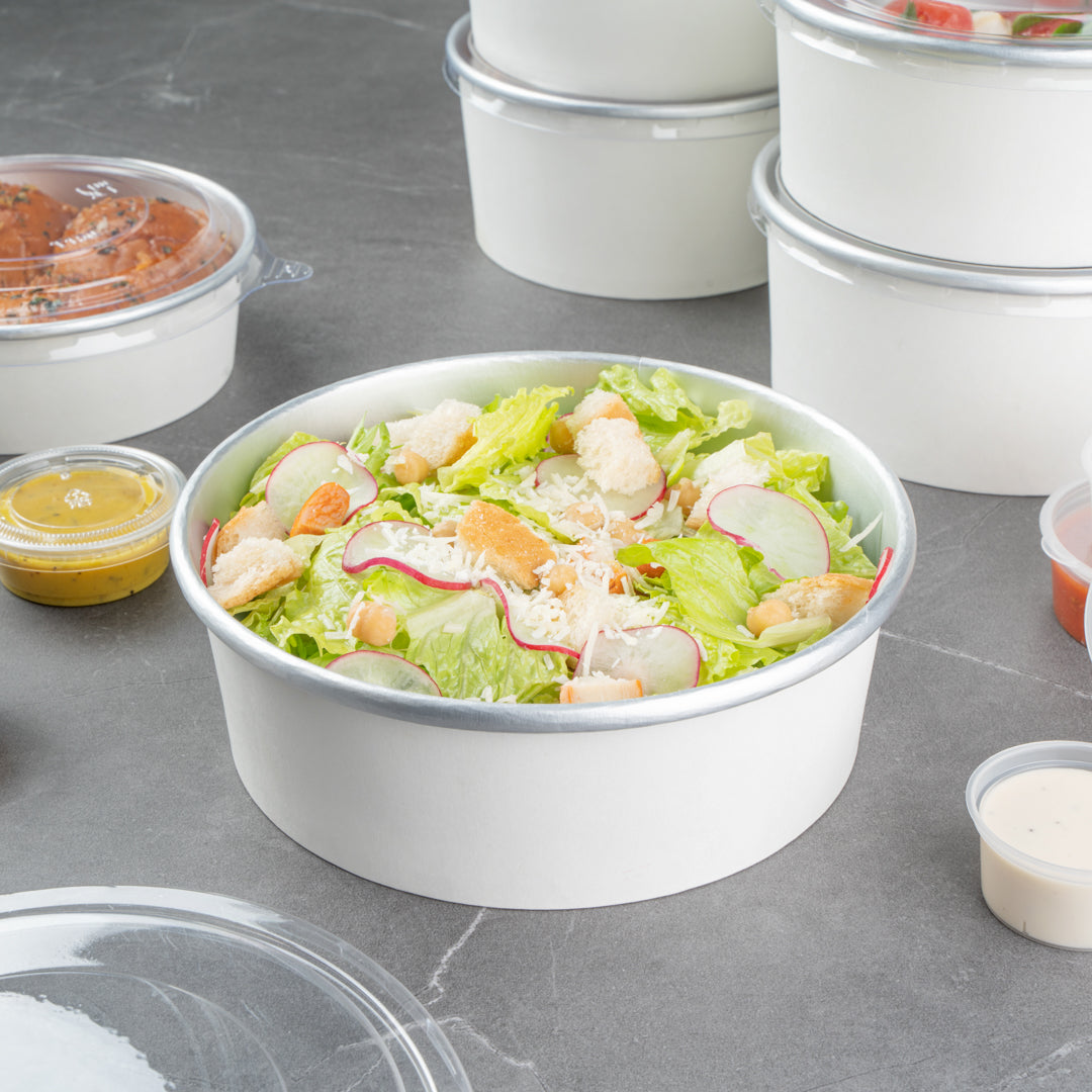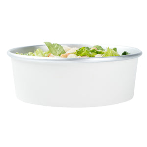 Provide your to go orders with a clean look with our Foil Lux 45-ounce White Paper Take Out Containers. These greaseproof take out containers are equipped with an insulated interior foil lining to prevent leaks and keep meals warm. To protect orders while on the go, these to go containers are compatible with our Foil Lux lids (SKU: RWM0155C). Constructed from sturdy paper and aluminum foil, these food containers are perfect for serving hot or cold foods. Featuring a white finish, these take away containers provide a classic look to your customers' food orders. To streamline meal packaging, these white food containers are stackable. These paper take out containers have a total measurement of 7.25 inches in diameter by 2.5 inches in height with a capacity of 45 ounces. Sold in a 200 count box. Compatible lids are available and sold separately.