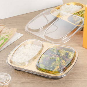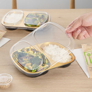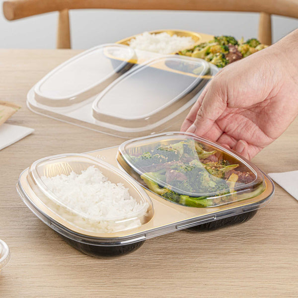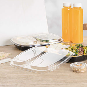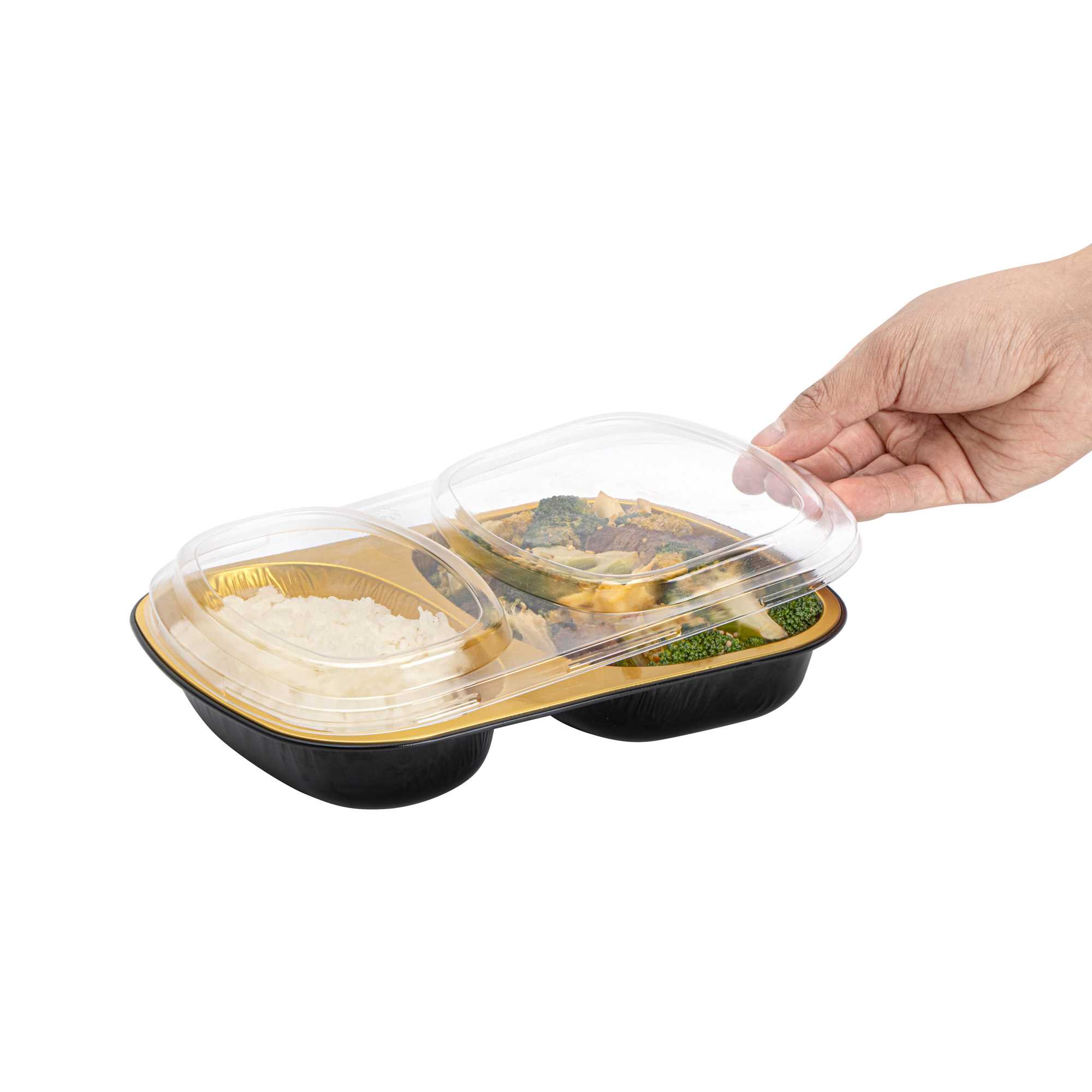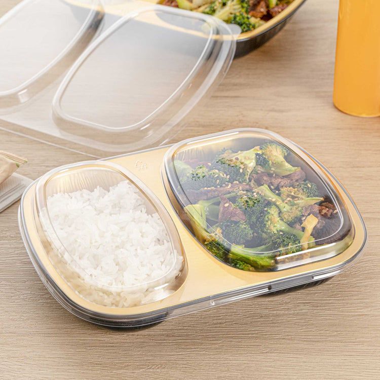 Keep entrees and sides covered during delivery using our Foil Lux Clear Plastic Flat Lids. These plastic flat lids securely snap onto our 2-compartment aluminum foil containers, so you can easily pack up to-go orders (SKU: RWM0144B). Made with premium plastic, these foil trays with lids are shatterproof to avoid messy accidents during transportation. These lids for our 28-ounce containers have a clear finish to show off meals to guests. The raised sides of these plastic lids provide ample space so you can fill up containers with hefty portions of food in each compartment. For easy and eco-friendly cleanup, these plastic flat lids are recyclable. These lids for foil containers can hold up to 28 ounces and measure 9.1 inches in length by 7.1 inches in width. Shipped in a 100 count box. Containers are available and sold separately.