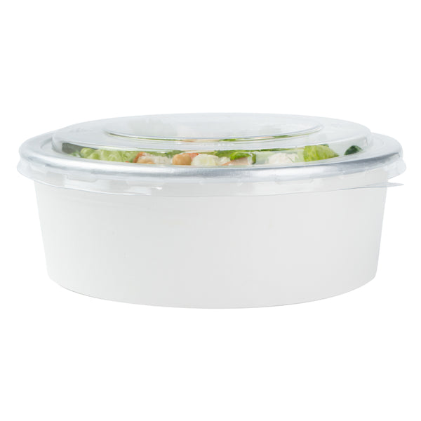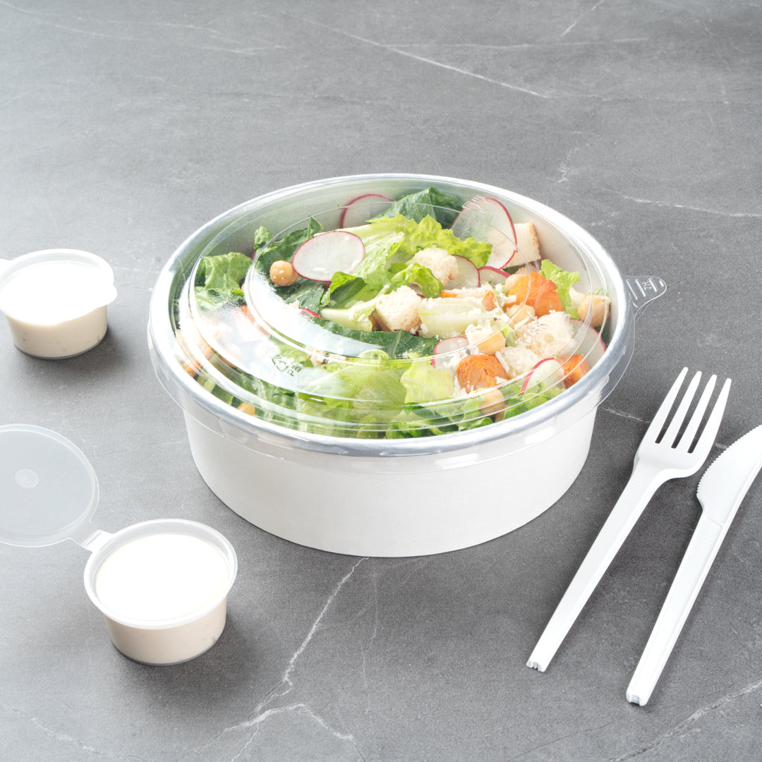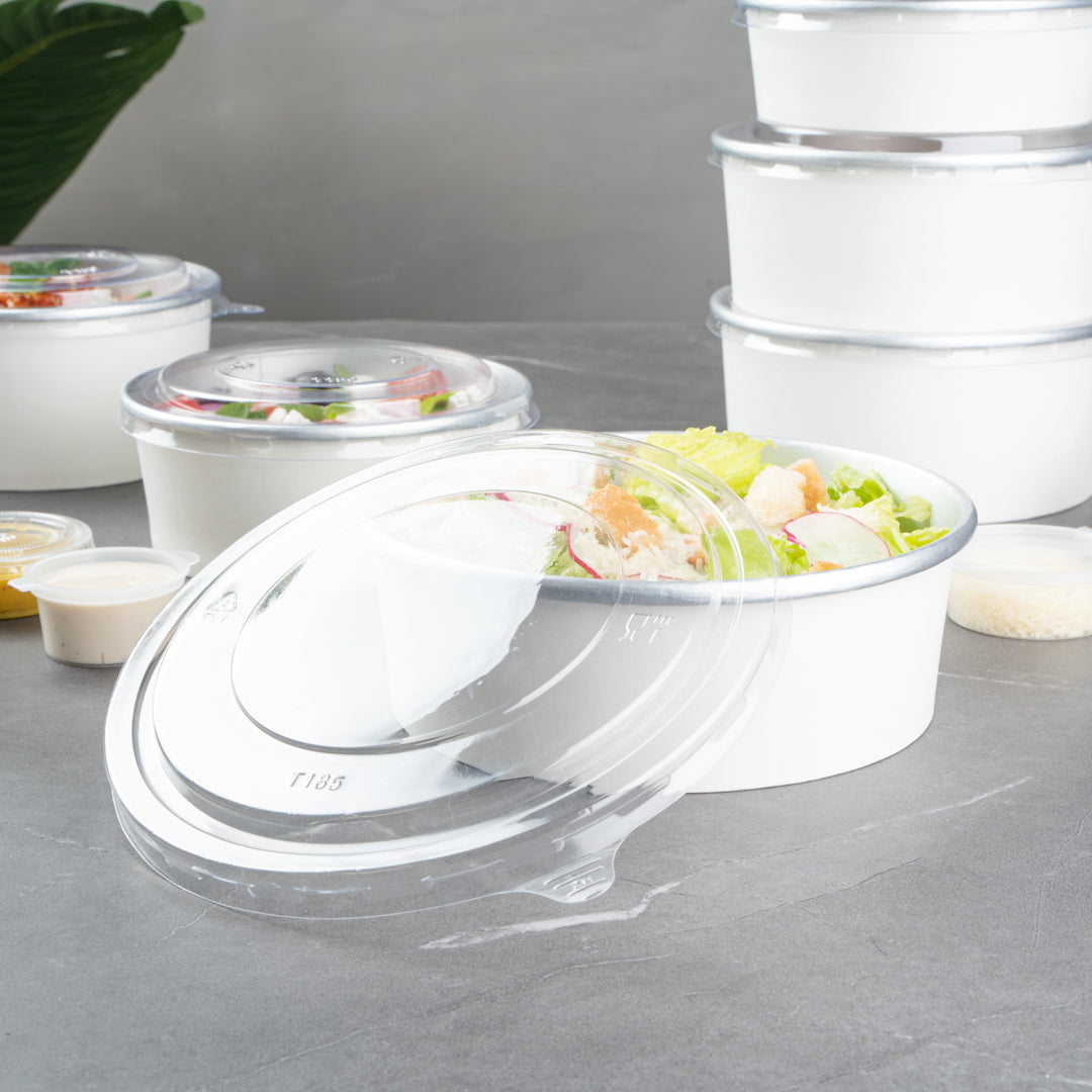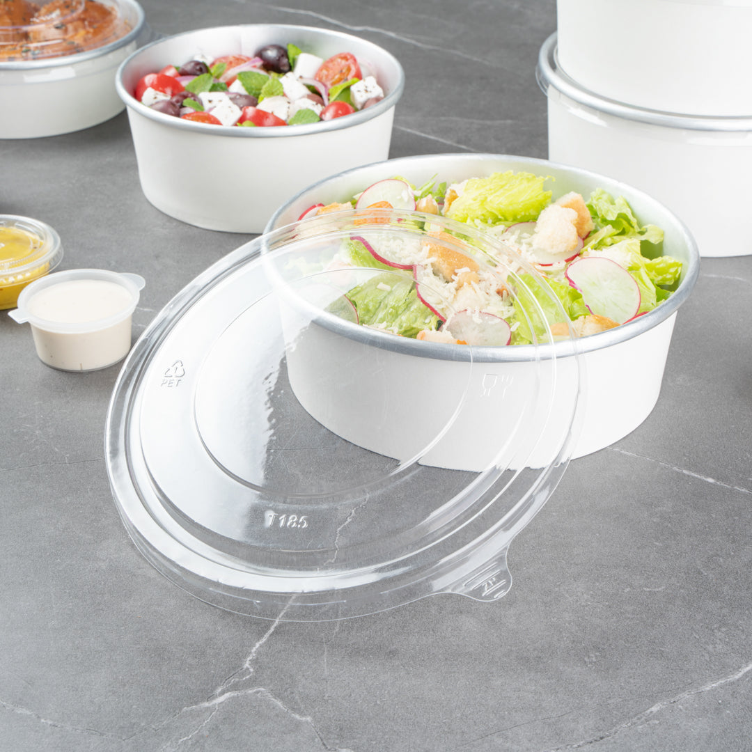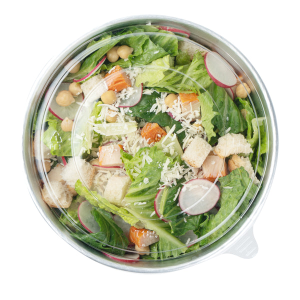 Cover take out orders using our Foil Lux Clear Plastic Take Out Container Lids. Match these clear plastic lids with our compatible Foil Lux to go containers to take meals on the go (SKU: RWM0154W). Crafted with a lift tab, these clear lids allow customers to easily open their meals without having to strain their hands or the containers. Designed from PET plastic, these lids for containers feature a crystal-clear finish to provide a view of packed foods or grab-and-go items. To save space in your establishment's kitchen or storage area, these transparent lids are stackable. For a shortened cleanup process, these plastic to go container lids are recyclable. These to go lids fit 45-ounce containers and measure 7.3 inches in diameter. Sold in a 200 count box. Compatible Foil Lux containers are available and sold separately.