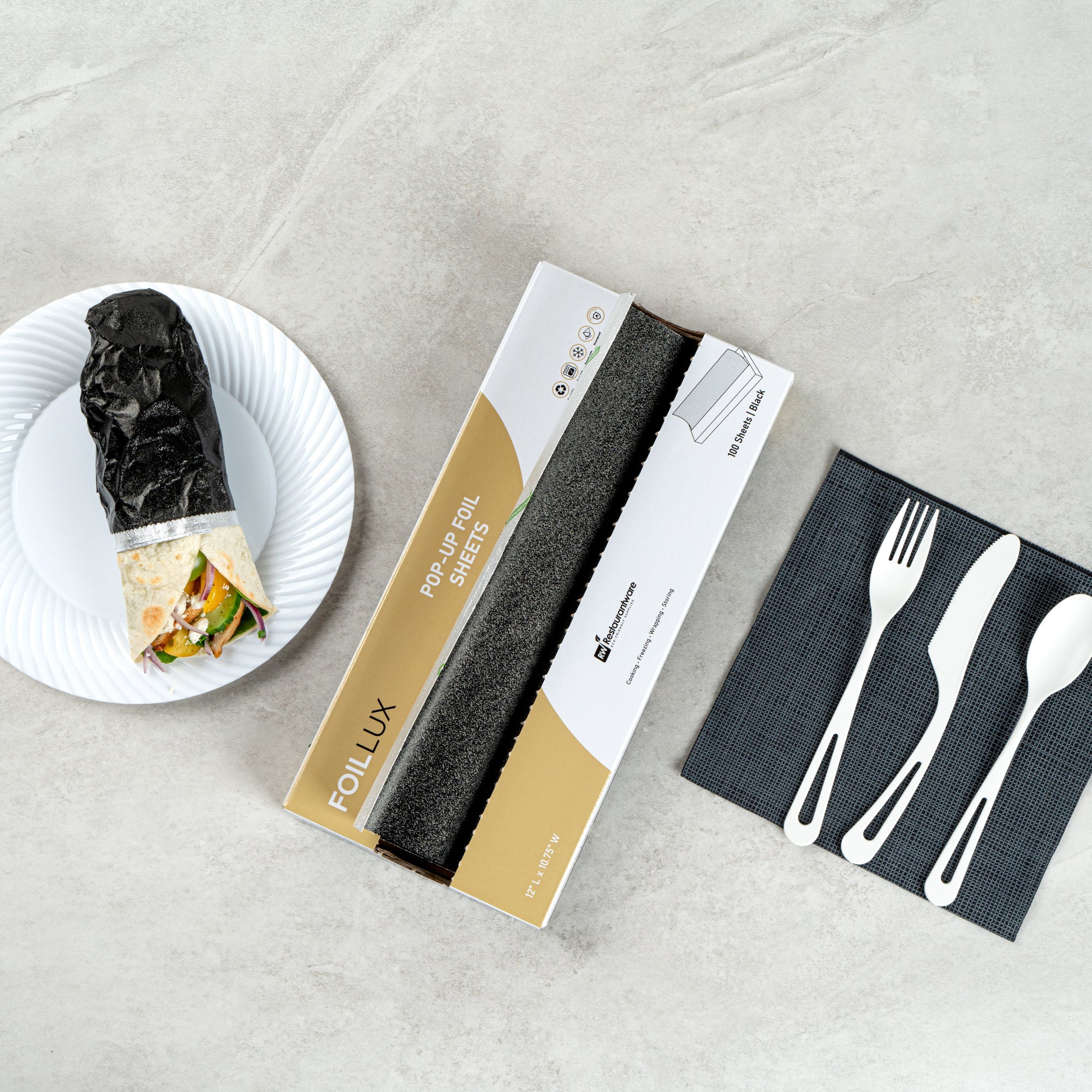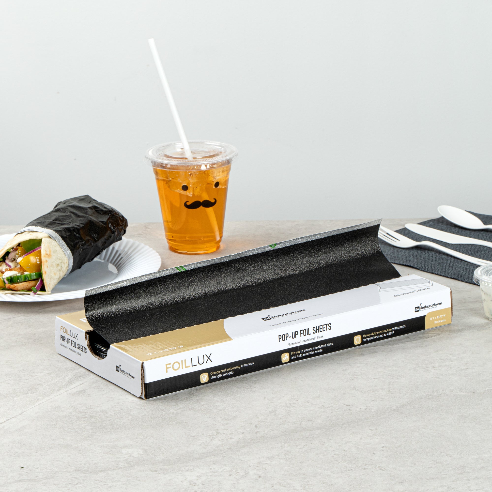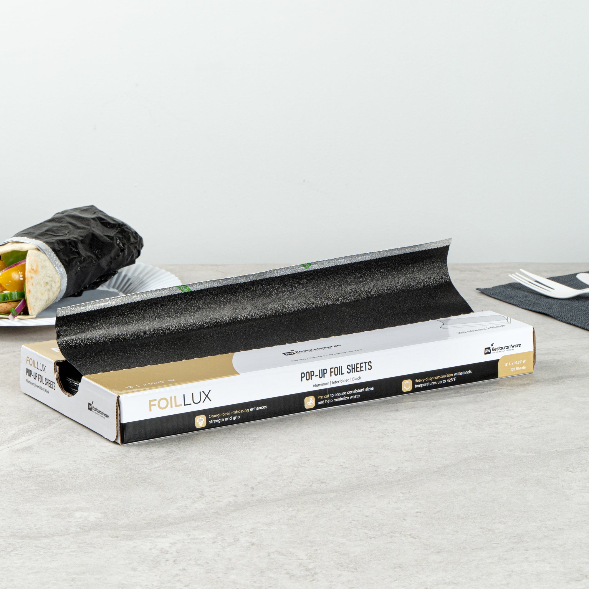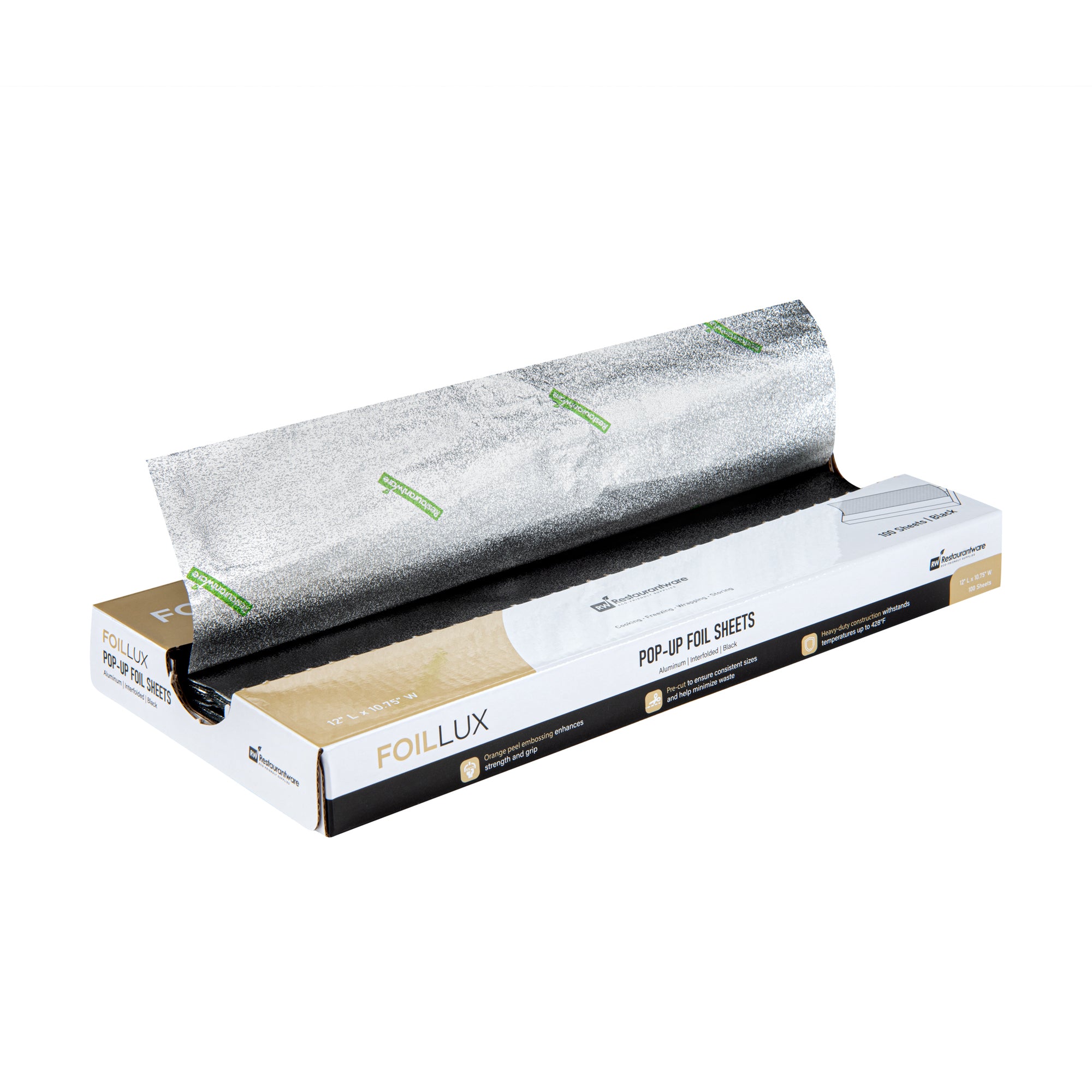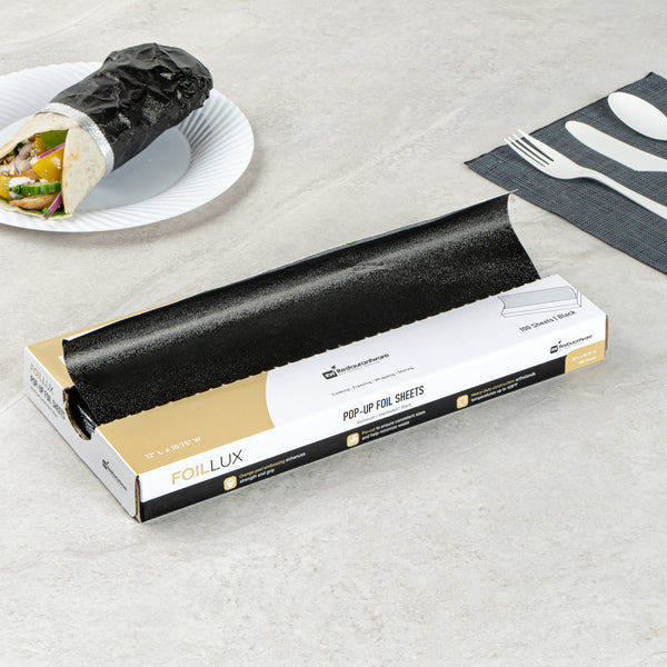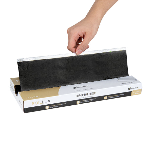 Provide a perfect symbiosis of functionality and aesthetics with our Foil Lux Foodservice Black Aluminum Foil Pop-Up Sheets. These impeccably crafted aluminum foil sheets offer the best of both worlds, with their remarkable sturdiness and visually appealing orange peel embossing. The durable aluminum construction of these embossed foil papers ensures heat resistance up to 428°F. These disposable pop-up foil sheets are effortlessly recyclable. The interfolded design further simplifies their usage, making these pre-cut foil sheets the go-to choice in fast-paced food environments that demand efficiency. Ensuring food safety and storage is top-notch, these greaseproof aluminum paper sheets are designed to be freezer-safe and oven-safe. Precisely pre-cut to dimensions of 12 inches in length and 10.75 inches in width, these foil sheets for food make wrapping various items, from burgers and hot dogs to baked potatoes, a breeze. Sold in a 2,000 count box.