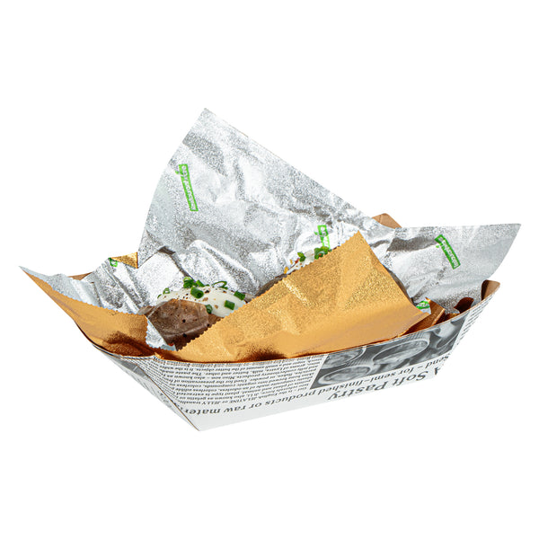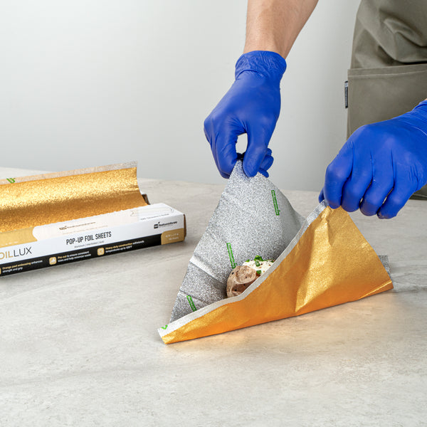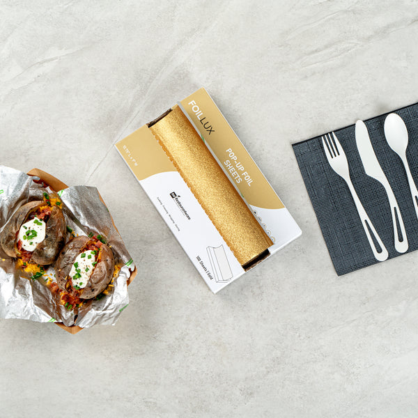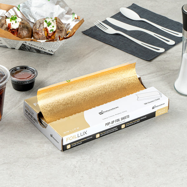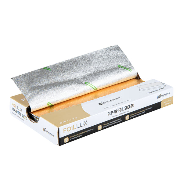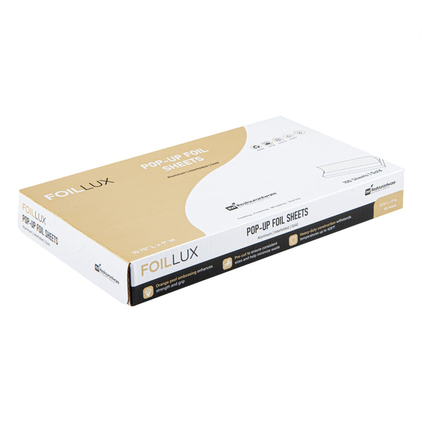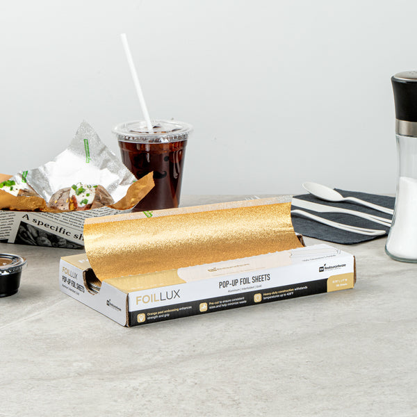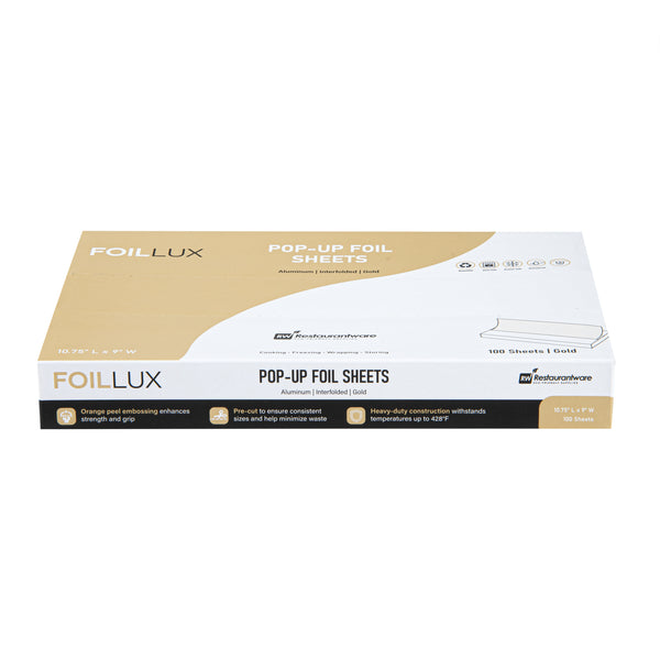 Streamline your cooking, storage, and serving processes with our Foil Lux Foodservice Gold Aluminum Foil Pop-Up Sheets. With a durable aluminum construction capable of withstanding high temperatures without deformation, these pre-cut foil sheets facilitate rapid and efficient food service, cutting out the inconvenience of unrolling and cutting traditional foil rolls. These kitchen foil sheets, distinctive with their orange peel embossing have a premium appearance and provide a robust grip for safe and easy food handling. The interfolded design of these aluminum paper sheets assures mess-free use and assists in keeping foods separate and identifiable for kitchen staff. These disposable foil sheets for food align with our commitment to the environment, being recyclable. Withstanding temperatures up to 428F, these pop-up foil sheets are safe for freezing and baking. Cleanup is effortless as these embossed foil papers are greaseproof. Ideal for concession stands, fast food restaurants, or snack bars, these aluminum foil sheets measure 10.75 inches long by 9 inches wide. Sold in a 100 count box.