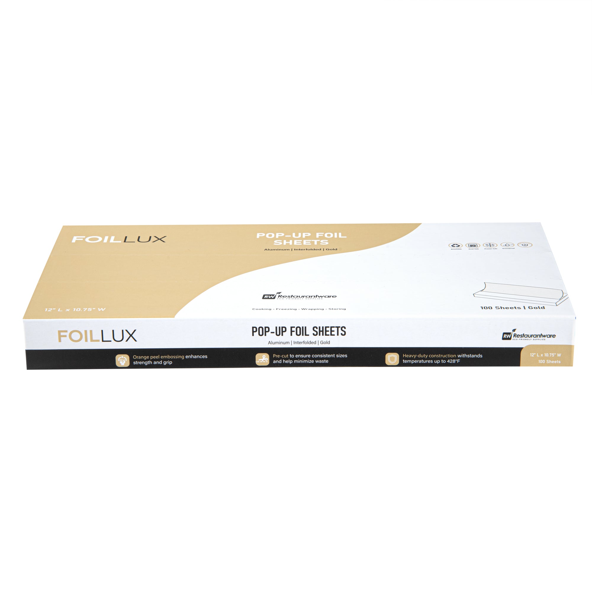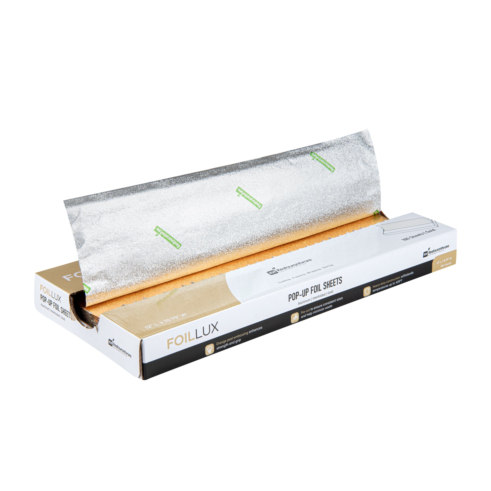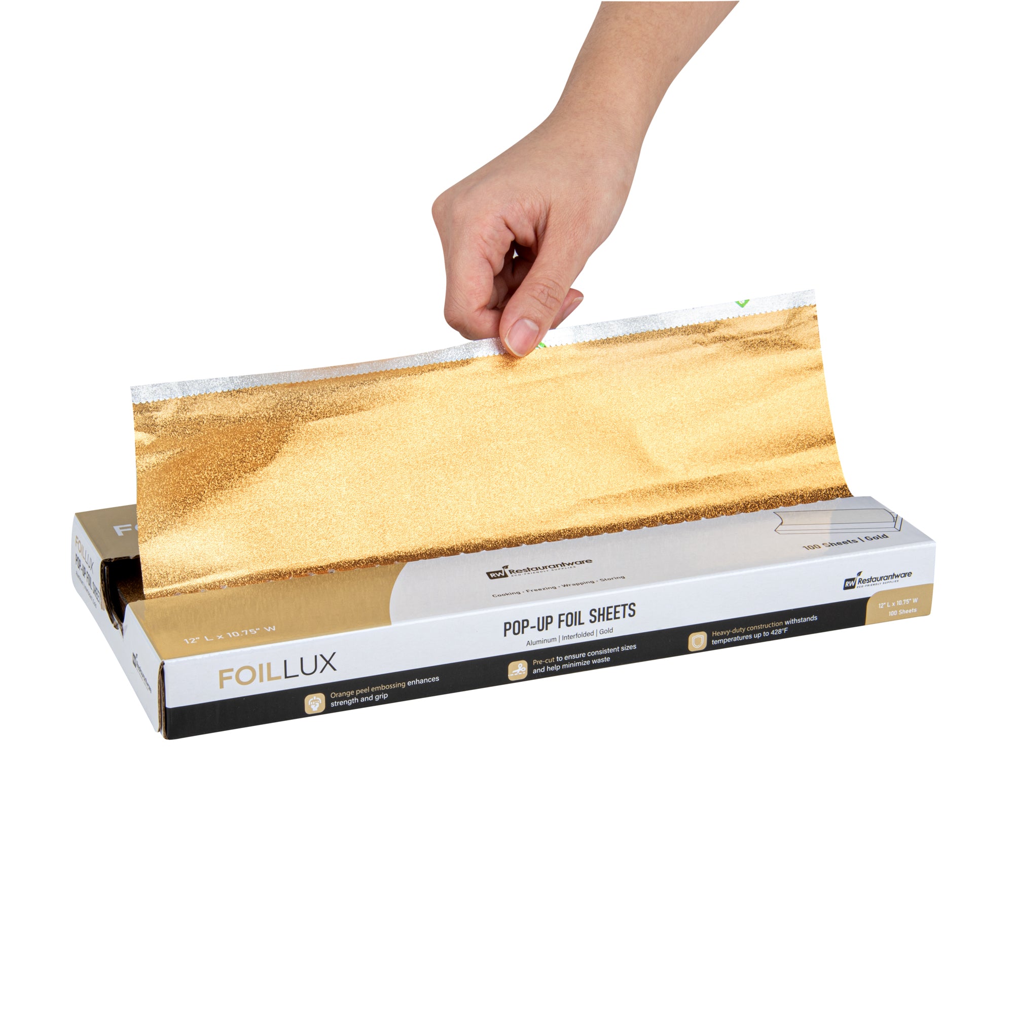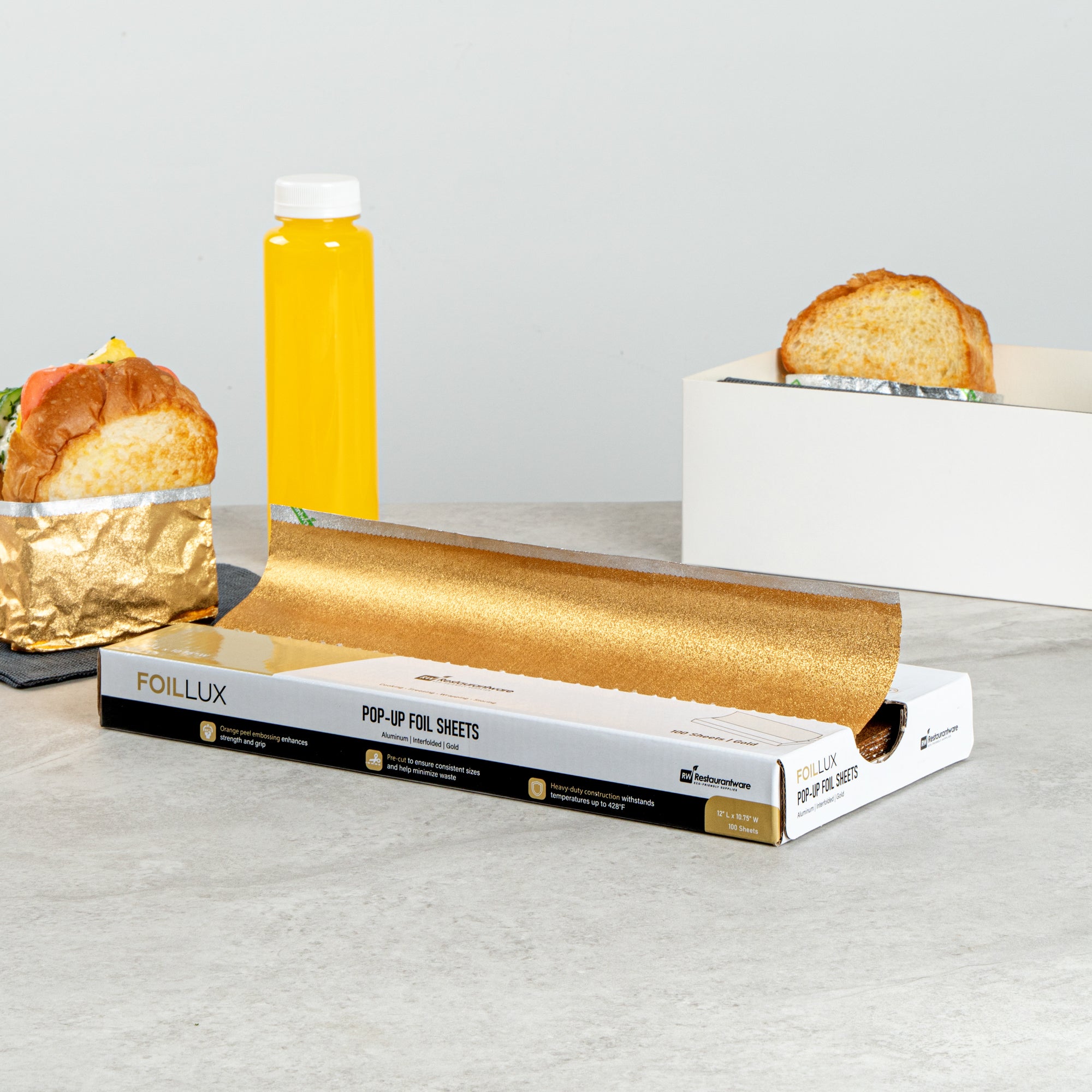 Boost your kitchen's efficiency with our Foil Lux Foodservice Gold Aluminum Foil Pop-Up Sheets. The high-quality, durable aluminum construction of these pre-cut foil sheets offers robust resistance to temperatures up to 428F, ensuring oven-safe and freezer-safe use. These pop-up foil sheets feature unique orange peel embossing, adding sophistication to your food presentation. The interfolded design of these foil sheets for food ensures ease of separation without the need for a blade, promoting sanitation and minimizing contact. With a greaseproof design, these aluminum foil sheets prevent messes while packing saucy foods. Say goodbye to the trouble of traditional foil rolls with these disposable and recyclable aluminum paper sheets, ready for immediate use and helping reduce waste and save time. Measuring 12 inches in length by 10.75 inches in width, these premium embossed foil paper sheets help retain heat on various foods, making them a kitchen must-have. Sold in a 2,000 count box.