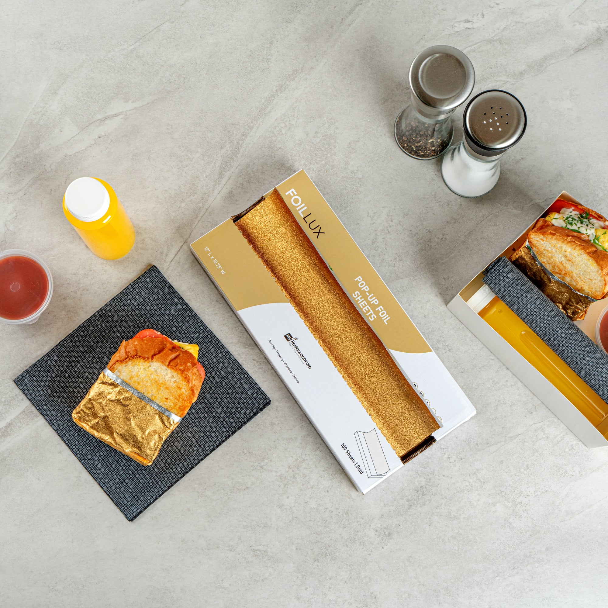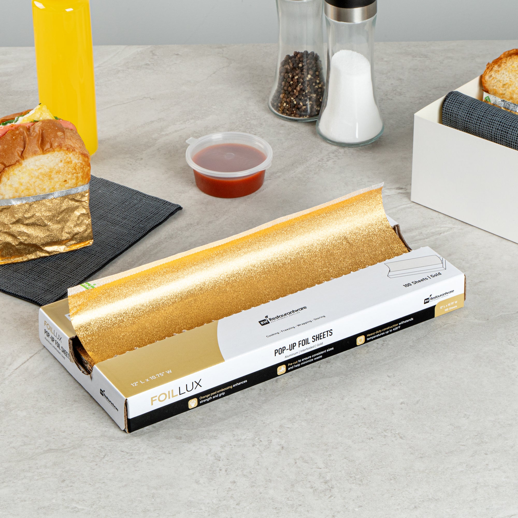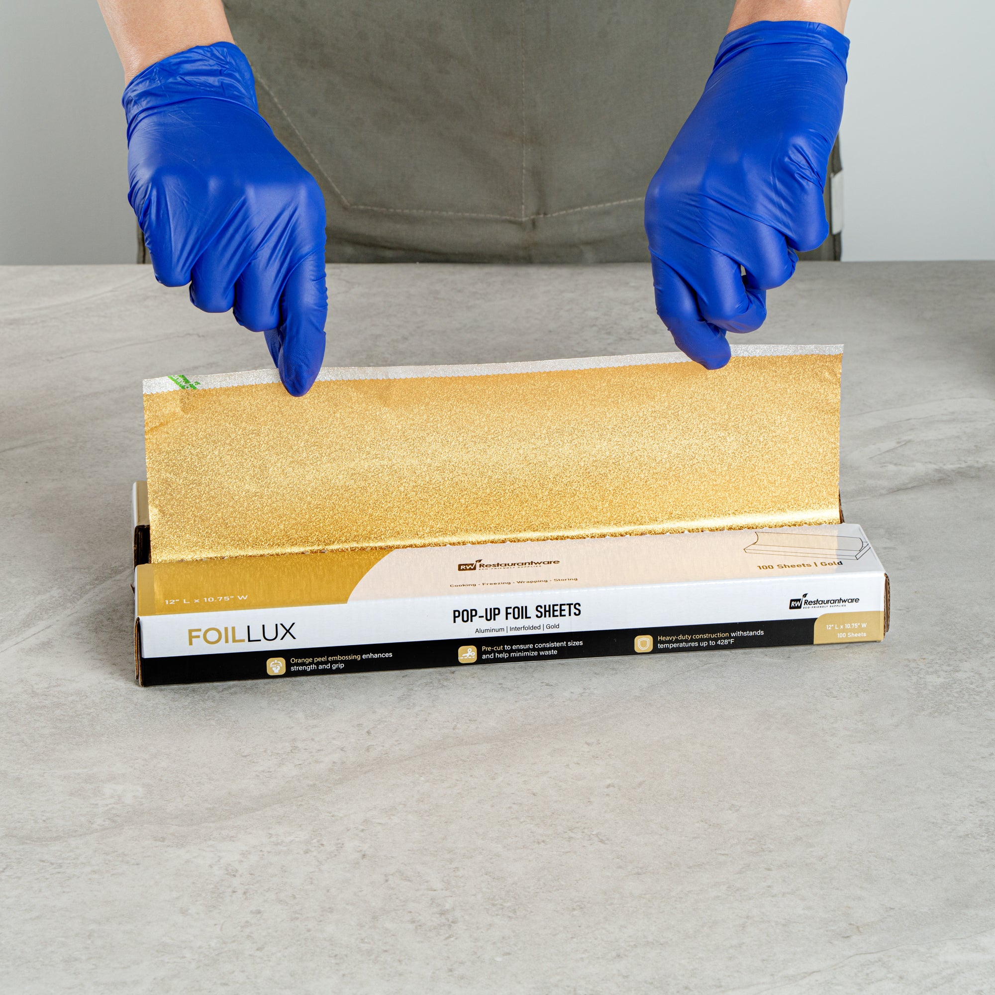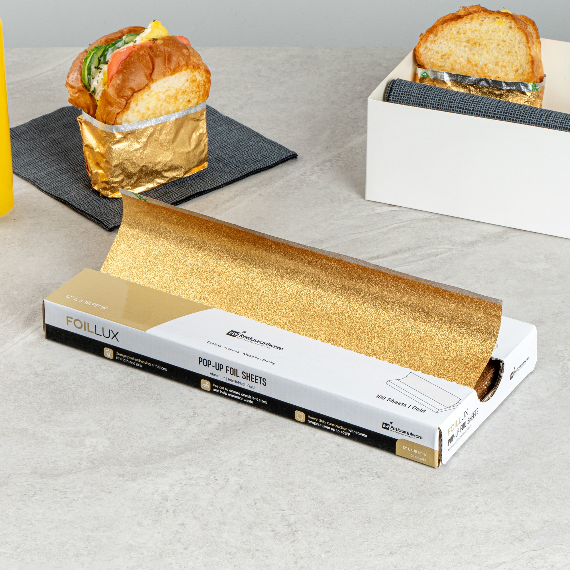 Boost your kitchen's efficiency with our Foil Lux Foodservice Gold Aluminum Foil Pop-Up Sheets. The high-quality, durable aluminum construction of these pre-cut foil sheets offers robust resistance to temperatures up to 428F, ensuring oven-safe and freezer-safe use. These pop-up foil sheets feature unique orange peel embossing, adding sophistication to your food presentation. The interfolded design of these foil sheets for food ensures ease of separation without the need for a blade, promoting sanitation and minimizing contact. With a greaseproof design, these aluminum foil sheets prevent messes while packing saucy foods. Say goodbye to the trouble of traditional foil rolls with these disposable and recyclable aluminum paper sheets, ready for immediate use and helping reduce waste and save time. Measuring 12 inches in length by 10.75 inches in width, these premium embossed foil paper sheets help retain heat on various foods, making them a kitchen must-have. Sold in a 2,000 count box.