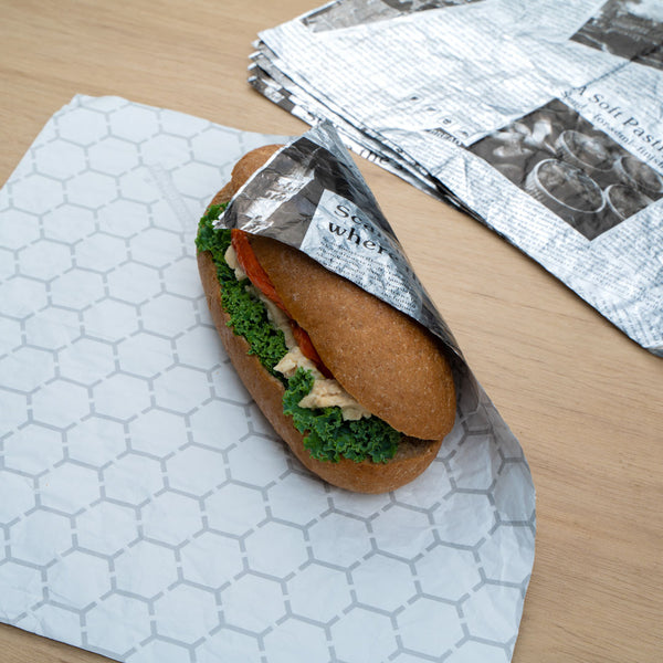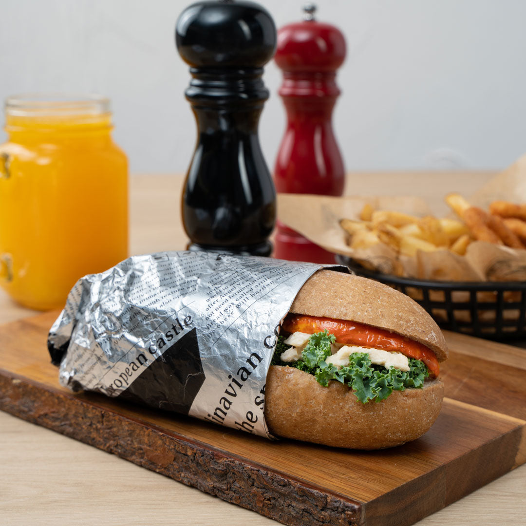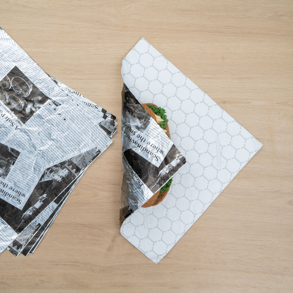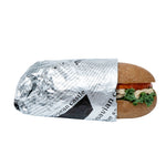 Provide customers with a mess-free way to enjoy burgers or sandwiches using our Foil Lux Rectangle Newsprint Aluminum Sandwich Wrap Sheets. Crafted from premium aluminum foil and paper, these insulated foil sandwich wrap sheets are specially built to lock in the heat of dishes to keep them warm and flavorful. With a greaseproof design, these wrap sheets prevent oils and sauces from leaking through to keep your patrons' hands clean while enjoying meals. These aluminum sandwich wraps feature a newsprint design that brings a charming look to meals while providing guests with an interactive dining experience. Measuring 12 inches long by 12 inches wide, these basket liner sheets are conveniently pre-cut to eliminate the hassle of measuring and cutting liners at your food truck, fast-casual restaurant, or cafeteria. Shipped in a 500 count box.