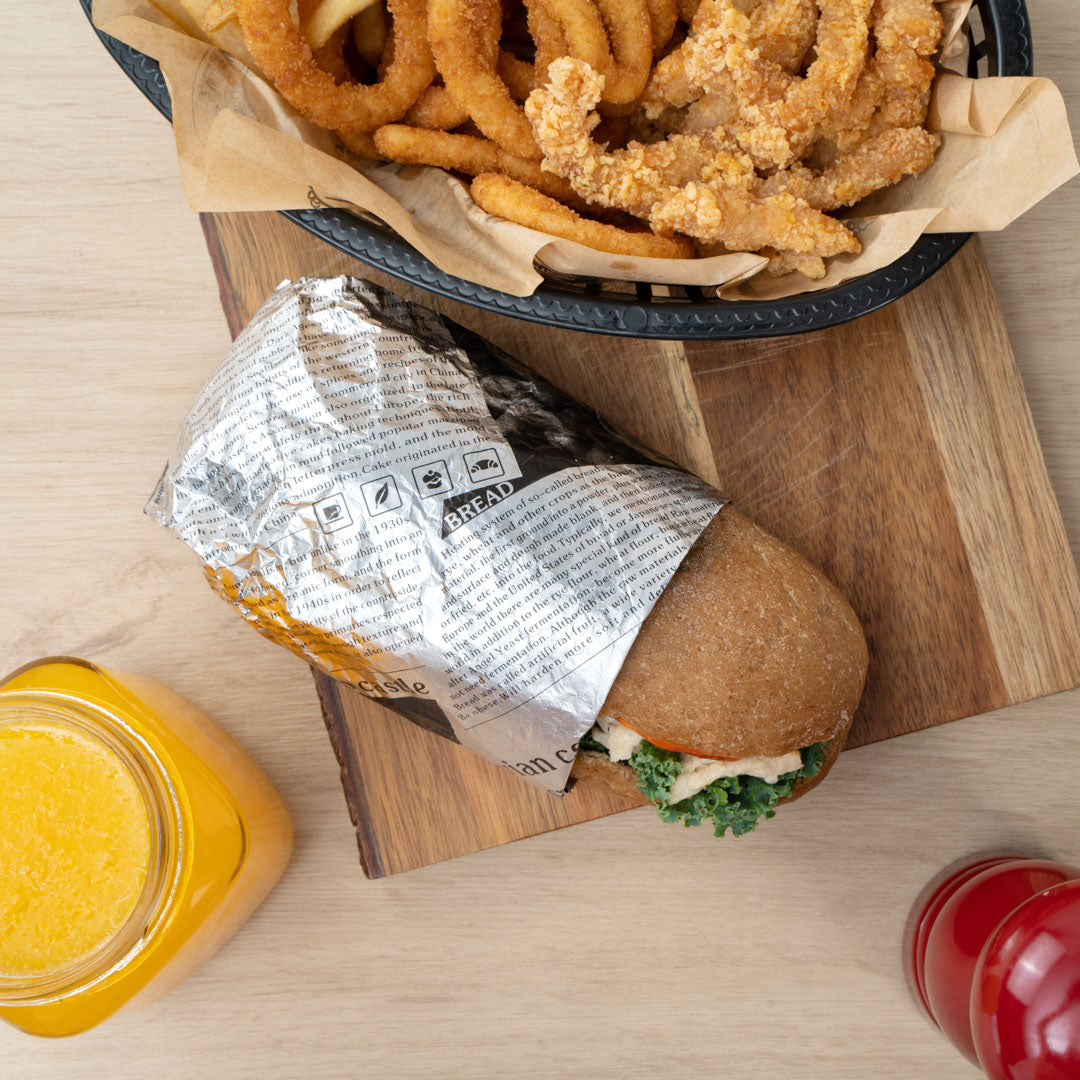 - Vintage newspaper print brings a charming design to the food items beings served