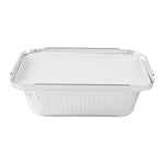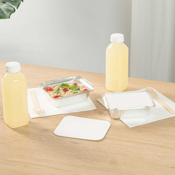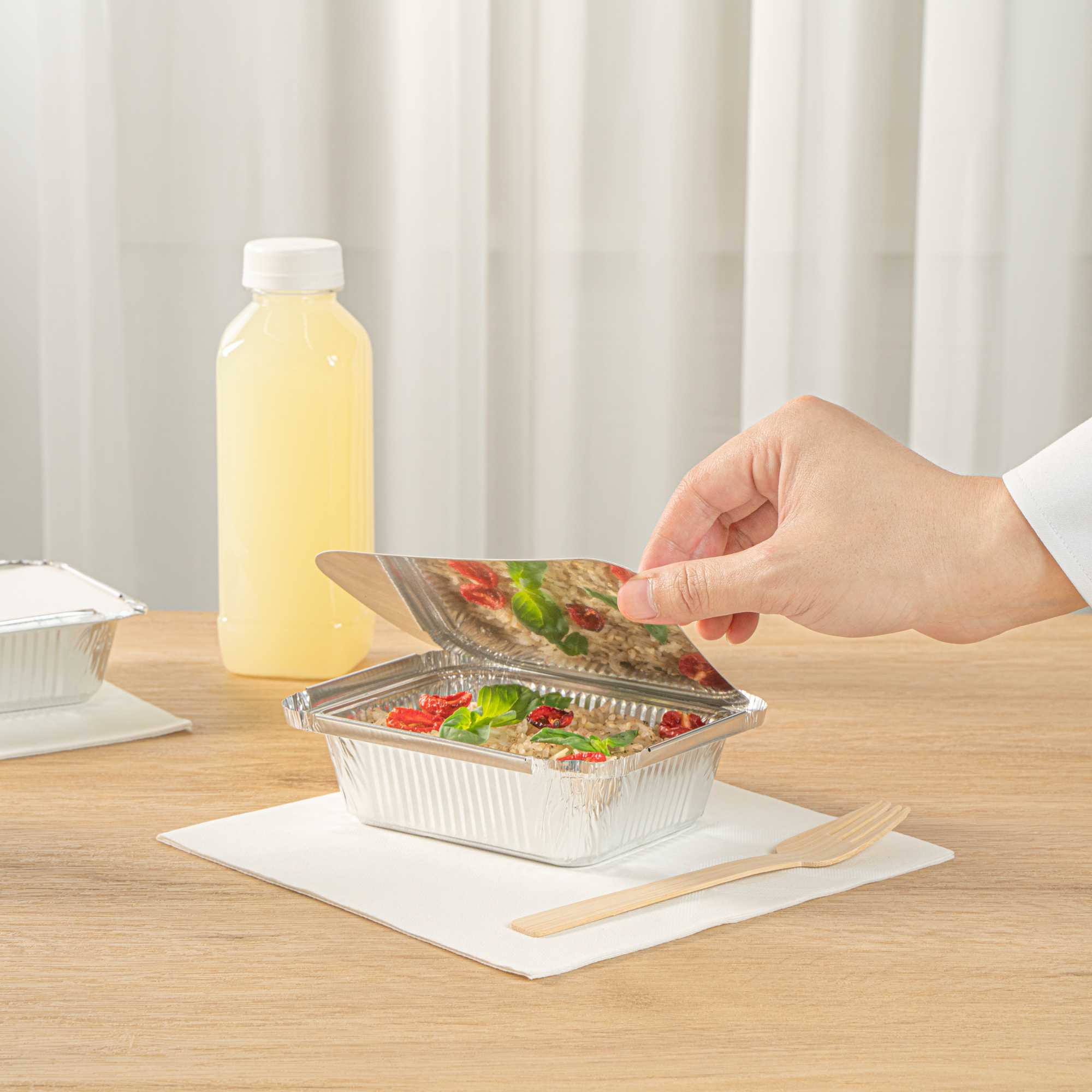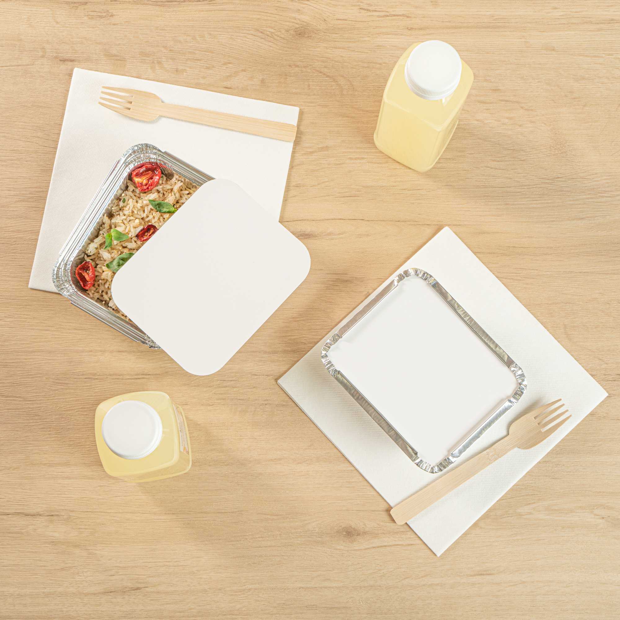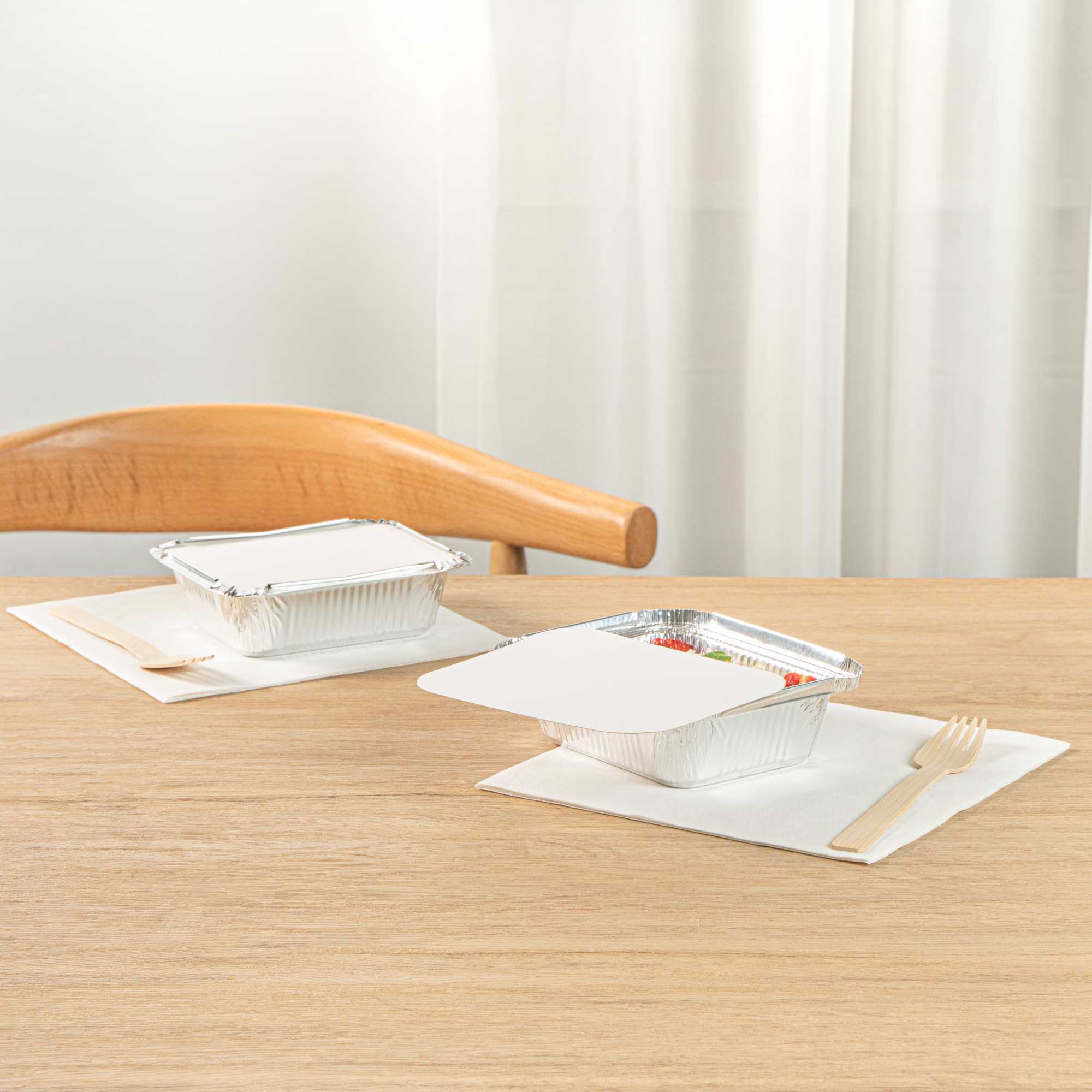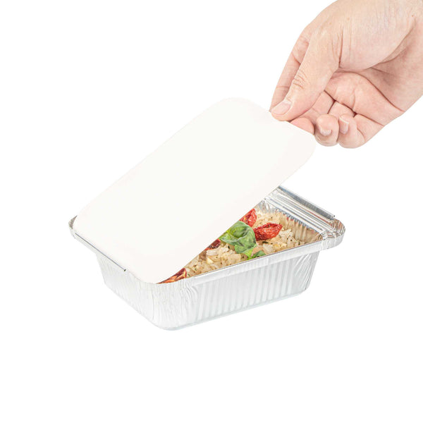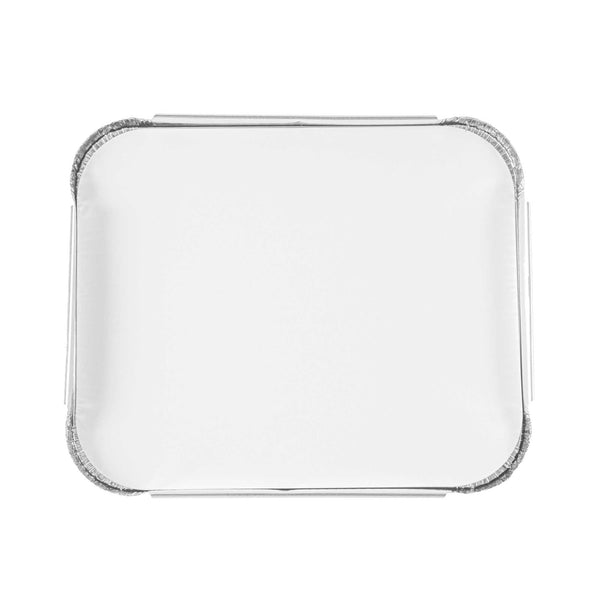 Ensure your meals arrive fresh with secure, contamination-free packaging. Foil Lux White Disposable Foil Lid offers a secure enclosure that perfectly seals compatible containers, maintaining the integrity of your dishes. Constructed from durable foil paper, its foil-laminated side enhances temperature retention, ensuring that your meals remain warm and delicious, making this disposable foil lid indispensable for takeout operations. The plain white board surface allows for easy labeling, providing quick food identification that streamlines kitchen operations. With dimensions of 5.5 inches by 4.5 inches, this aluminum foil lid is designed to fit snugly, offering reliable protection for your culinary creations. Ideal for covering food trays, this food container lid ensures that your offerings remain uncontaminated and presentable during transit. Elevate the efficiency of your foodservice establishment with this essential tool. Sold in a 100 count box.