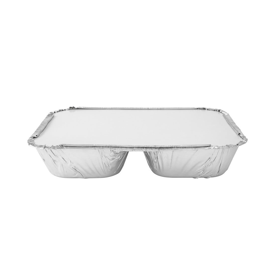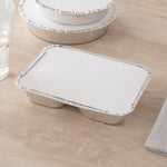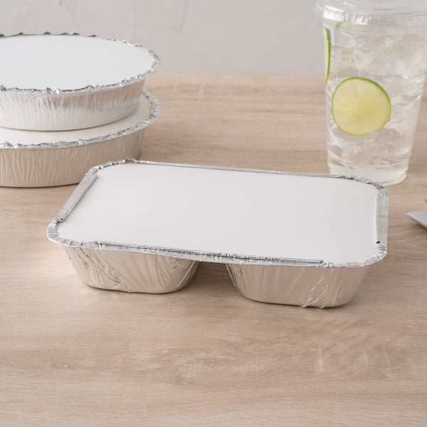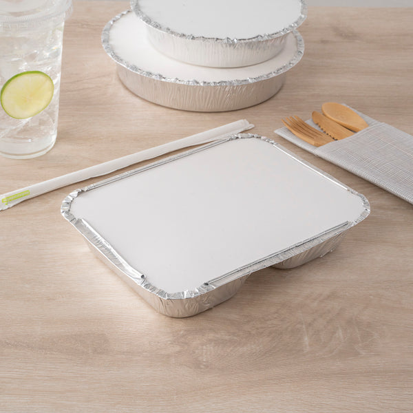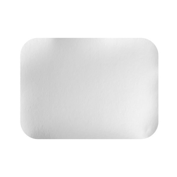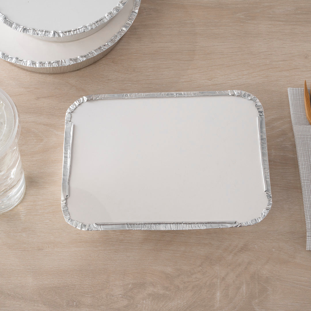 Securely transport meals using our Foil Lux Rectangle White Paper Flat Foil-Laminated Board Lids. These lids for trays perfectly pair with our 3-compartment aluminum take out trays to easily package entrees and sides for delivery (SKU: RWM0137S). Crafted from foil laminated cardboard, these aluminum foil trays with lids feature an interior foil lining that expertly retains heat to keep foods at an ideal temperature before serving. These foil trays with covers have a bright white finish that allows you to label orders or place stickers onto containers so that meals are easy to identify. These lids for take out trays are disposable for quick cleanup. Each flat lid measures 8.5 inches in length and 6.4 inches in width. Shipped in a 100 count box.
