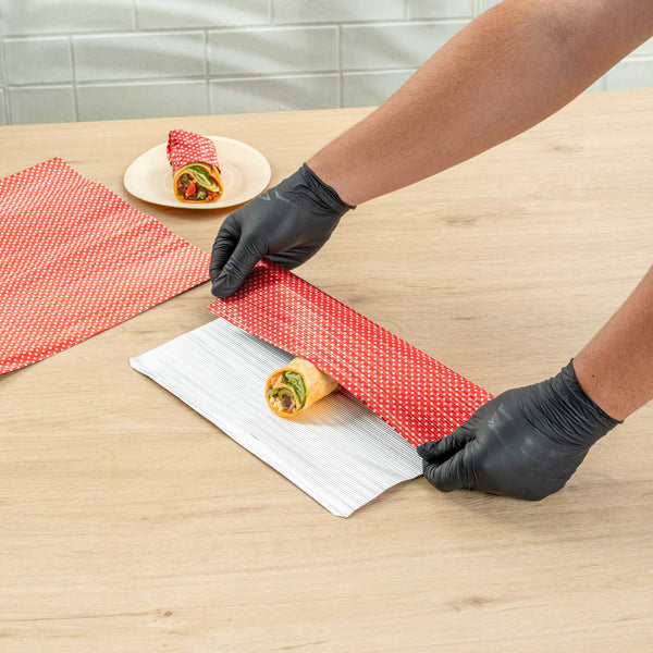 Keep foods fresh and tasty with our Foil Lux Red Polka Dot Ripple Aluminum Wraps and Basket Liners. Use these insulated food wraps to package hot dogs, hamburgers, and gyros -- or use these food-safe aluminum foil sheets to line french fry baskets or tortilla chip baskets. Forget about the hassle of cutting or ripping foil from the box -- these stylish foil wraps are pre-sized and cut into 12 inch x 12 inch squares. Greaseproof, heat-resistant, and freezer-safe, these versatile foil sheets are designed to keep your hot or cold foods delicious and enjoyable. Featuring an eye-catching red and white polka dot design, these rippled foil sandwich wraps are an attractive addition to diners, cafes, and food trucks. Available in bulk 500 count boxes.