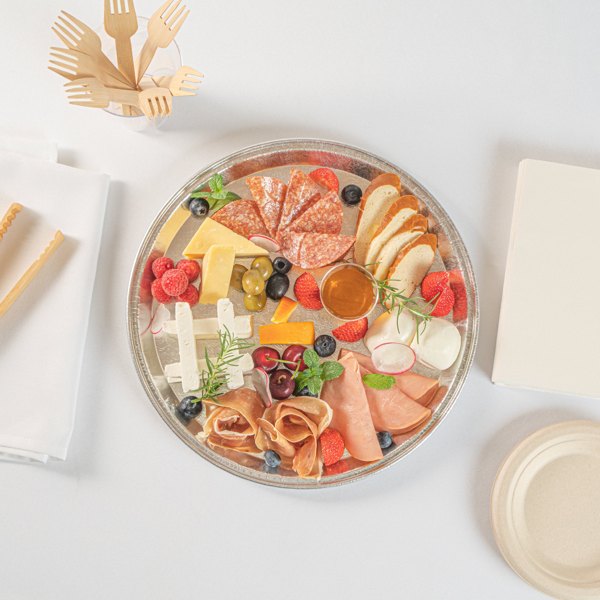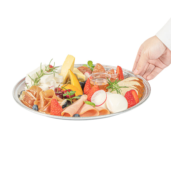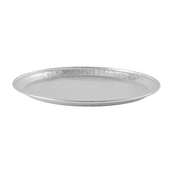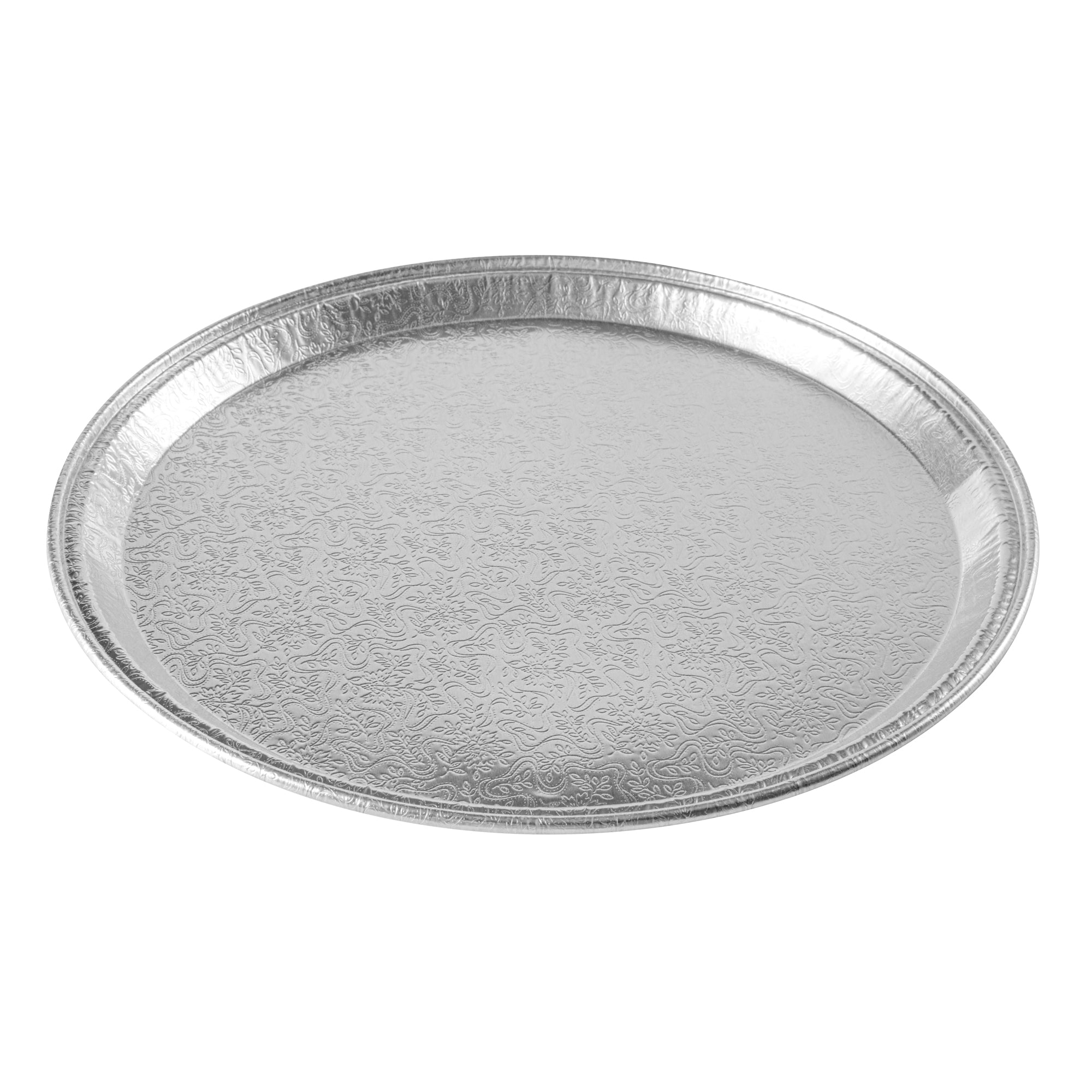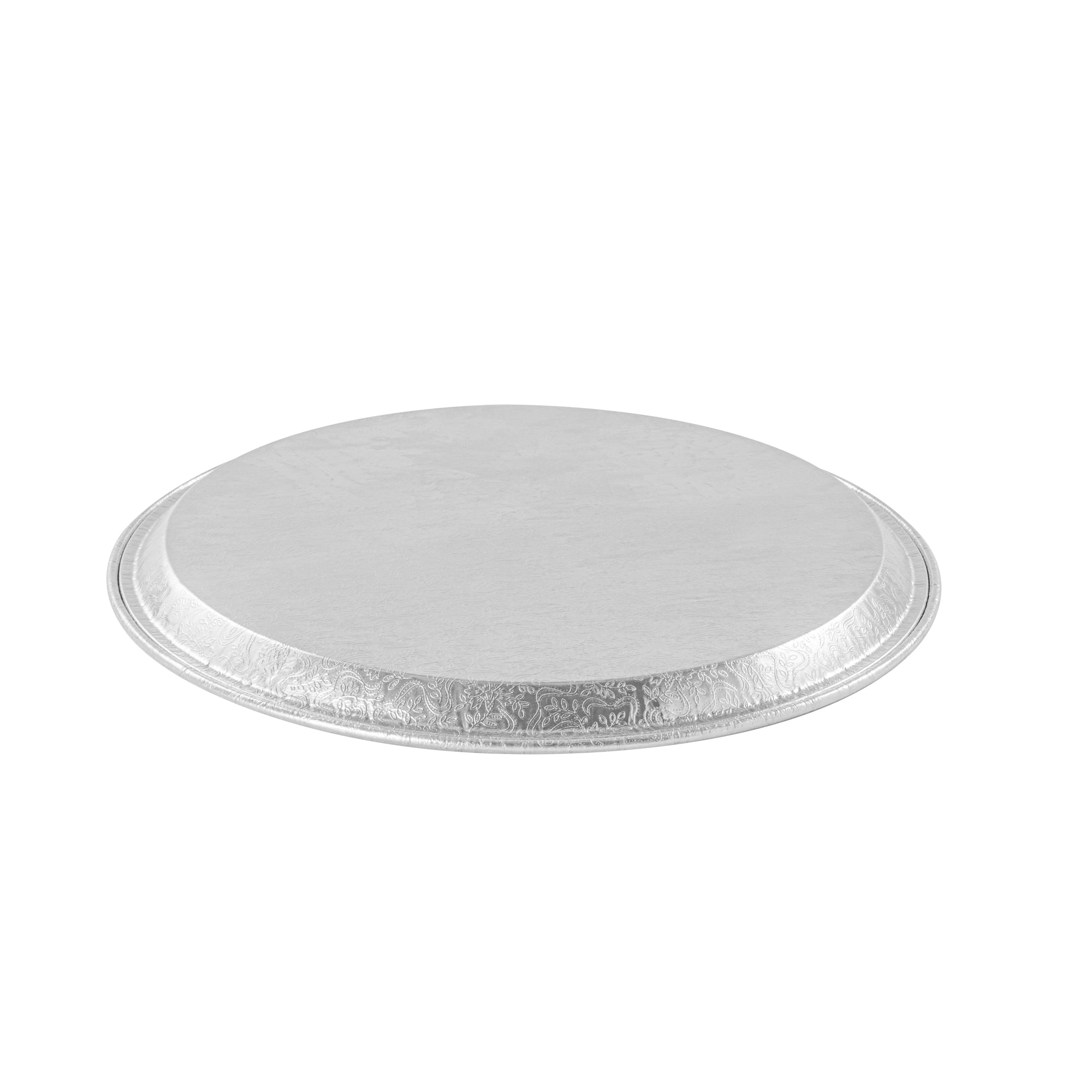Ensure your pizzas stay fresh and delicious with our Foil Lux Freshness-Sealing Pizza Tray. This 12 inch pizza tray, crafted from durable aluminum, features a compatible lid that securely seals to maintain freshness during storage or transport, perfect for busy pizzerias and catering events. Its intricate engraved pattern not only elevates the presentation of your dishes but also makes each serving an irresistibly appealing centerpiece, making it ideal for round foil catering trays. The premium aluminum construction offers exceptional durability, capable of withstanding the demands of rigorous catering environments, and is recyclable and disposable, providing a sustainable and convenient solution for disposable serving platters. Enhance your foodservice's efficiency and presentation by integrating these trays into your operations today. Sold in a 10 count box.