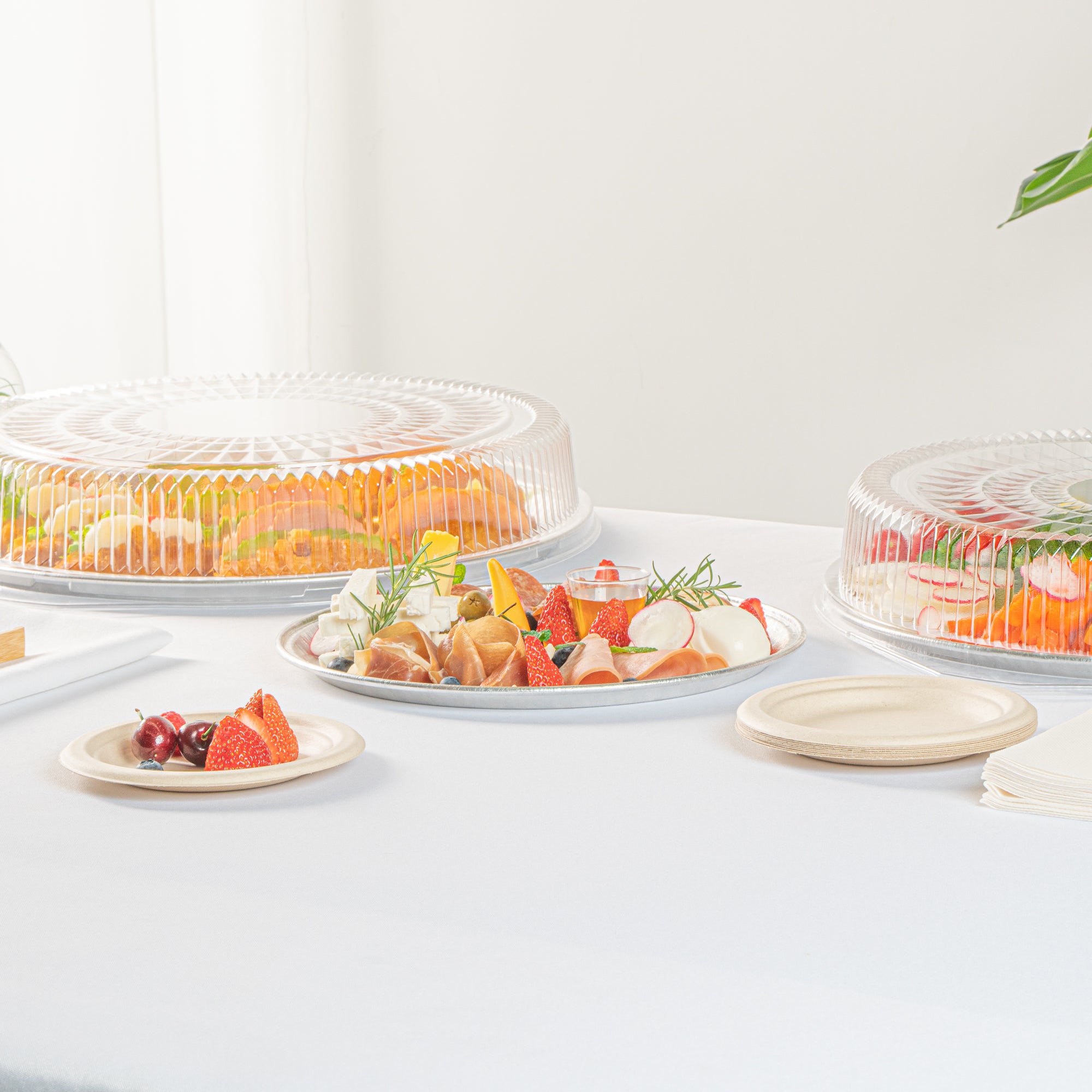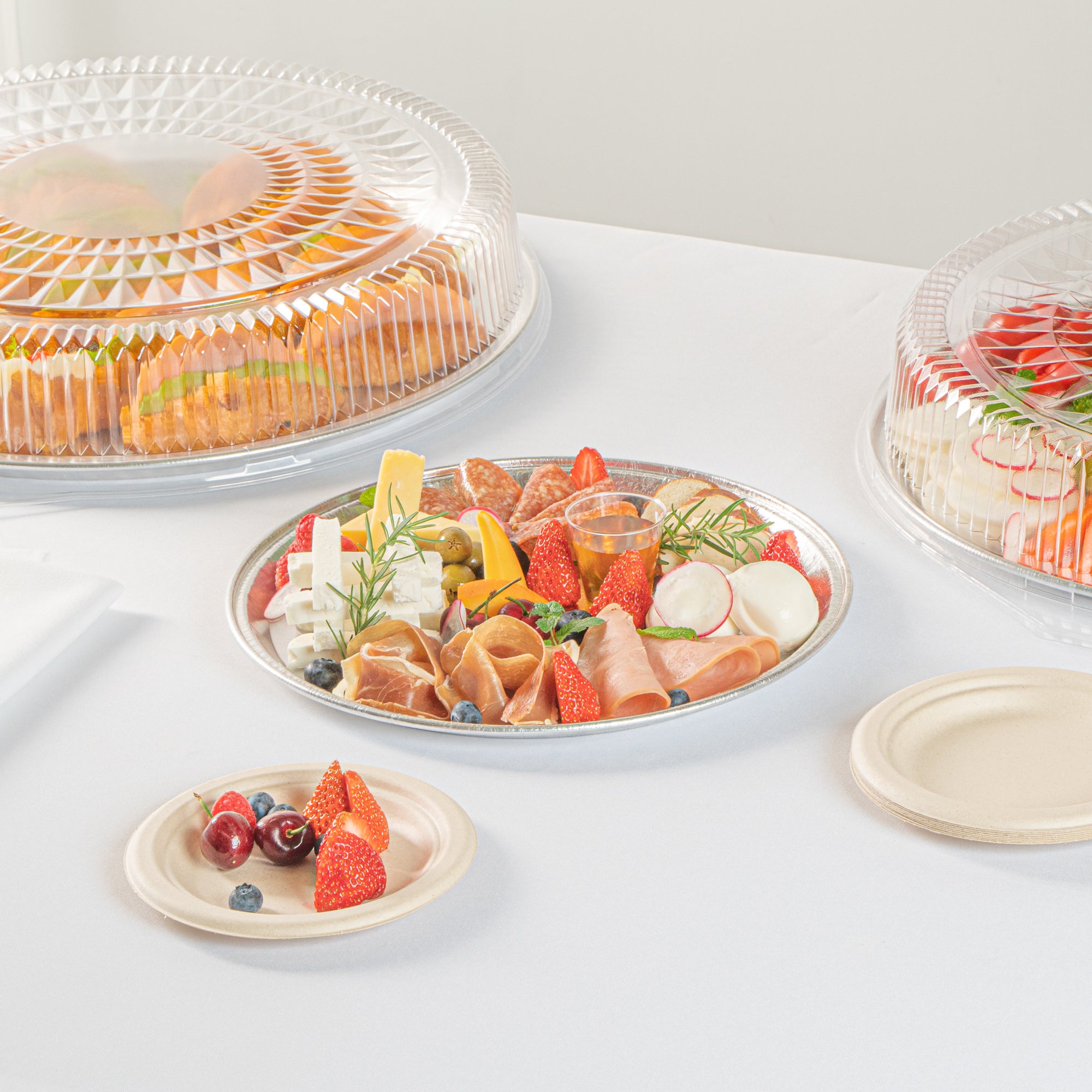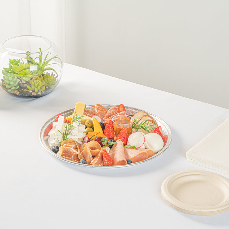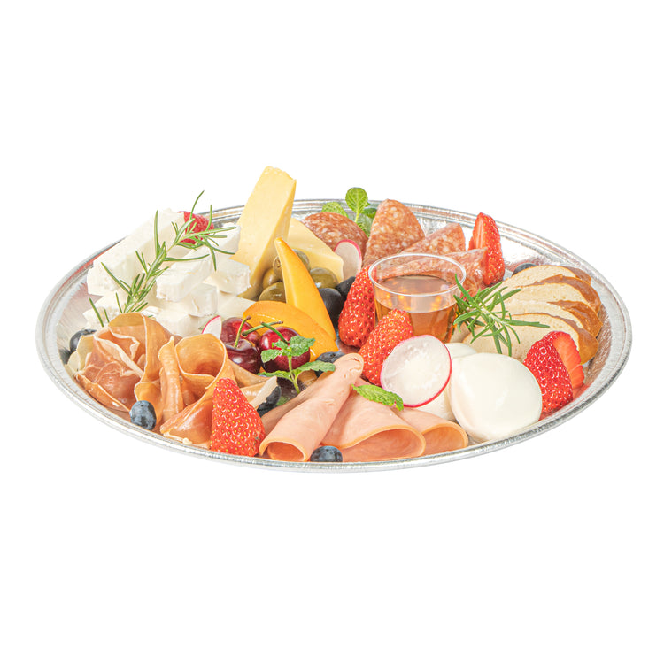 Ensure your pizzas stay fresh and delicious with our Foil Lux Freshness-Sealing Pizza Tray. This 12 inch pizza tray, crafted from durable aluminum, features a compatible lid that securely seals to maintain freshness during storage or transport, perfect for busy pizzerias and catering events. Its intricate engraved pattern not only elevates the presentation of your dishes but also makes each serving an irresistibly appealing centerpiece, making it ideal for round foil catering trays. The premium aluminum construction offers exceptional durability, capable of withstanding the demands of rigorous catering environments, and is recyclable and disposable, providing a sustainable and convenient solution for disposable serving platters. Enhance your foodservice's efficiency and presentation by integrating these trays into your operations today. Sold in a 10 count box.
