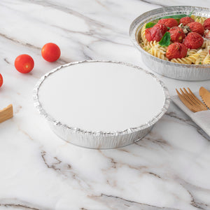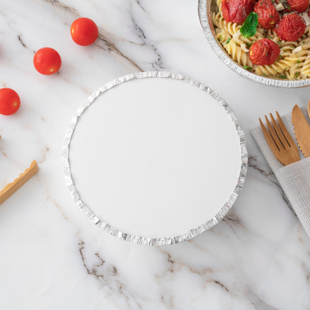 Deliver take out orders in a mess-free manner using our Foil Lux Round White Paper Flat Foil-Laminated Board Lids. These round foil pan lids are made to coordinate with our 24-ounce aluminum take out pans so you can easily package entrees, sides, and desserts for delivery. Crafted from foil-laminated cardboard, these foil bowls with lids feature an interior foil lining that retains heat to keep foods at the perfect temperature before serving. Ideal for easy identification, these foil food containers with lids have a white finish that allows you to label containers or place a sticker on the surface. These round foil pan lids are disposable for easy cleanup. Each foil bowl lid measures 7 inches in diameter. Sold in a 100 count box. Matching take out pans available and sold separately.