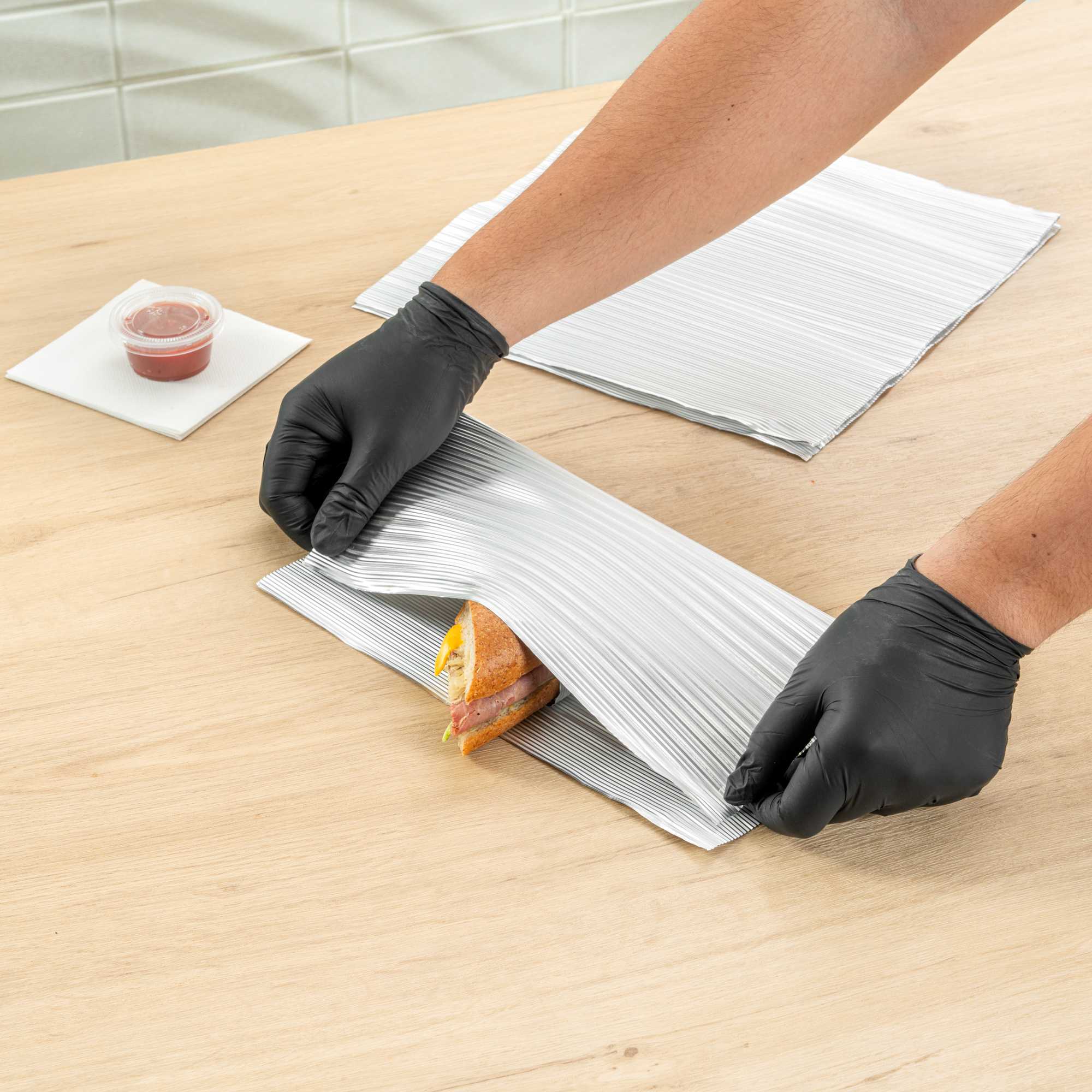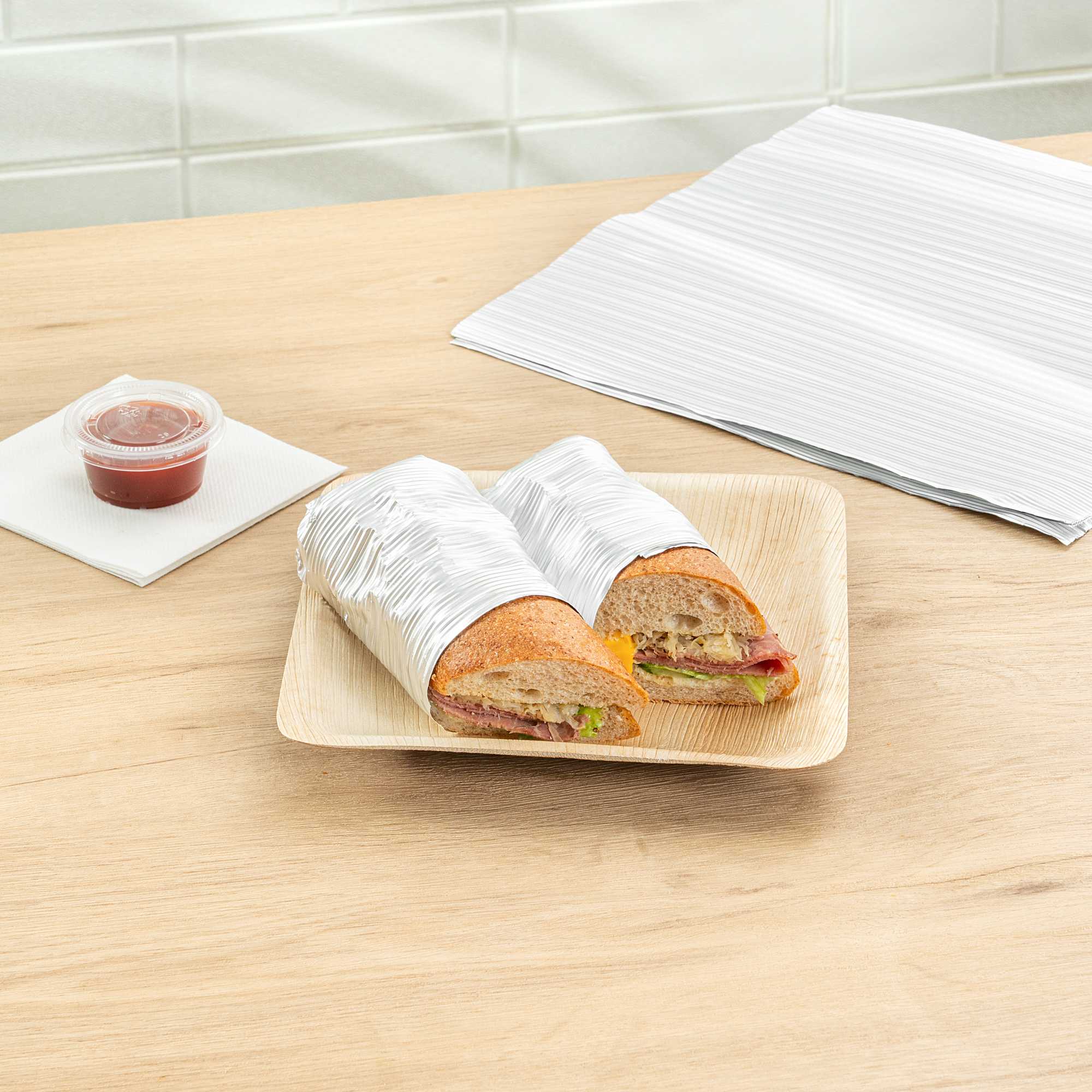 Lock in heat and preserve flavor with our Foil Lux Silver Ripple Aluminum Wrap and Basket Liners. Constructed from micro-rippled aluminum, these insulated foil sandwich wrap sheets are specifically designed to keep your prepared foods enjoyably warm. Their sturdy, grease-resistant aluminum construction ensures hassle-free and mess-free service, while their classic silver finish effortlessly enhances your presentation. Featuring an innovative multi-use design, these rippled foil sheets can be used as either heat-insulating sandwich wraps or greaseproof basket liners. Measuring 12 inches wide by 12 inches long, these aluminum foil papers are the perfect size for wrapping sandwiches, subs, hamburgers, gyros, and other deli or bakery selections. Sold in a 500 count box.