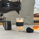 Prevent spills on the go with a secure, stylish solution. The Forma Spill-Resistant Glass Travel Mug combines a sleek design with functional features, making it an essential glass travel mug for coffee shops and cafés. Its double-wall borosilicate glass construction provides superior insulation, maintaining the temperature of hot and cold beverages longer, transforming it into a reliable double wall glass tumbler for baristas. The black silicone sleeve offers a comfortable grip, reducing the risk of slips and burns, while the secure silicone lid ensures your drink stays put, especially during transport. This insulated glass tumbler has a robust 12-ounce capacity, perfect for standard servings, and is designed to withstand daily use, thanks to its break-resistant glass, making it ideal for eco-conscious establishments seeking reusable drinkware. Each order includes 1 Forma Spill-Resistant Glass Travel Mug.