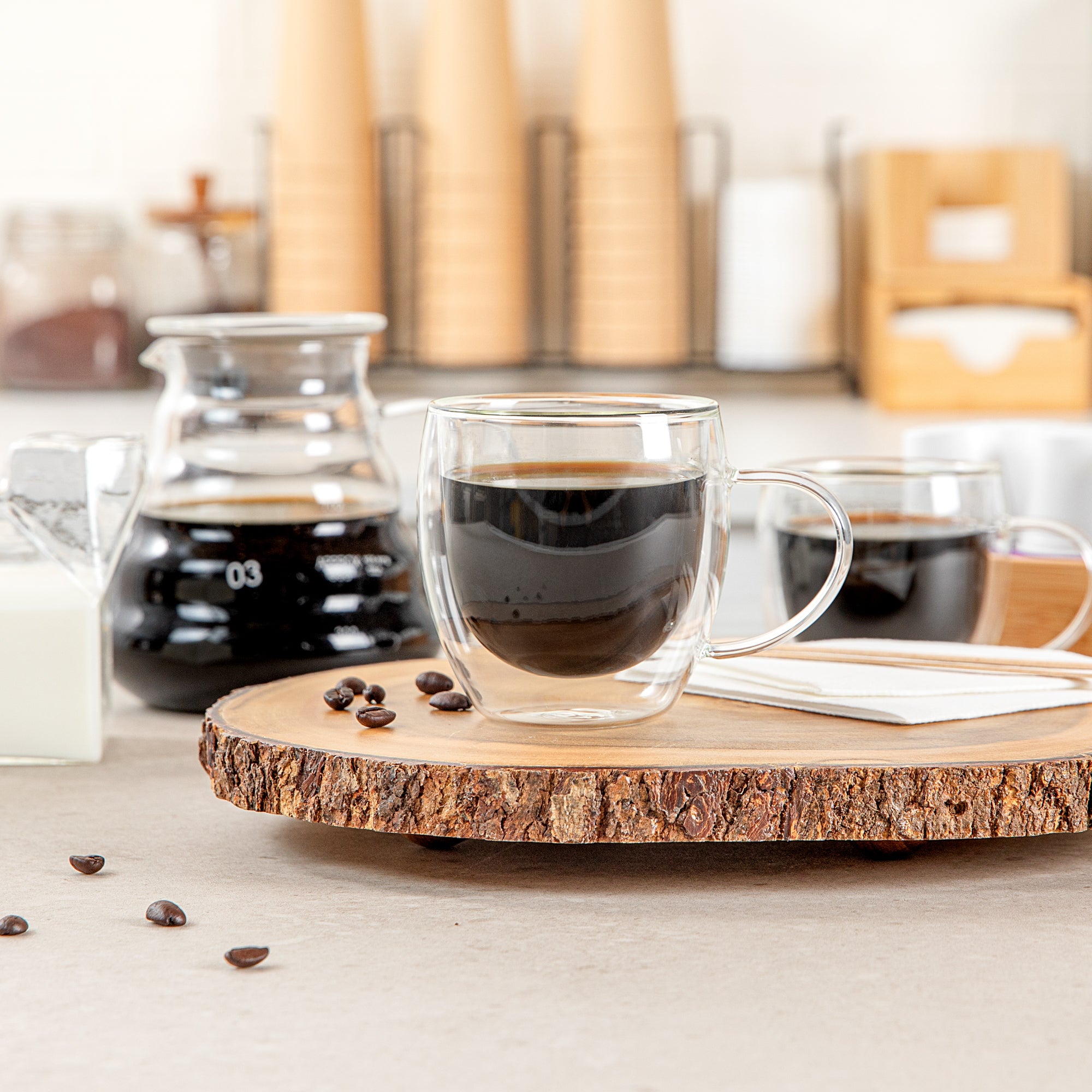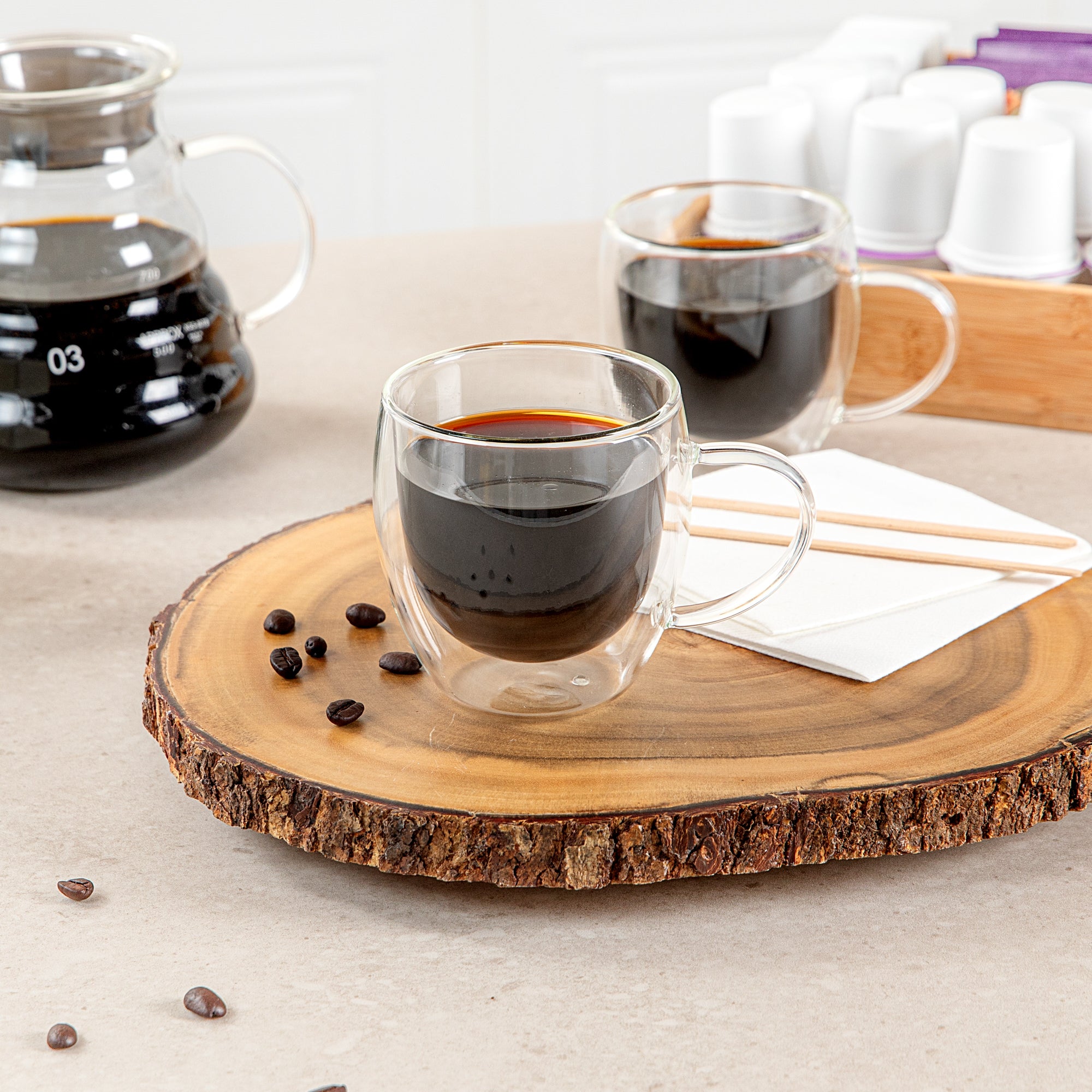 Experience coffee in a whole new light with our Forma Professional 8-ounce Glass Coffee Cups. Made from scratch and break-resistant borosilicate glass, these coffee glasses offer durability and style for your beverage service. These double-wall glass coffee cups provide insulation, ensuring that your drinks stay hot or cold longer without the exterior becoming uncomfortable to the touch. These borosilicate coffee cups also have the unique ability to withstand temperatures up to 350F, making them oven and microwave-safe. Dishwasher-safe and freezer-safe, these clear coffee cups offer ultimate convenience for both preparation and cleaning. With a handle for ease of use, these glass coffee cups have a handle design that is a standout feature that ensures comfort and safety while handling hot beverages. Serving up to 8 ounces of your favorite brew, these coffee glasses measure 3 inches in diameter by 3.5 inches in height, making them the perfect size for a satisfying cup of coffee. Sold in a 2 count box.